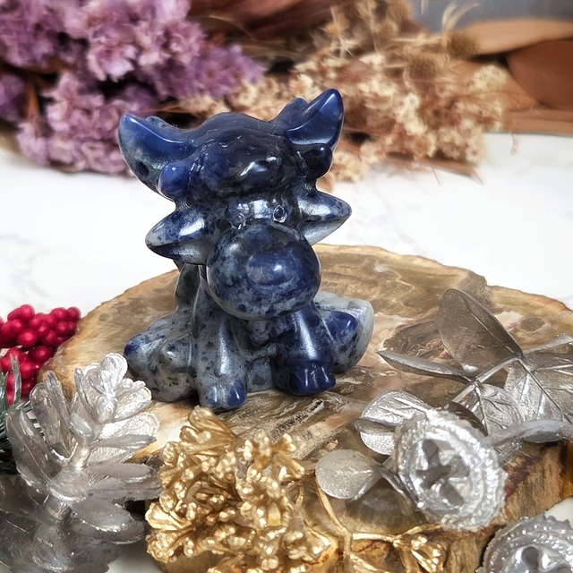 動画をご覧ください。 https://www.instagram.com/reel/DLe2b3ByjAd/?igsh=MTl5Z2tpY2IzMG10Yg== 静かなディープブルーが美しいソーダライトのドラゴンヘッドです。 ⧉サイズ 約 34mm×63mm×35mm 重量 81g ※天然石は自然が作り出した鉱物であるため、微細の傷、内包物、クラックなどが見られることがあります。結晶ができあがる過程で自然に生じた美しい天然石の証であり、魅力でもあります。ぜひお楽しみください。