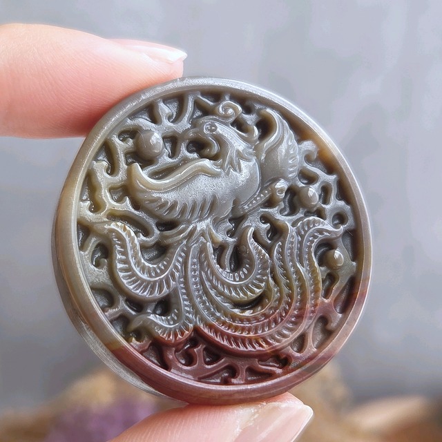 動画をご覧ください。 https://www.instagram.com/reel/DRbeeDtEvCo/?igsh=OWdsZnczdHg1ajg4 中華風のデザインが素敵な鳳凰のメダルです。 ⧉サイズ 直径 約40mm 厚み 約10mm 重量 29g ※天然石は自然が作り出した鉱物であるため、微細の傷、内包物、クラックなどが見られることがあります。結晶ができあがる過程で自然に生じた美しい天然石の証であり、魅力でもあります。ぜひお楽しみください。
