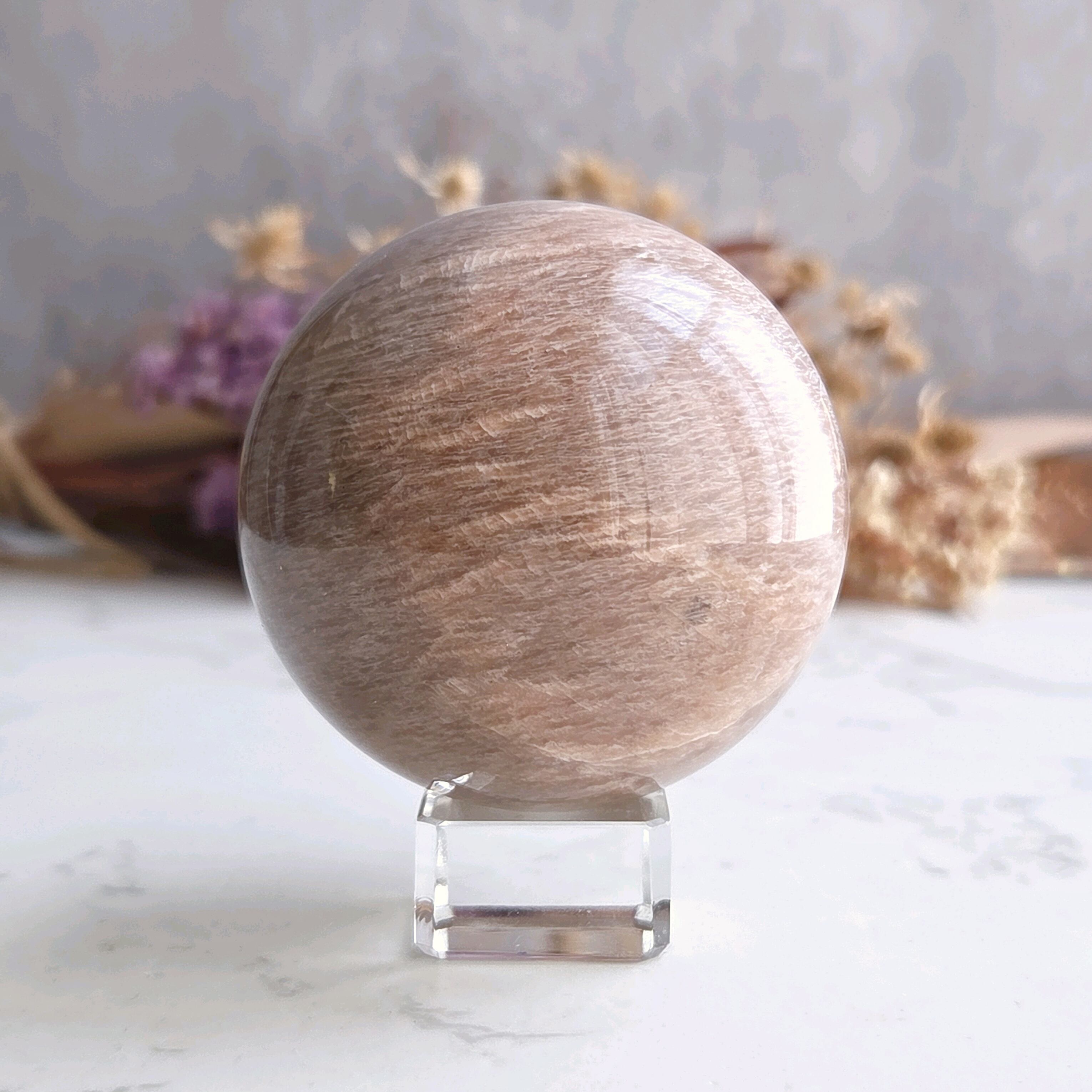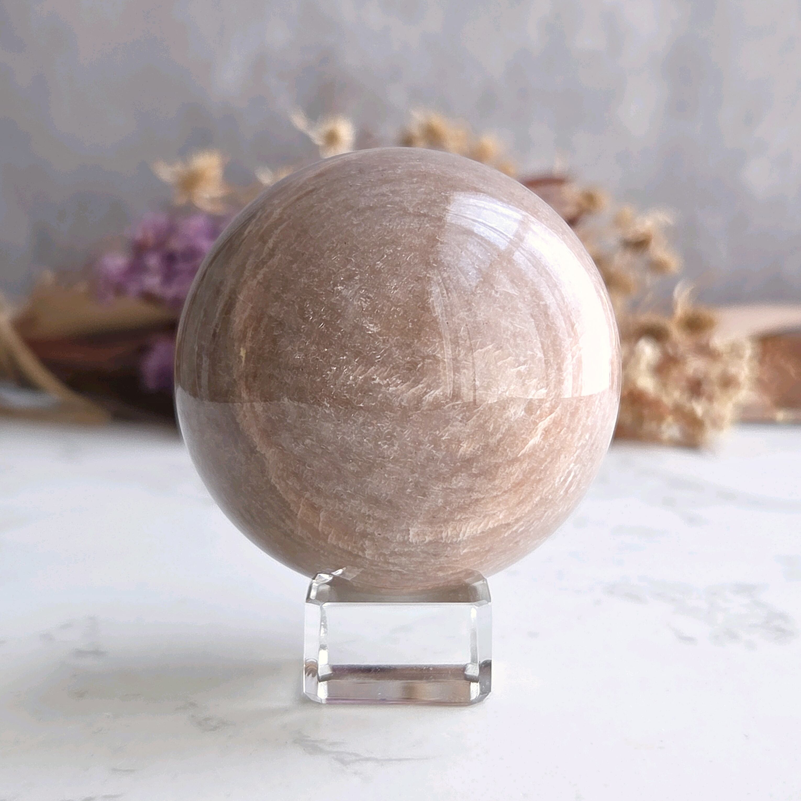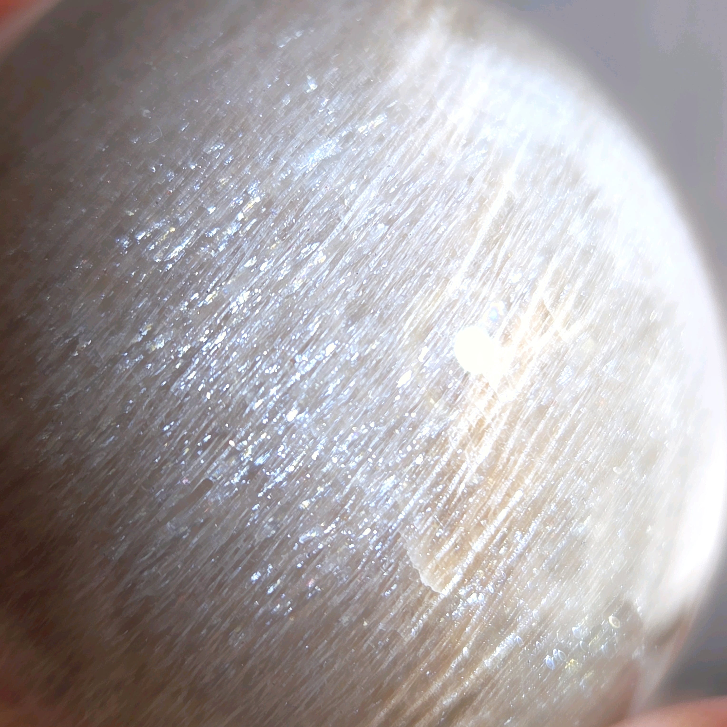 淡く柔らかなベージュカラーと静かな輝きを放つシルバーシラーが美しい高品質ムーンストーンのスフィアです。