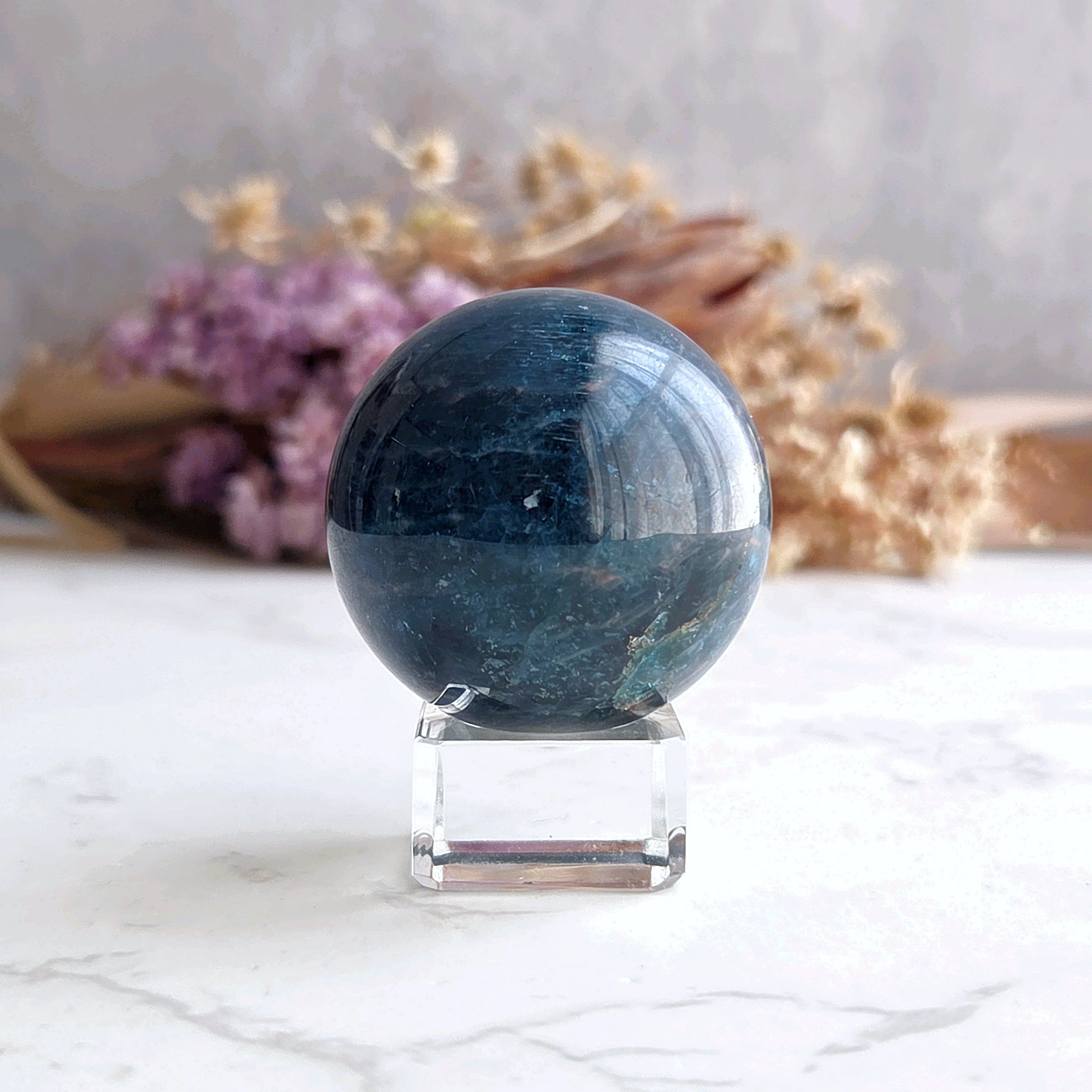 深海や宇宙を思わせるディープブルーにキラキラのシラーが映える素敵なアパタイトのスフィアです。