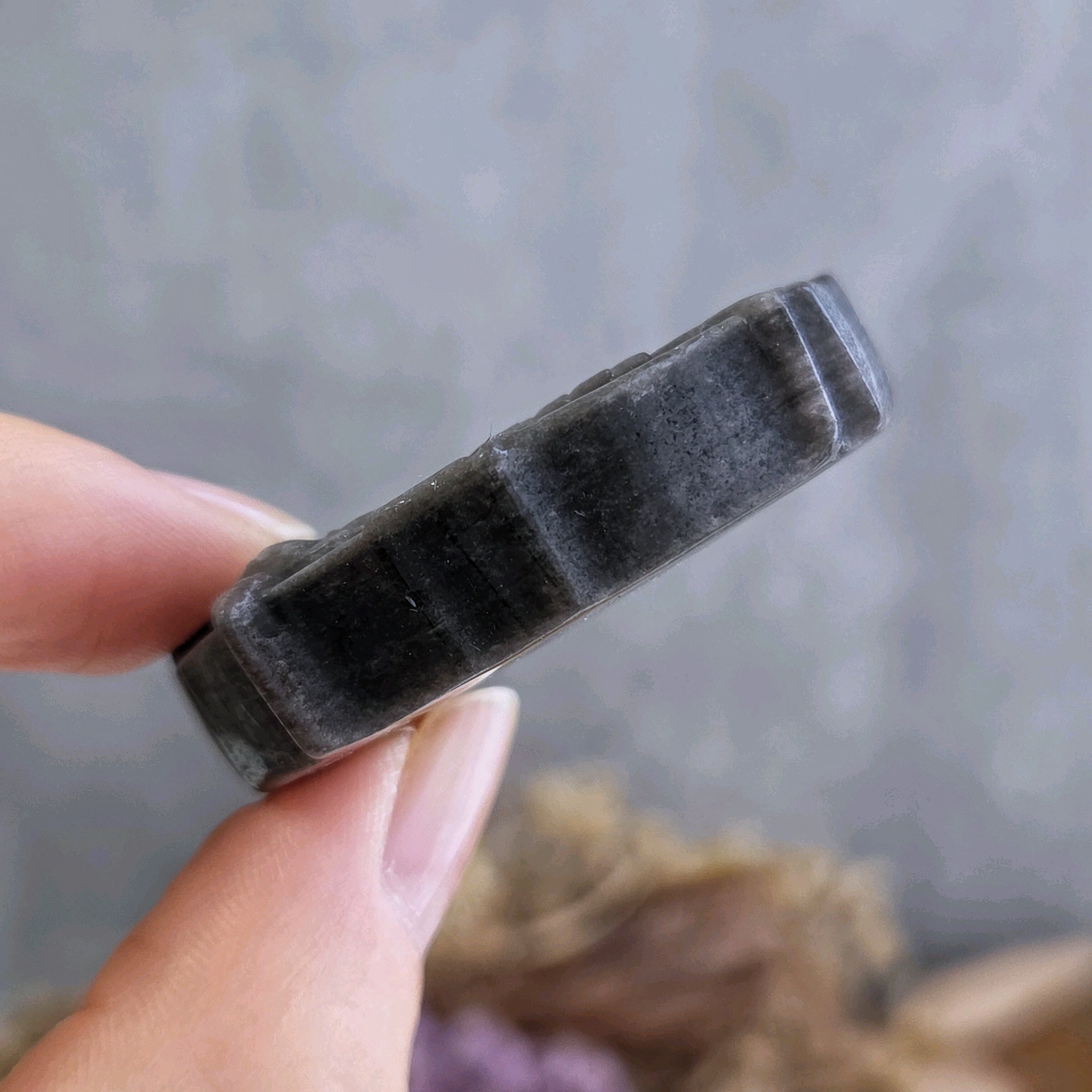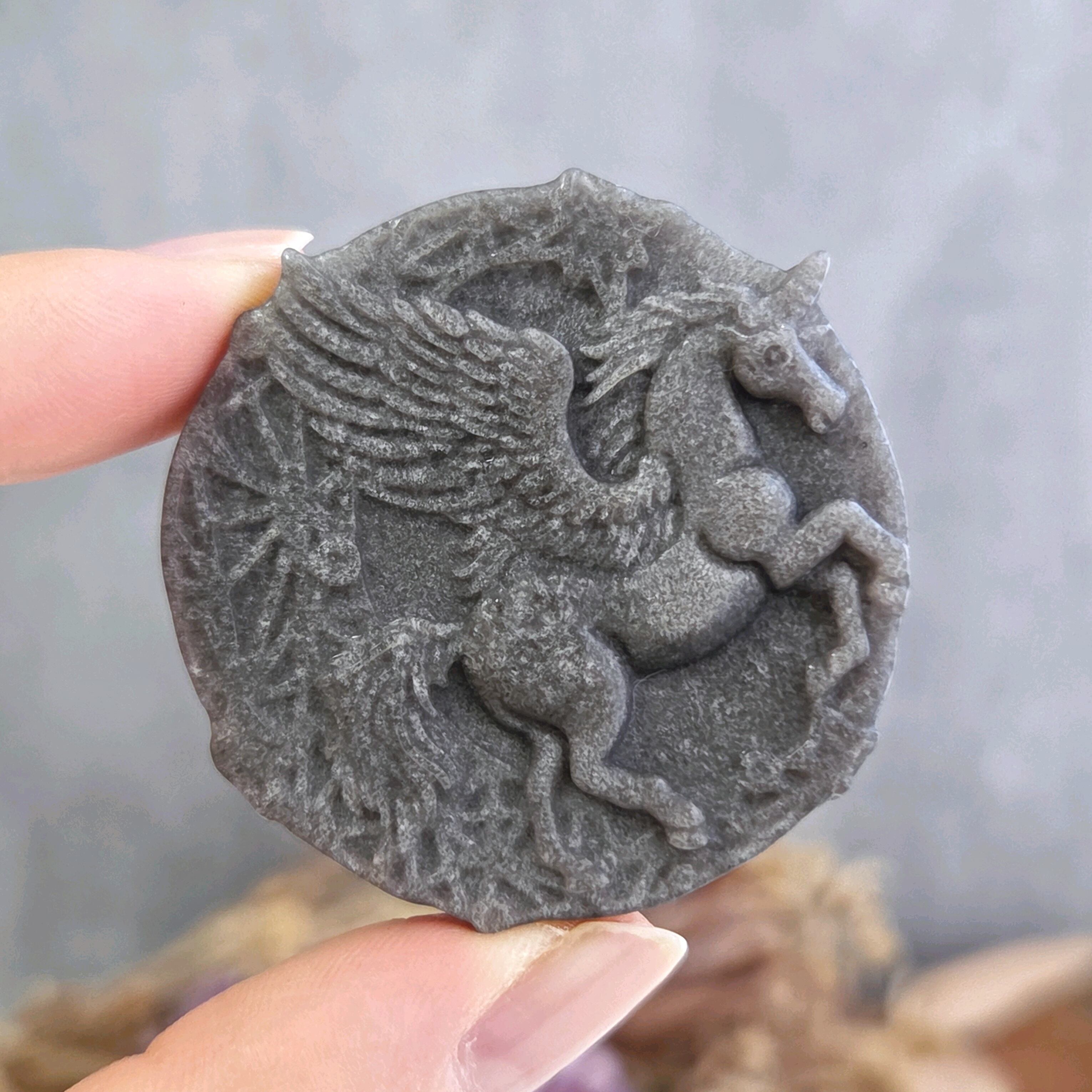 羽ばたくユニサスが描かれたメダル型のシルバーオブシディアンです。