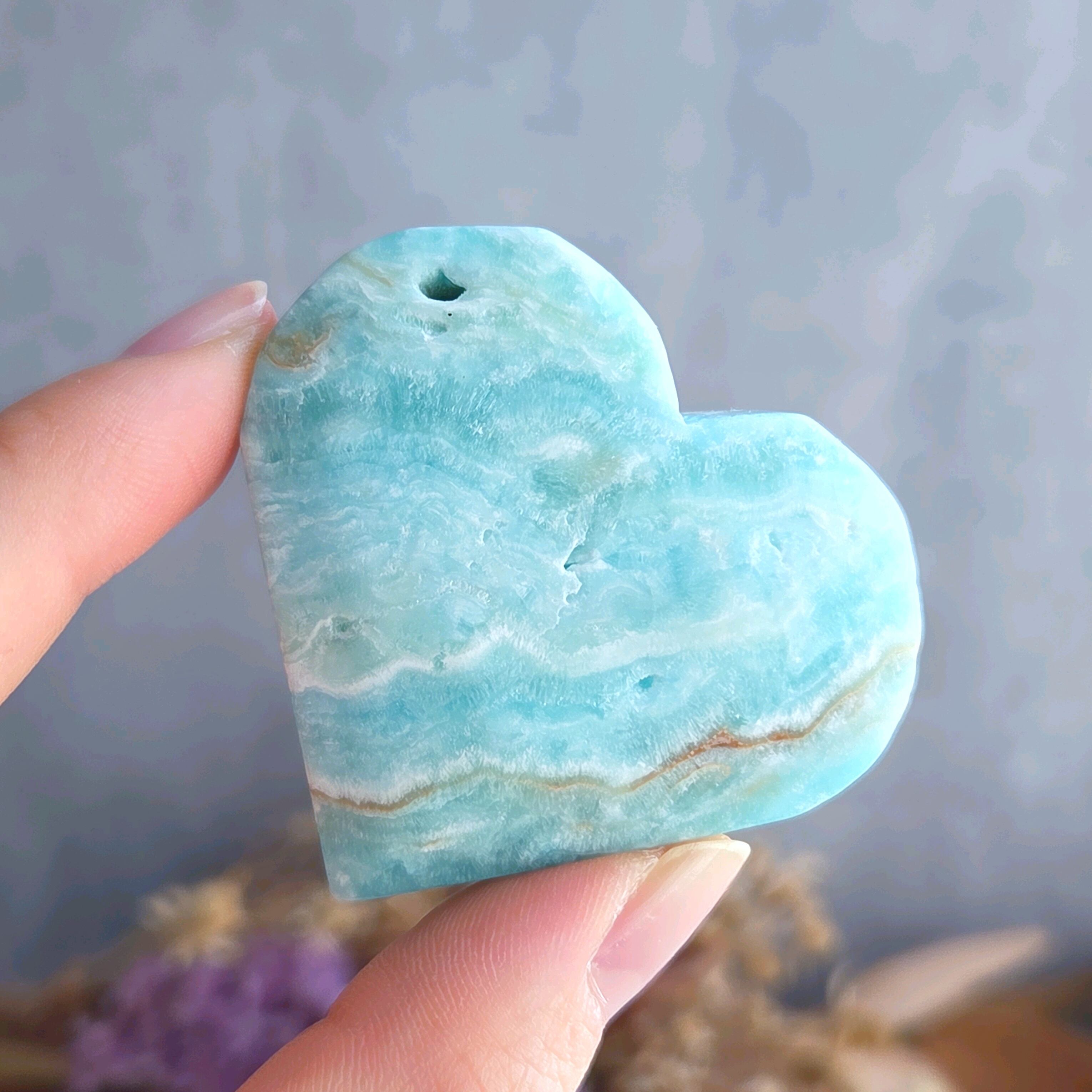 青空のような爽やかなブルーが素敵なアラゴナイトのハートです。