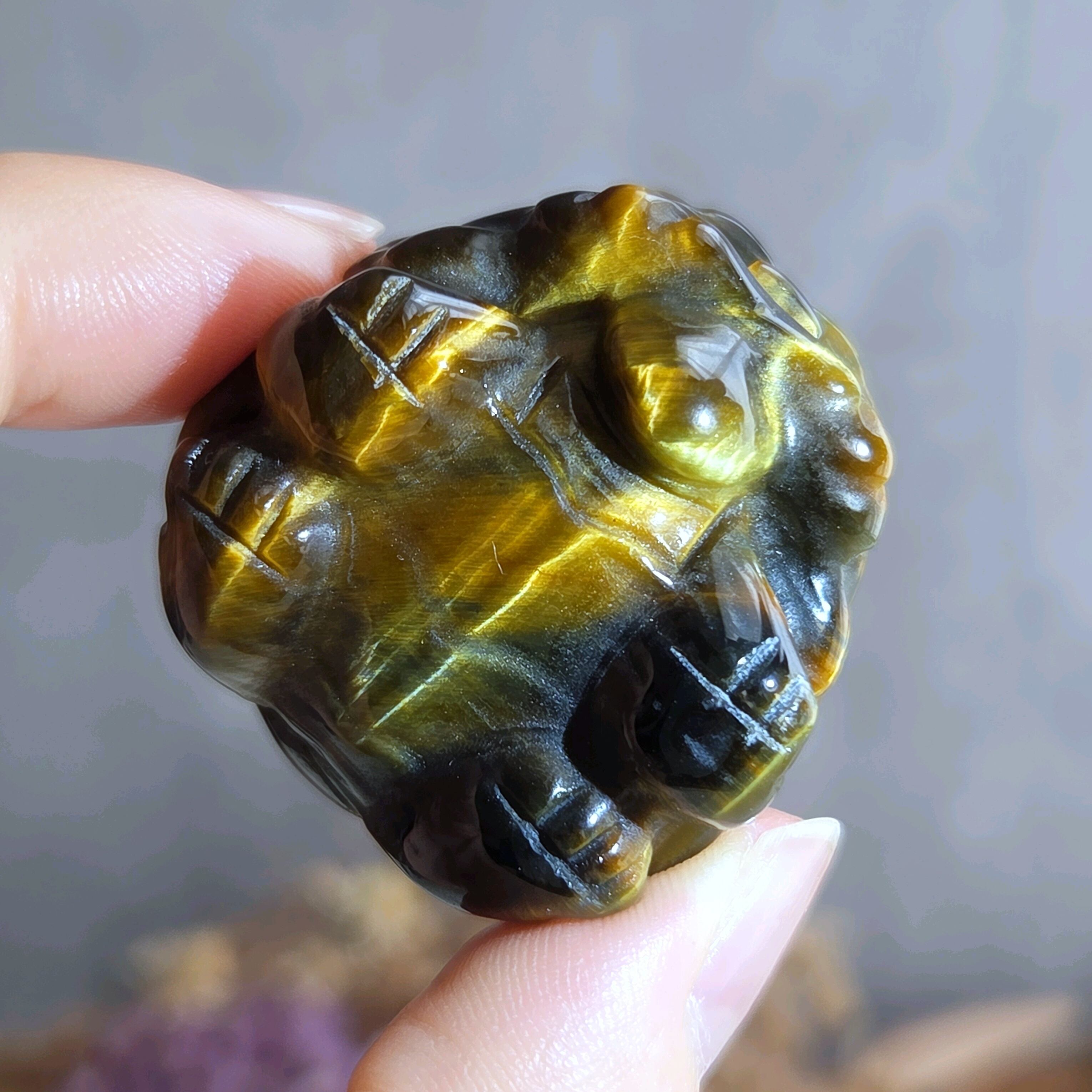 少し青みを帯びたようにも見える稲光のようなくっきりしたシラーが美しいタイガーアイのロングイです。ポリッシュも良く、石目などもない高品質なタイガーアイです。