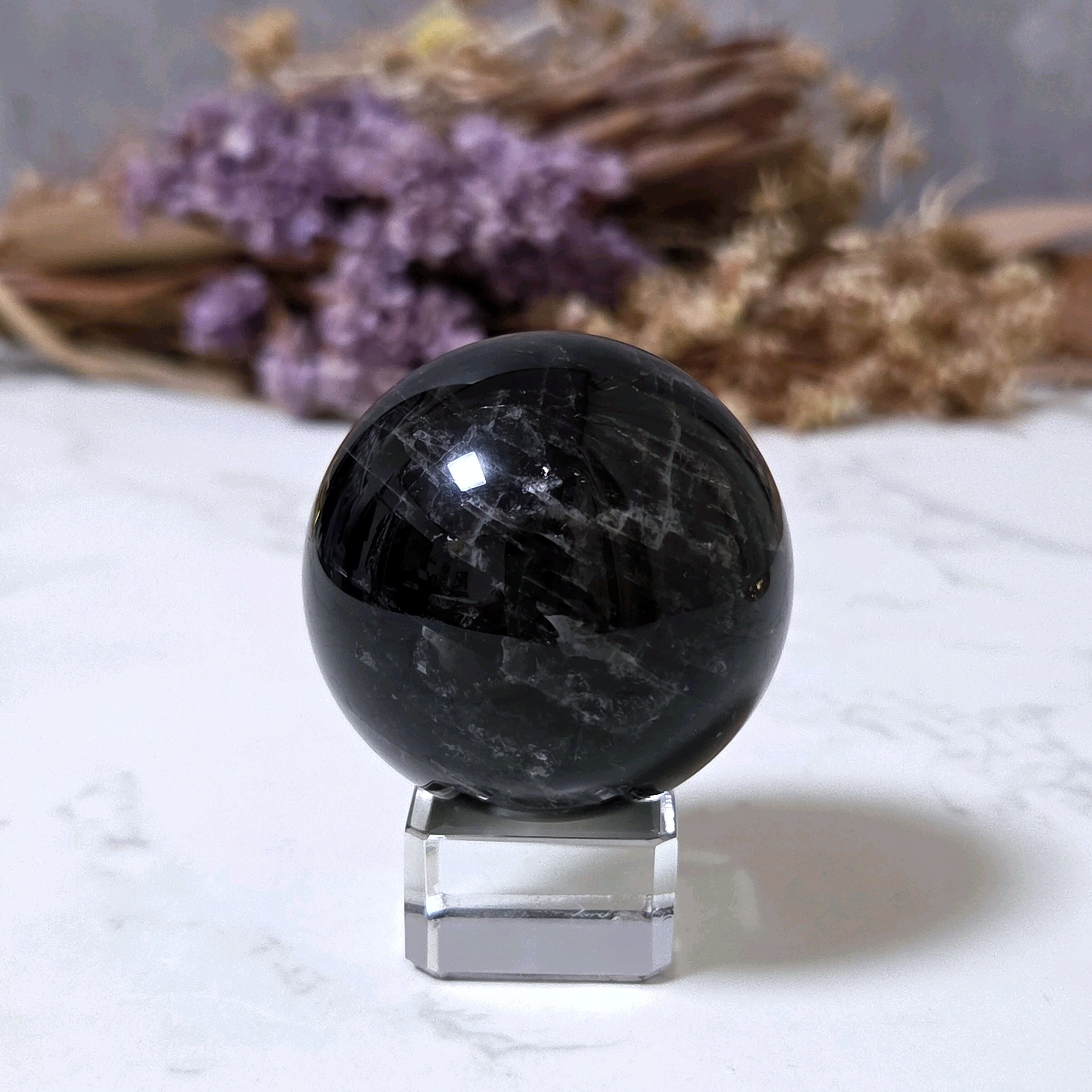 強いライトを当てると6条のスターが見られるモリオンのスフィアです。内部クラック部分は虹もキラキラして綺麗です(*^^*)