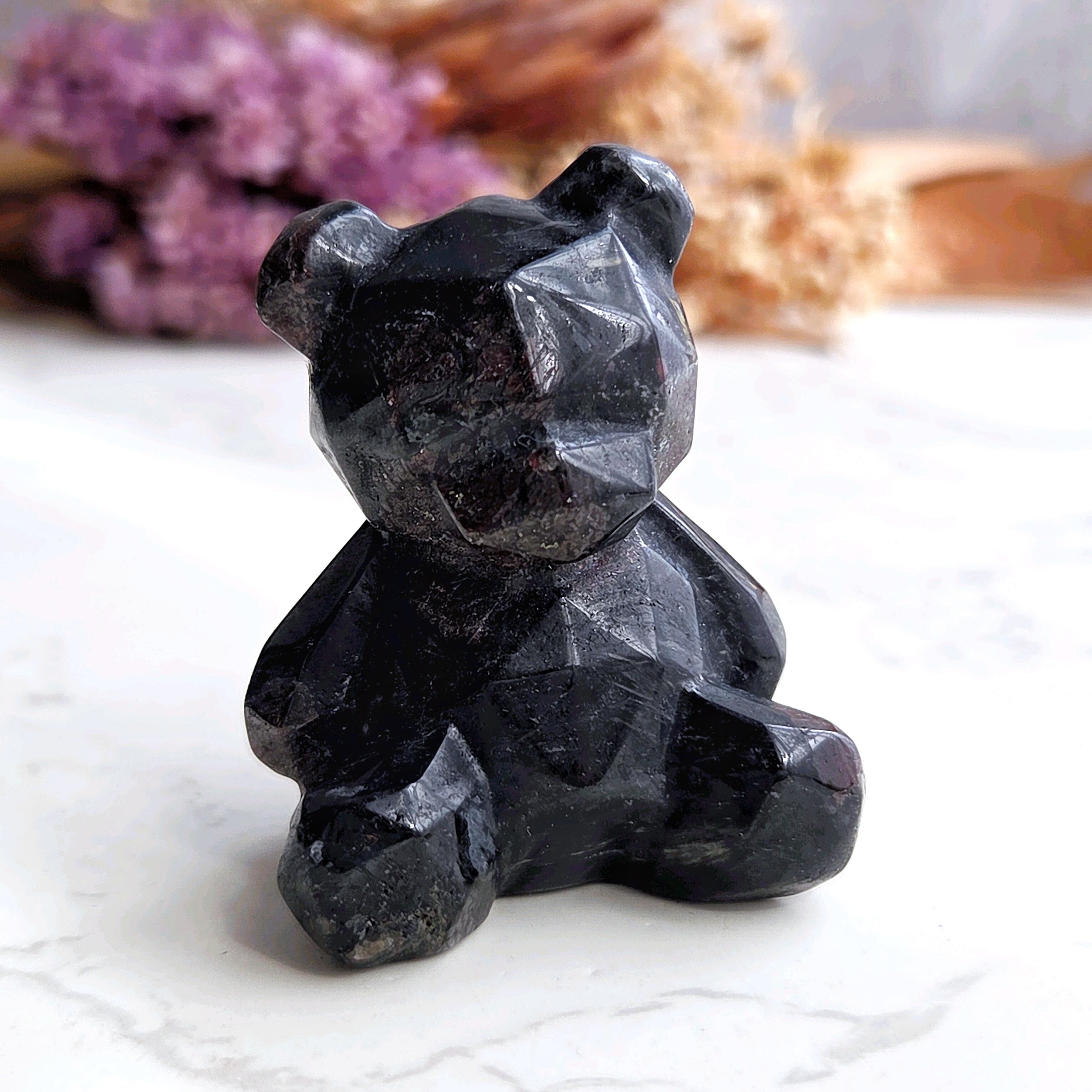 ちょこんとおすわりしたポリゴン風のくまちゃんです♡ライトを当てると共生するヌーマイトの結晶がキラキラします。