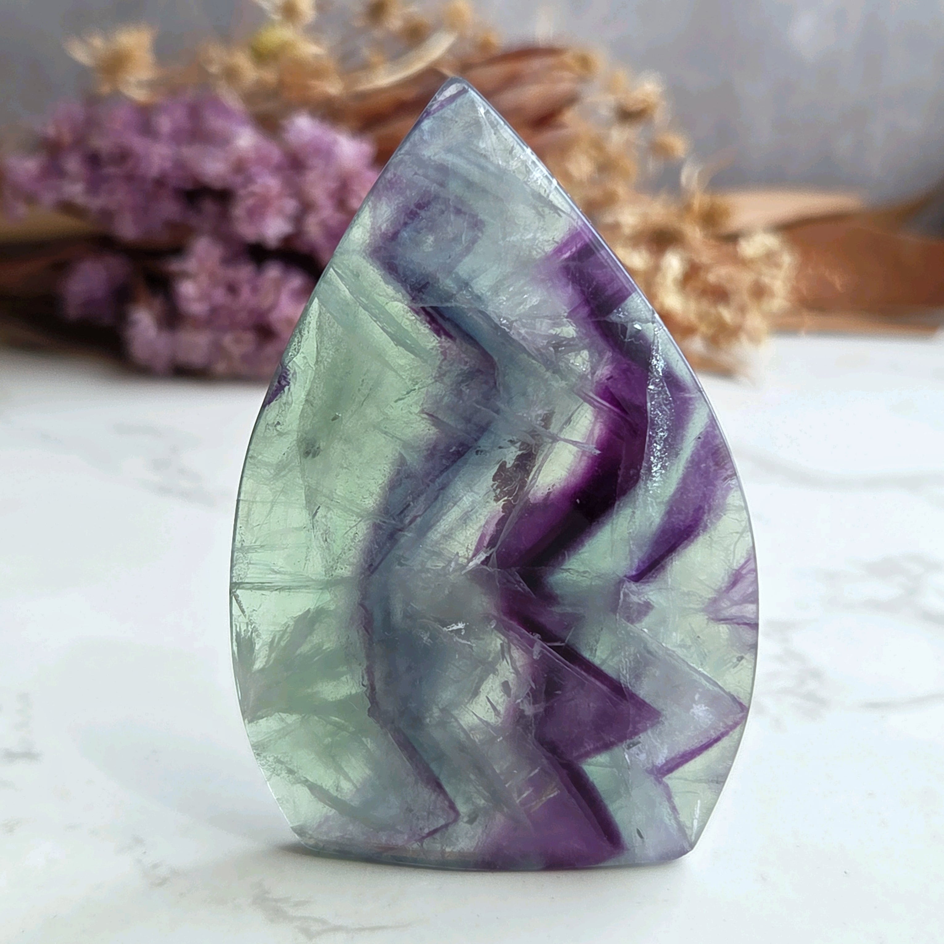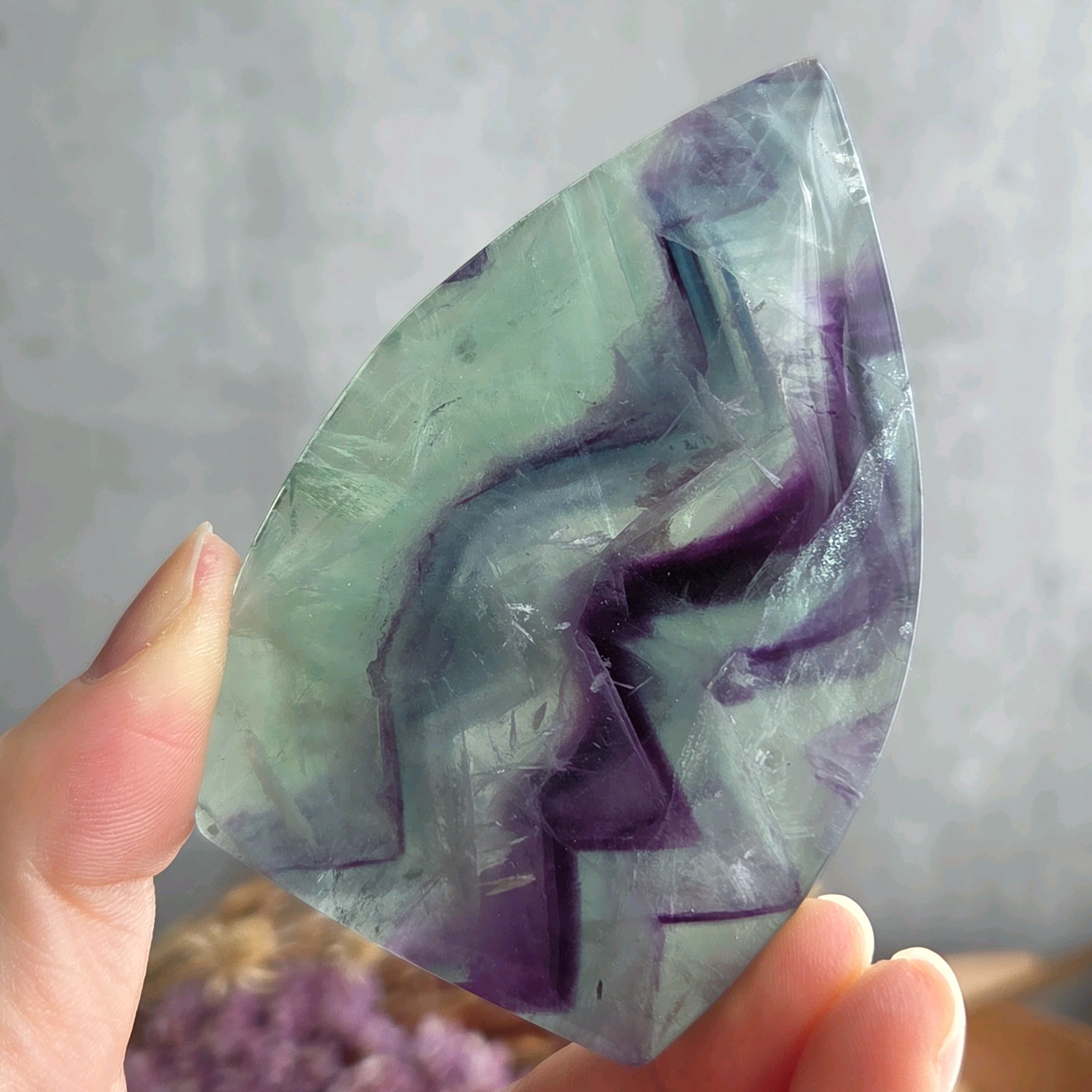 透明感の良いグリーン×パープルのフェザーフローライトです。ギザギザ模様や繊細なフェザー、虹も見られます(*^^*)