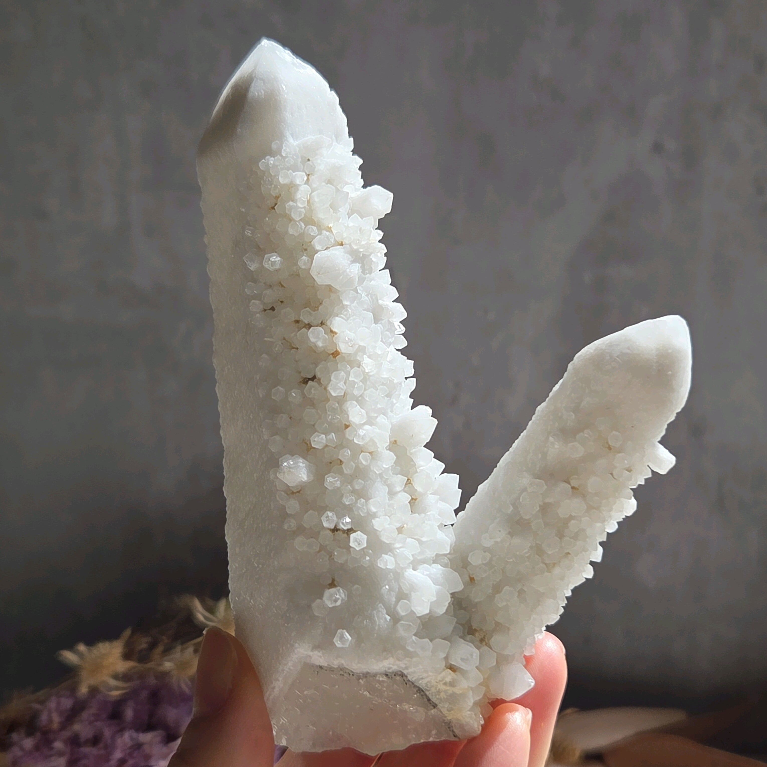 内モンゴル産の素晴らしいキャンドルクォーツです。根本を見ると中は透明度の高い水晶であることがうかがえます。表面はなめらかな純白の輝きを放ち、小さな結晶の一粒一粒も大変美しいです。