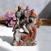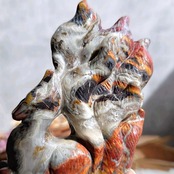 中国の希少なアゲート品種のひとつ。赤、黄色、紫、灰色などの鮮やかな色彩が層状に混ざり合い、炎のような力強い模様を持つのが特徴です。