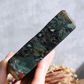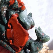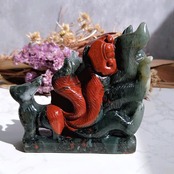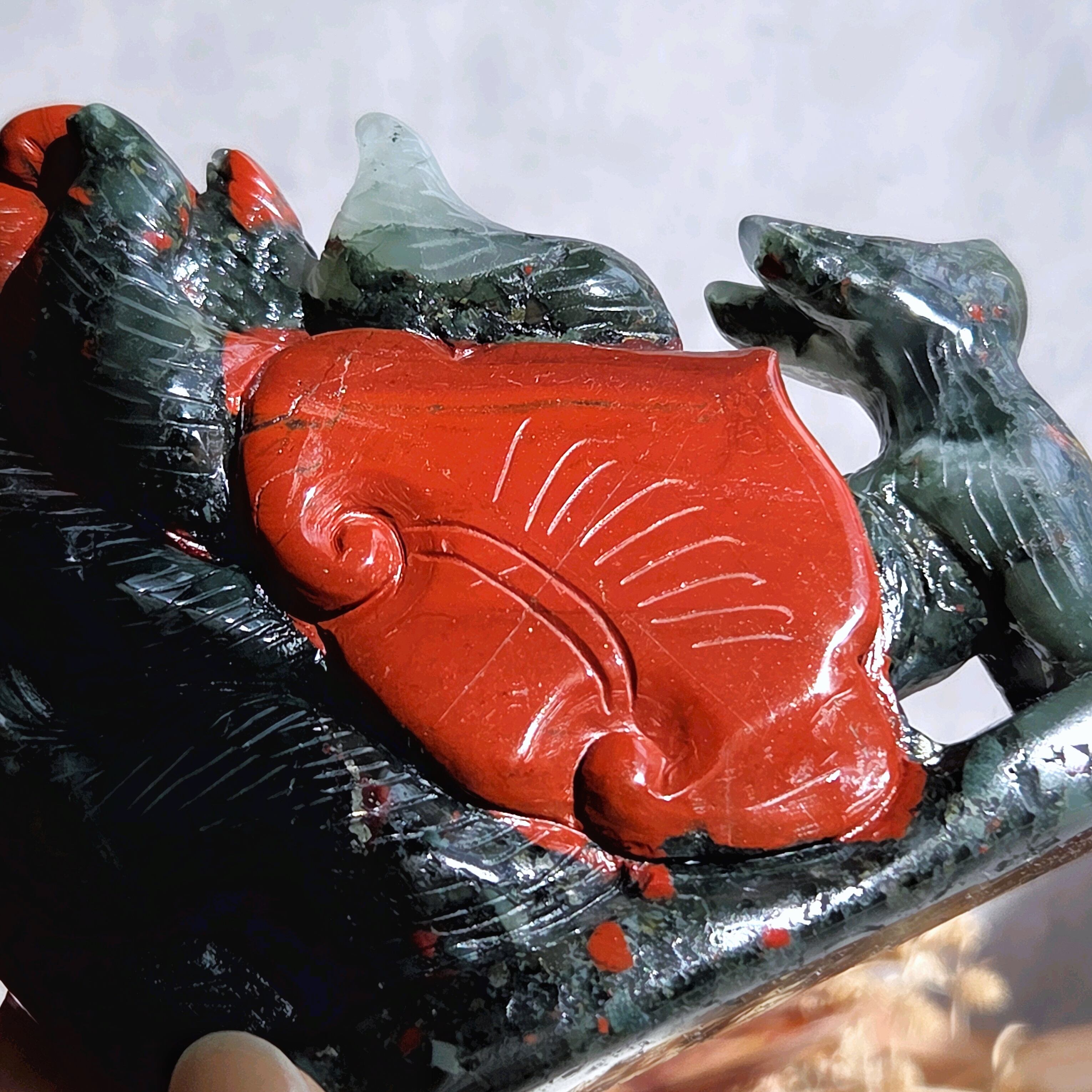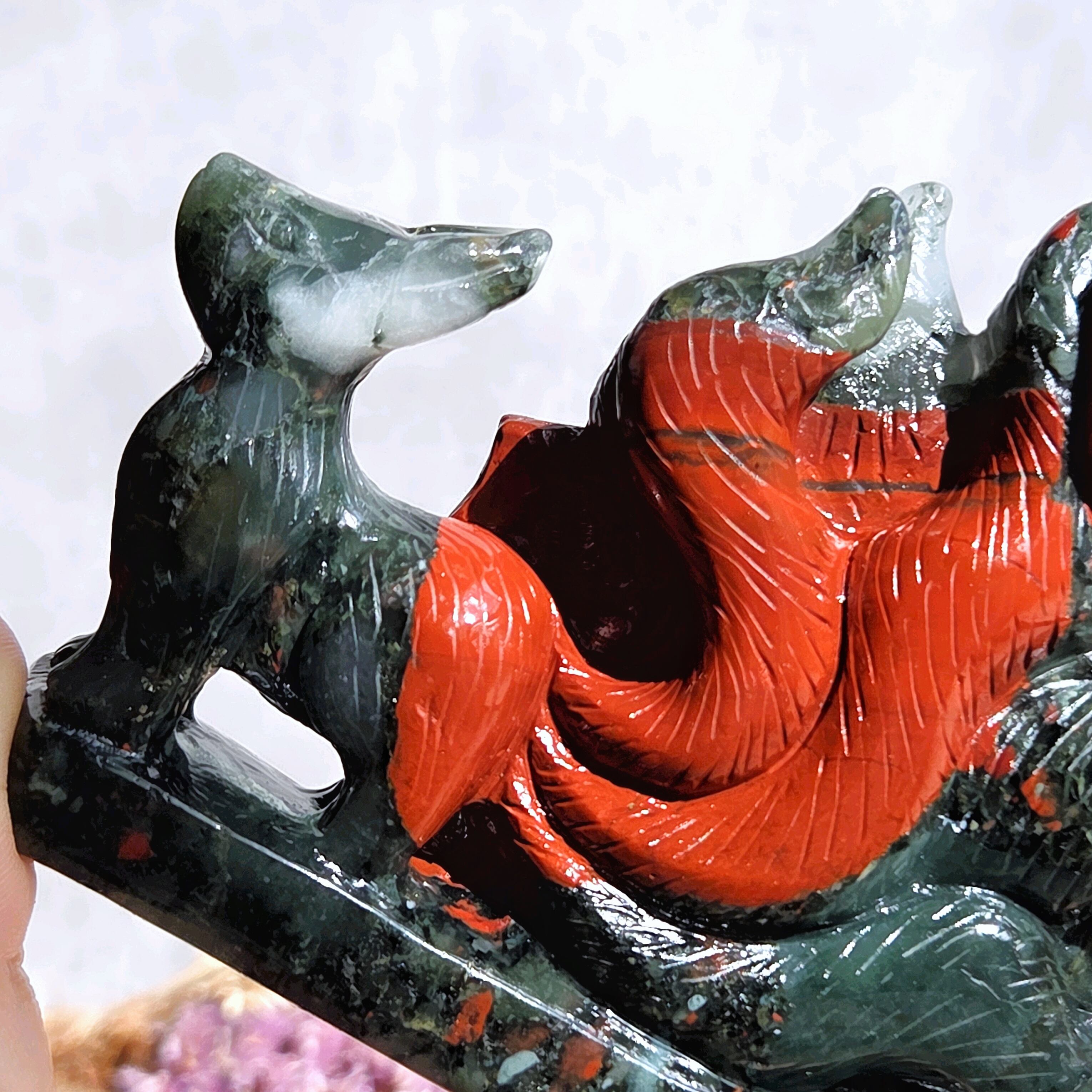 大胆に入ったレッドが美しいブラッドストーンの九尾です。グリーン×レッドのコントラストもハッキリしていて原石のクオリティの良さが分かるカービングです。