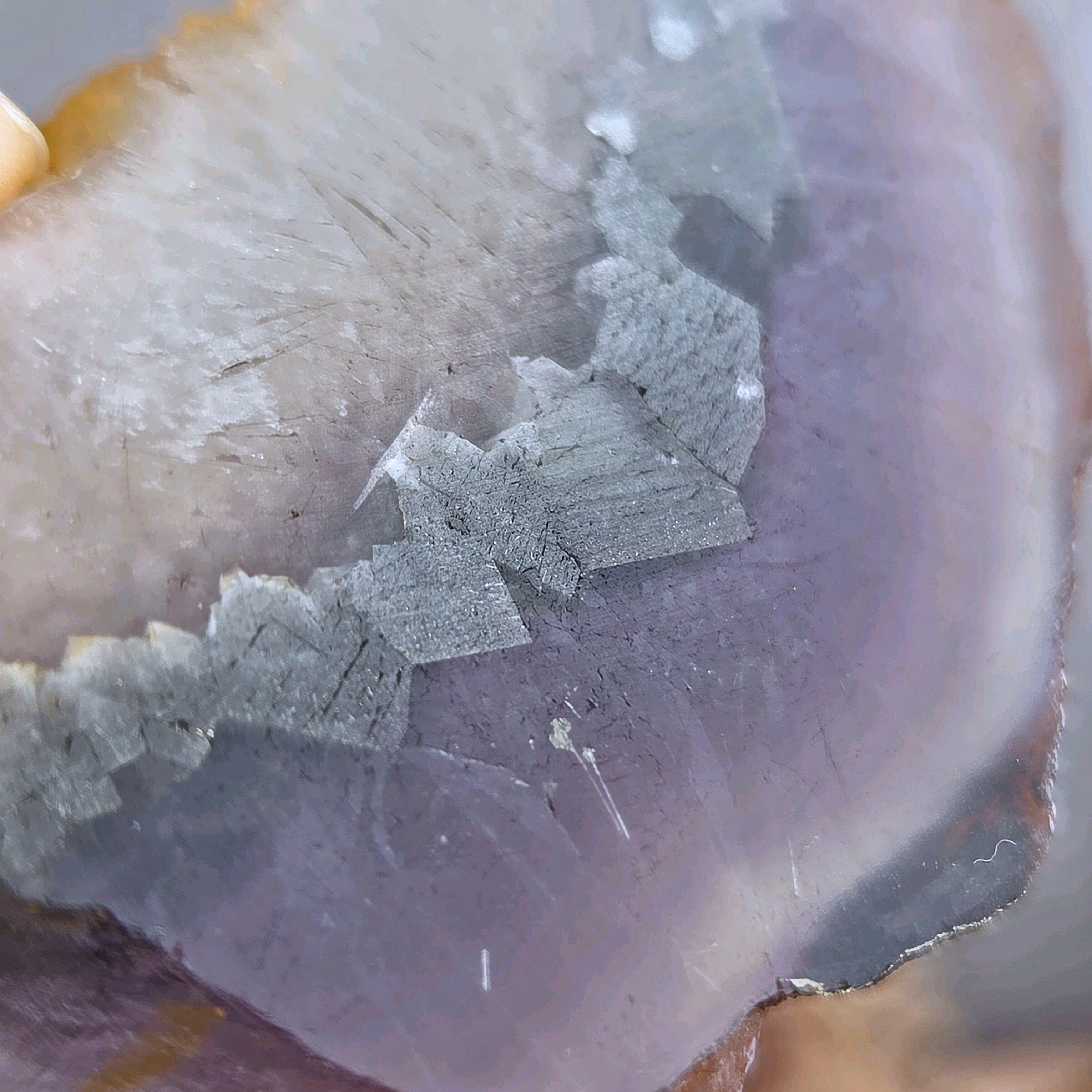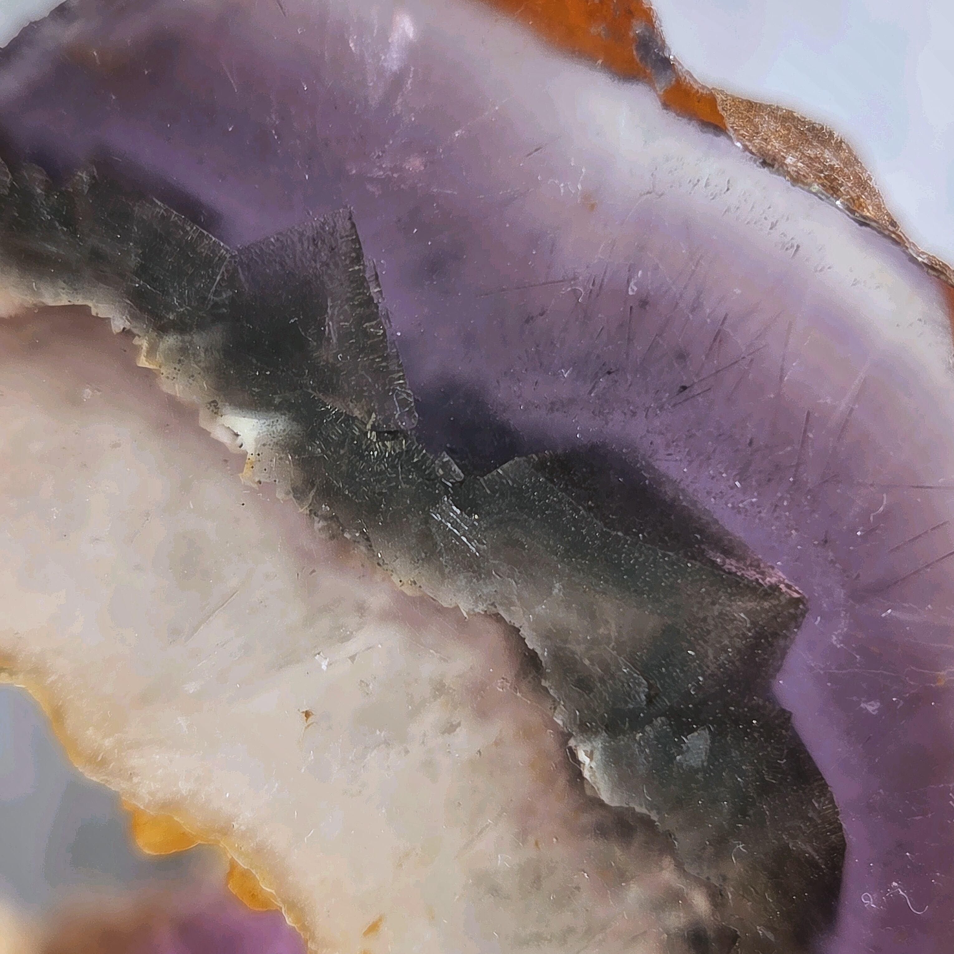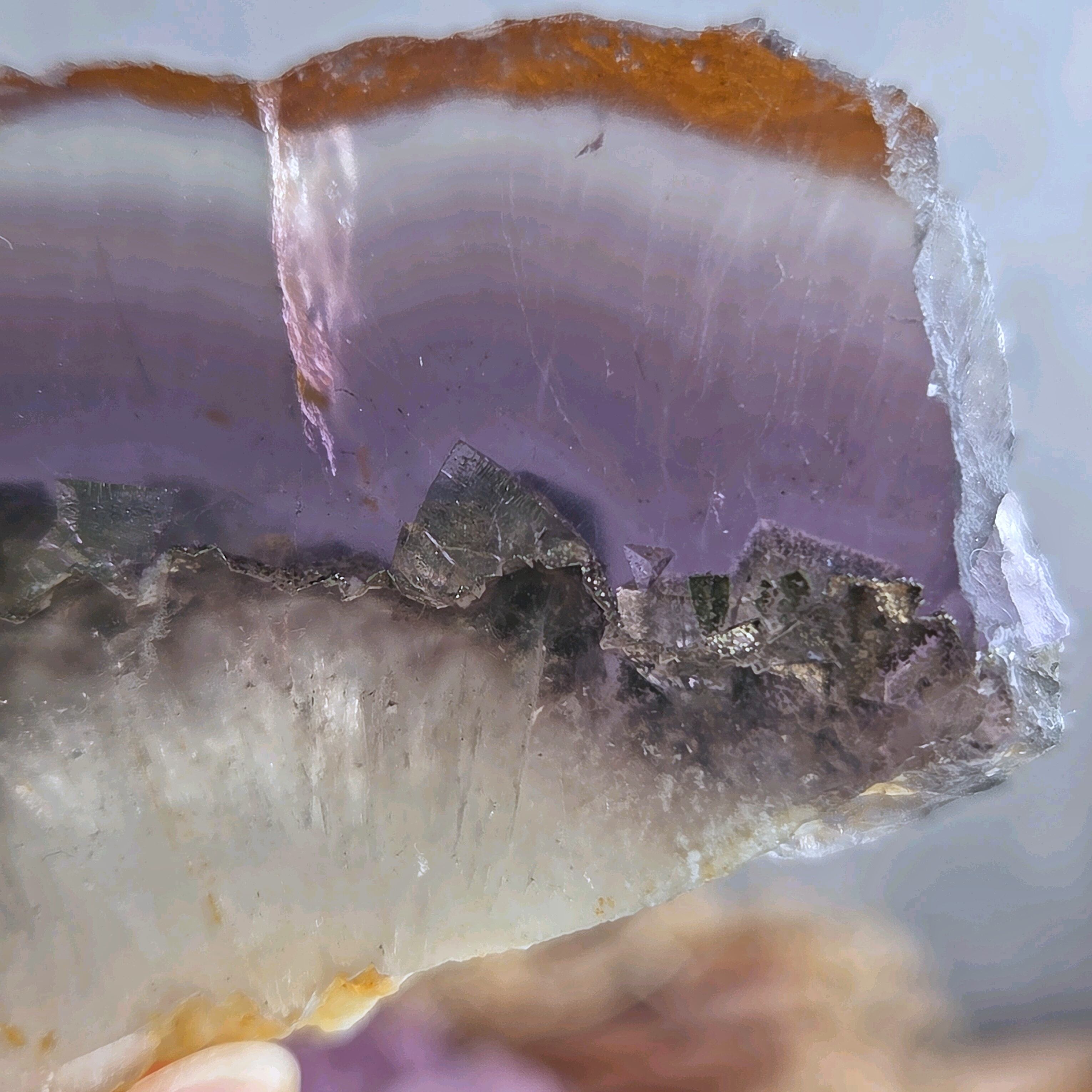 パープルの層には透明感があり針状の内包物が見られます。そしてパイライトキューブの層を挟んでフェザーのような柔らかな雰囲気の乳白色の層へと…とても美しい構造です。