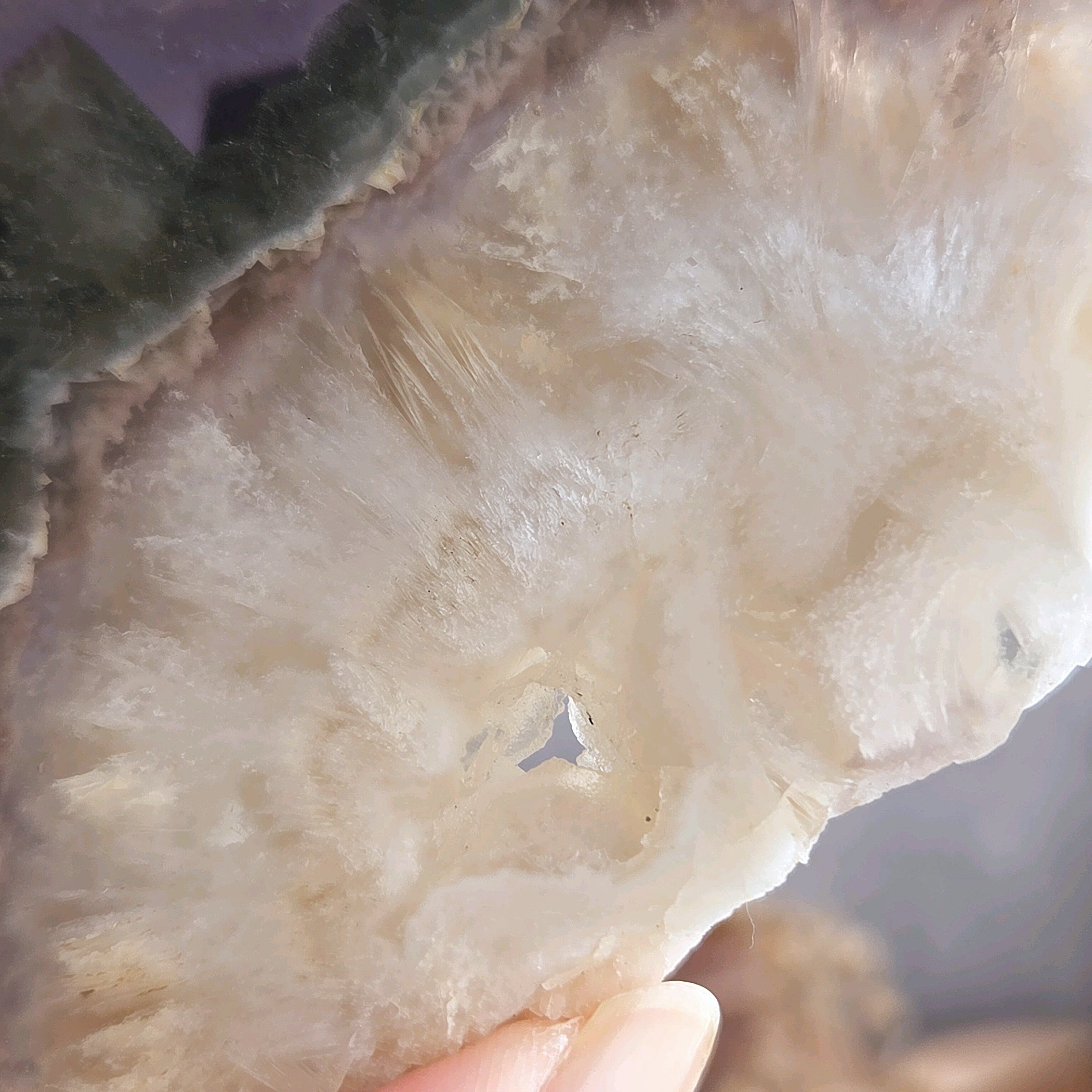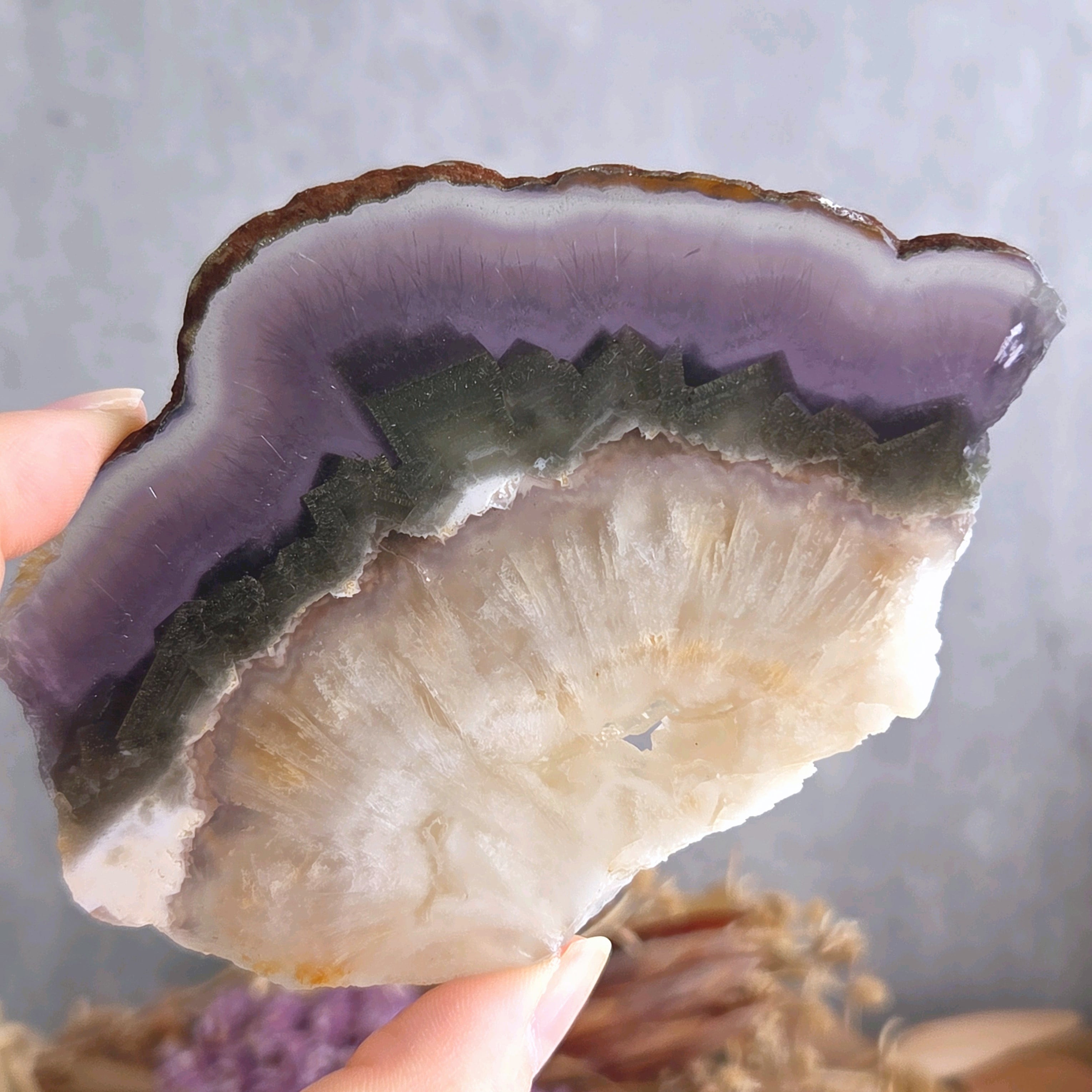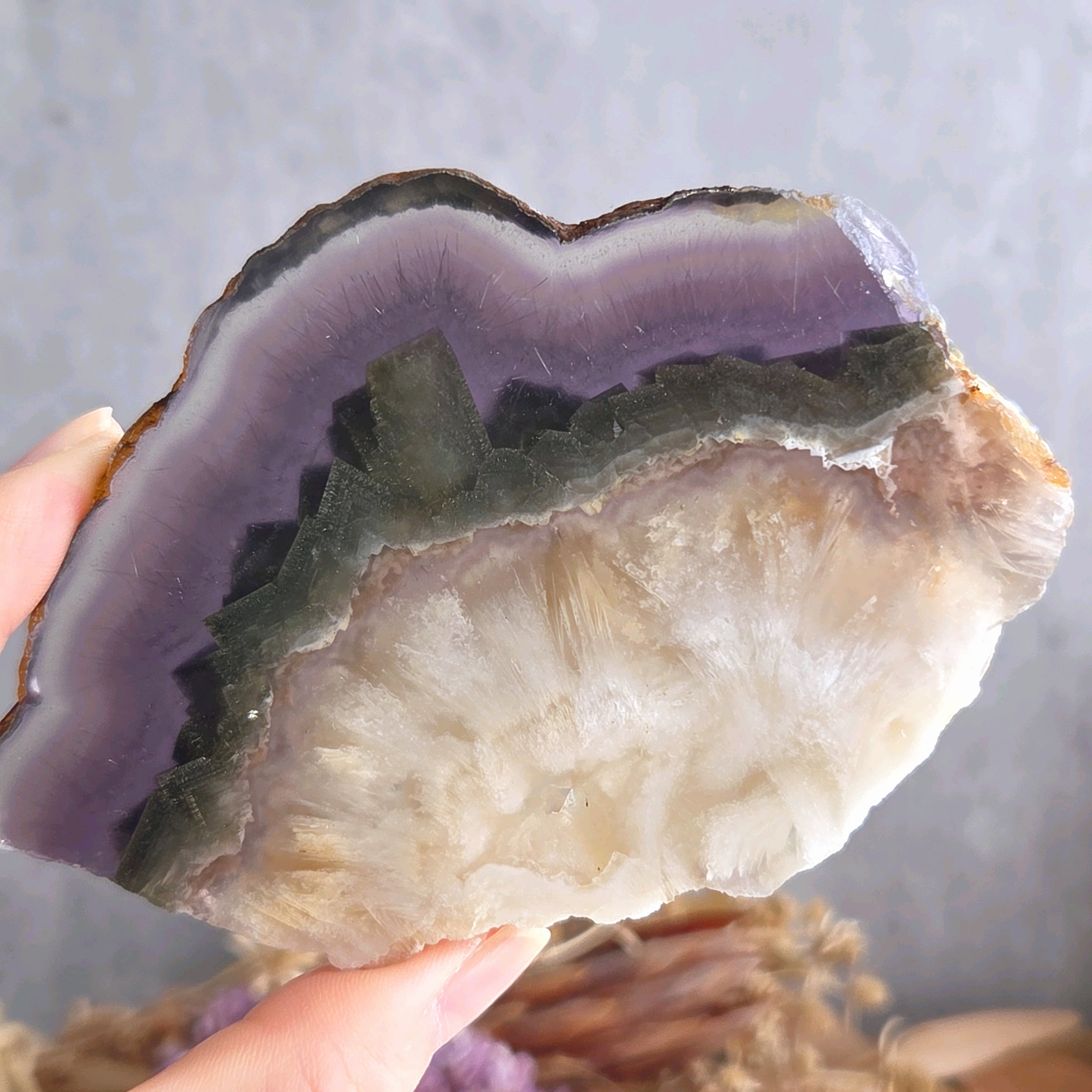 パープルの層には透明感があり針状の内包物が見られます。そしてパイライトキューブの層を挟んでフェザーのような柔らかな雰囲気の乳白色の層へと…とても美しい構造です。