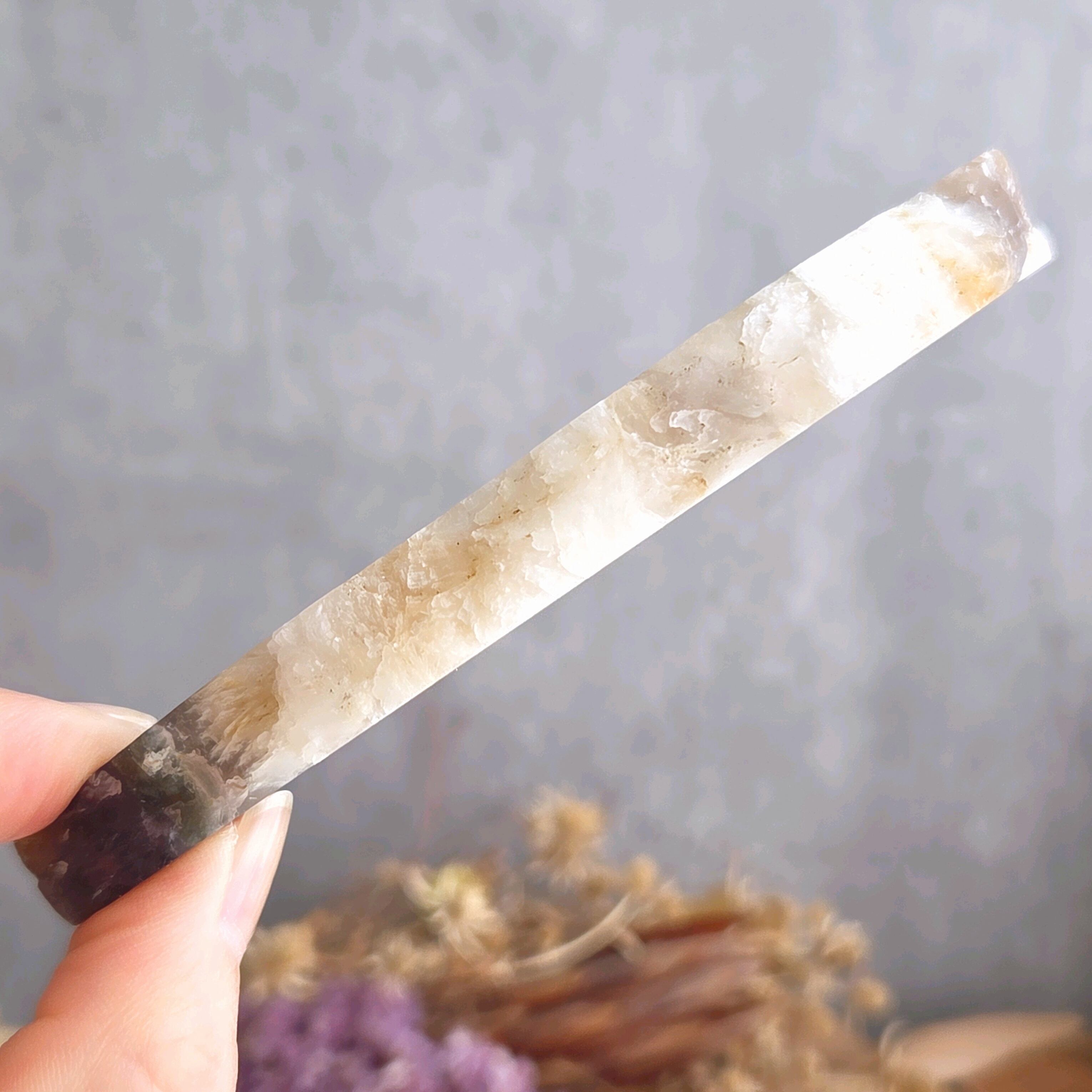 渋めのパープルと乳白色が素敵なパイライトインフローライトのスラブ(スライス)です。