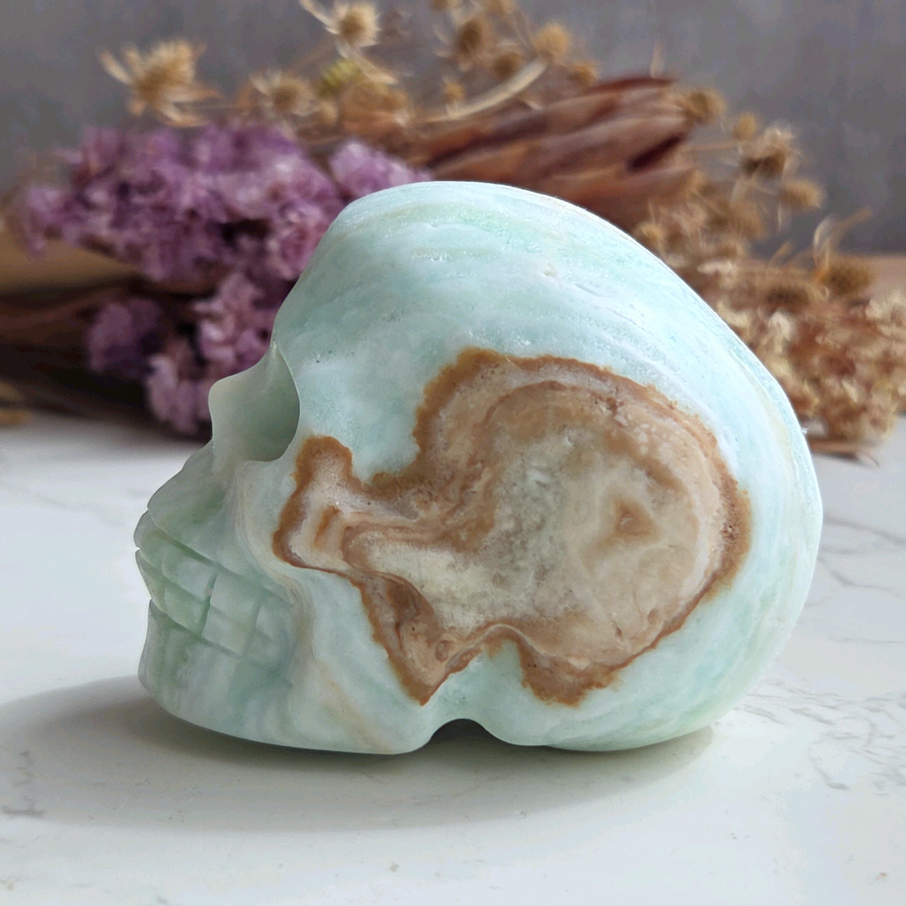 淡いブルーグリーンの海に浮かぶ島のような模様も素敵なアラゴナイトのスカルです。