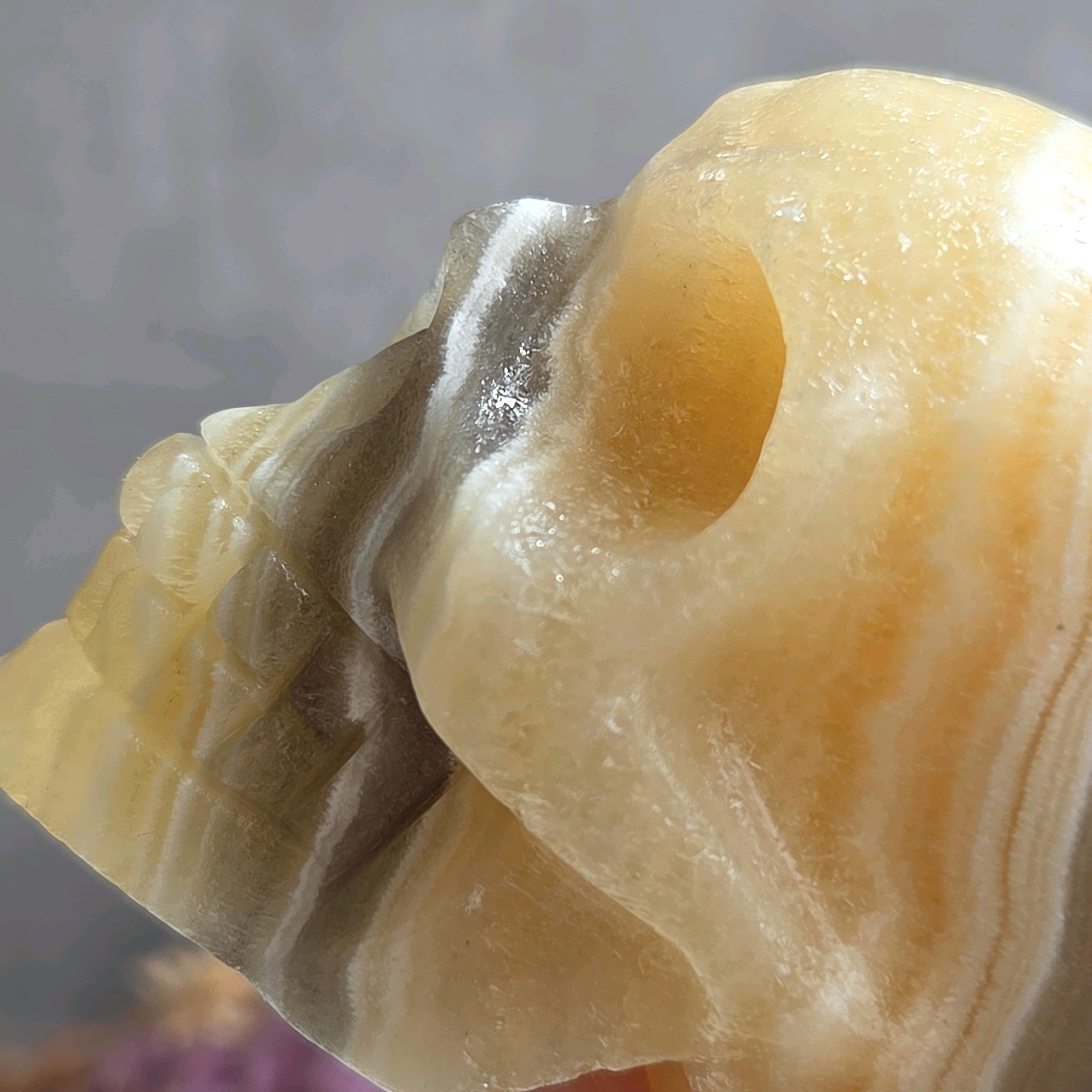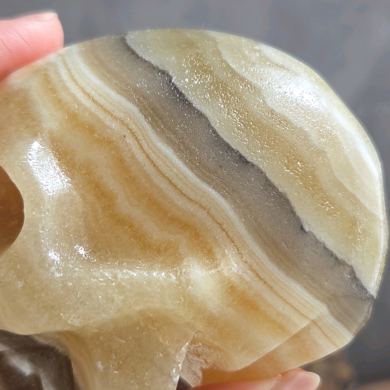 落ち着いたイエローの縞模様が素敵な大きめサイズのスカルです。