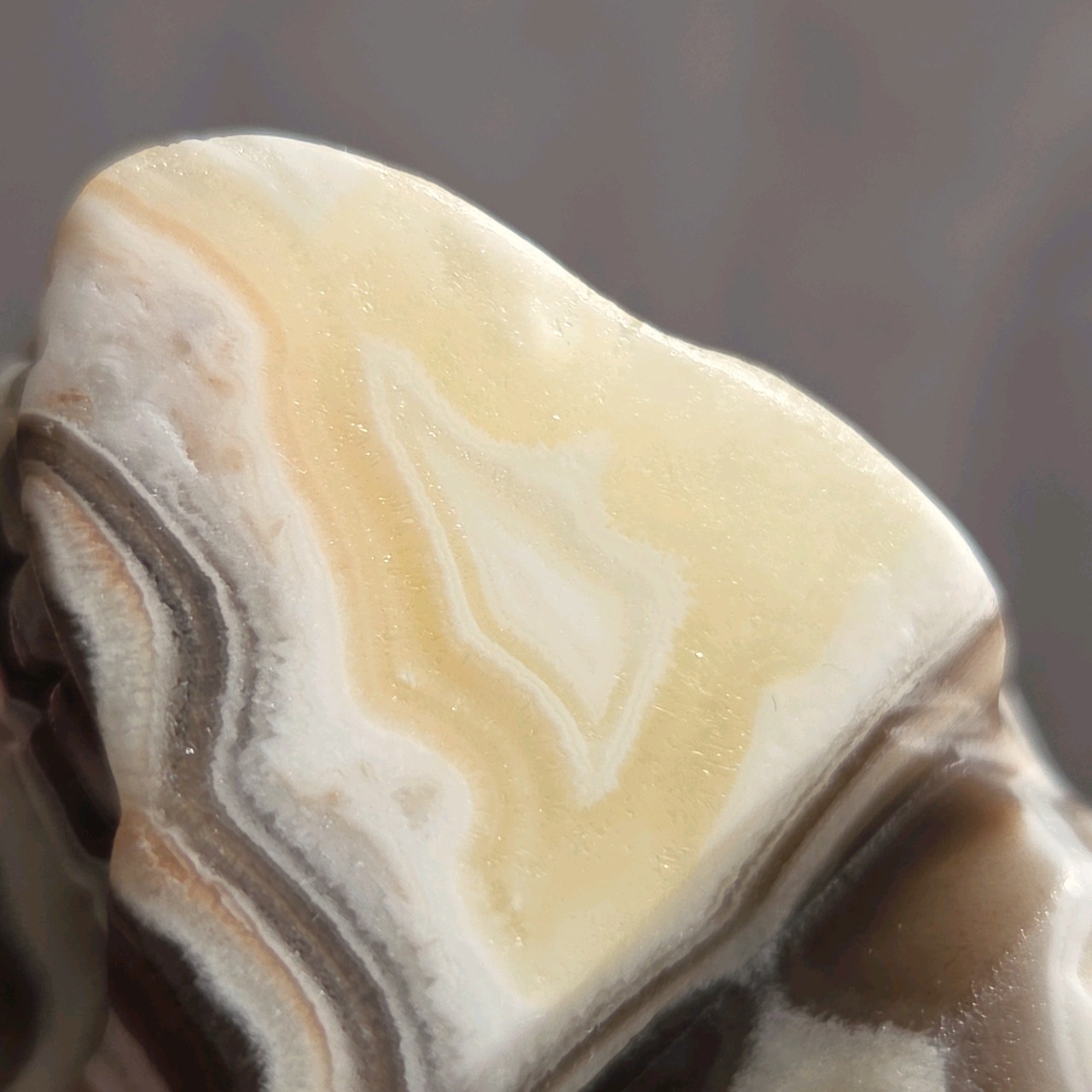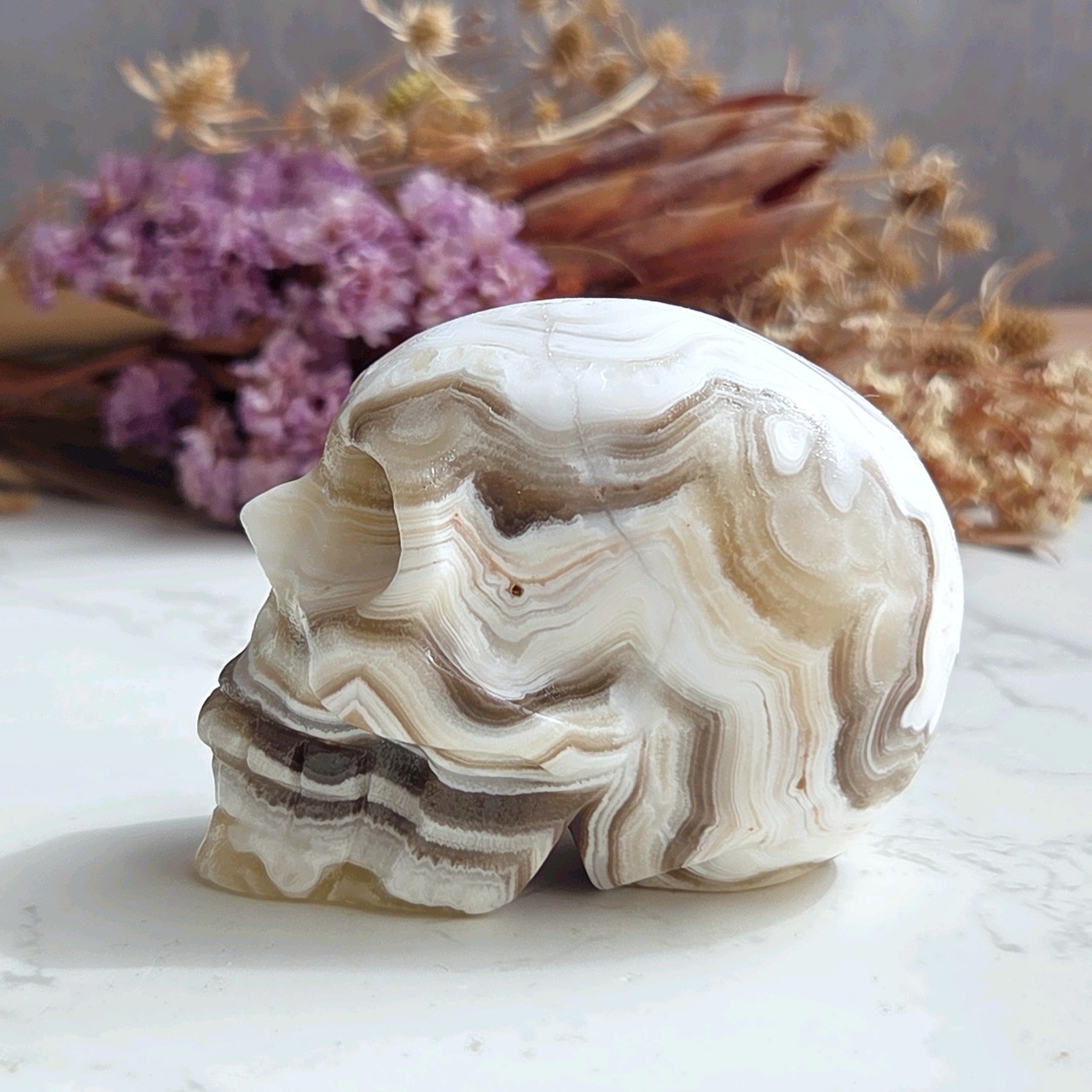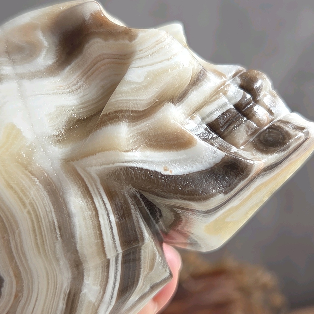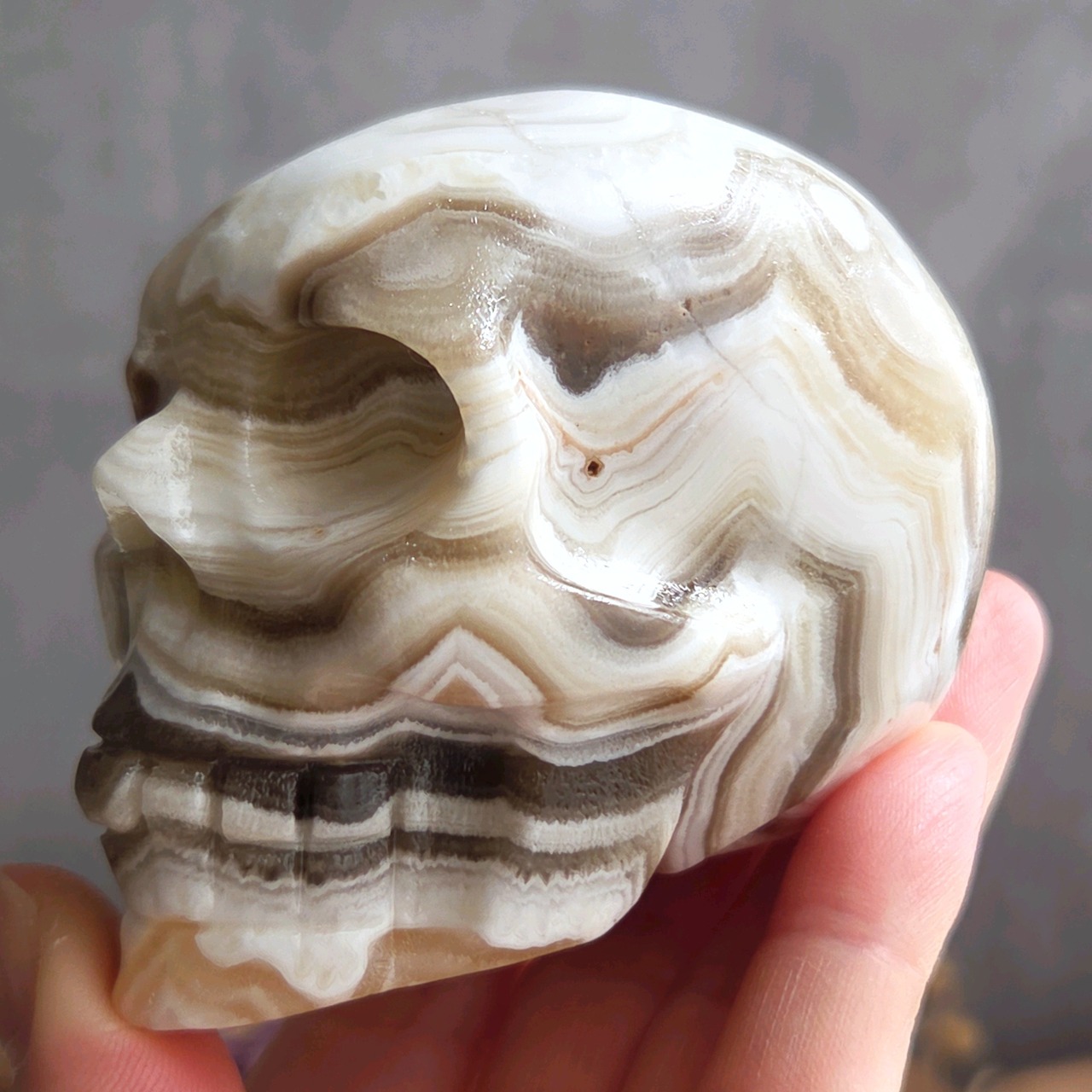 曲線的な縞模様が美しいカルサイトのスカルです。