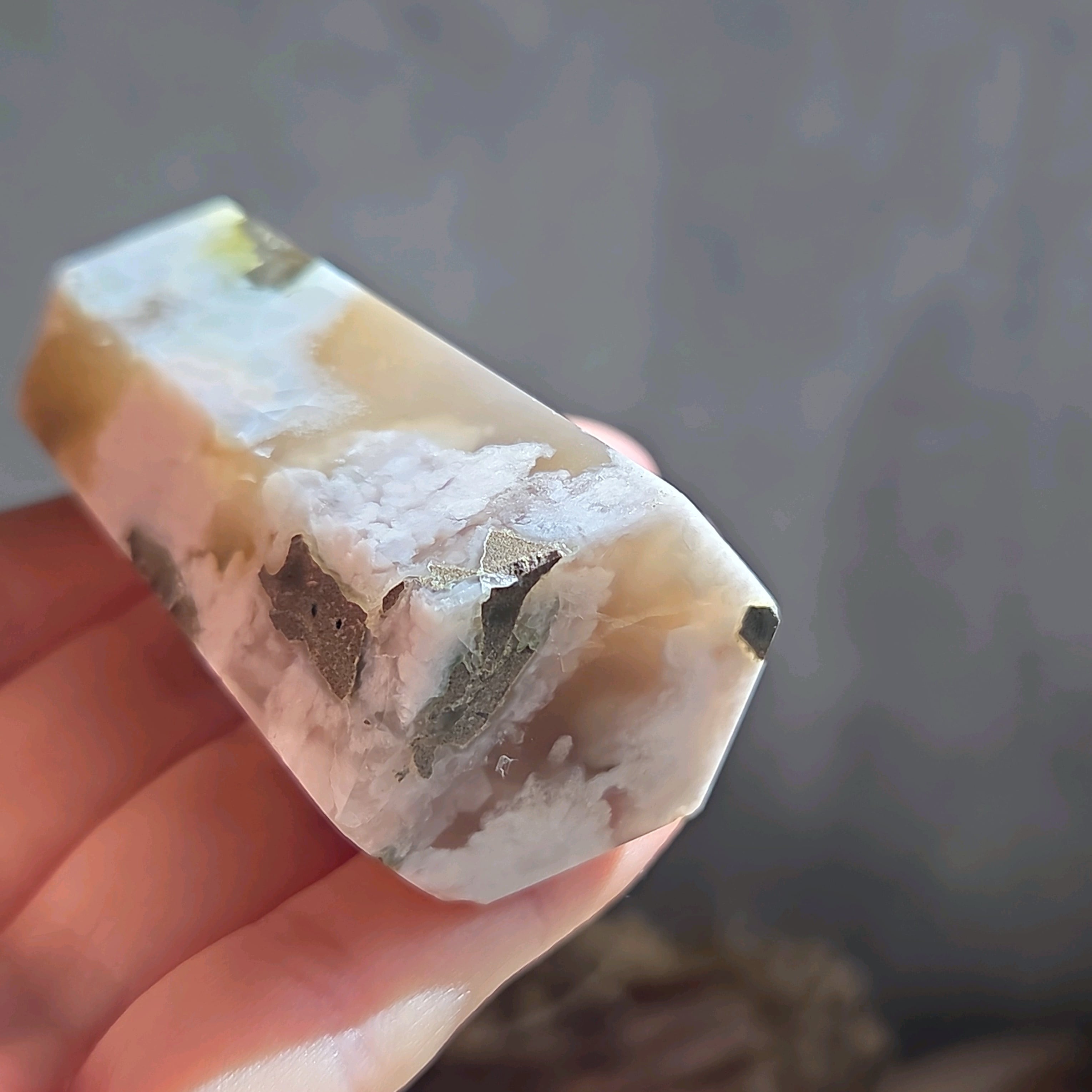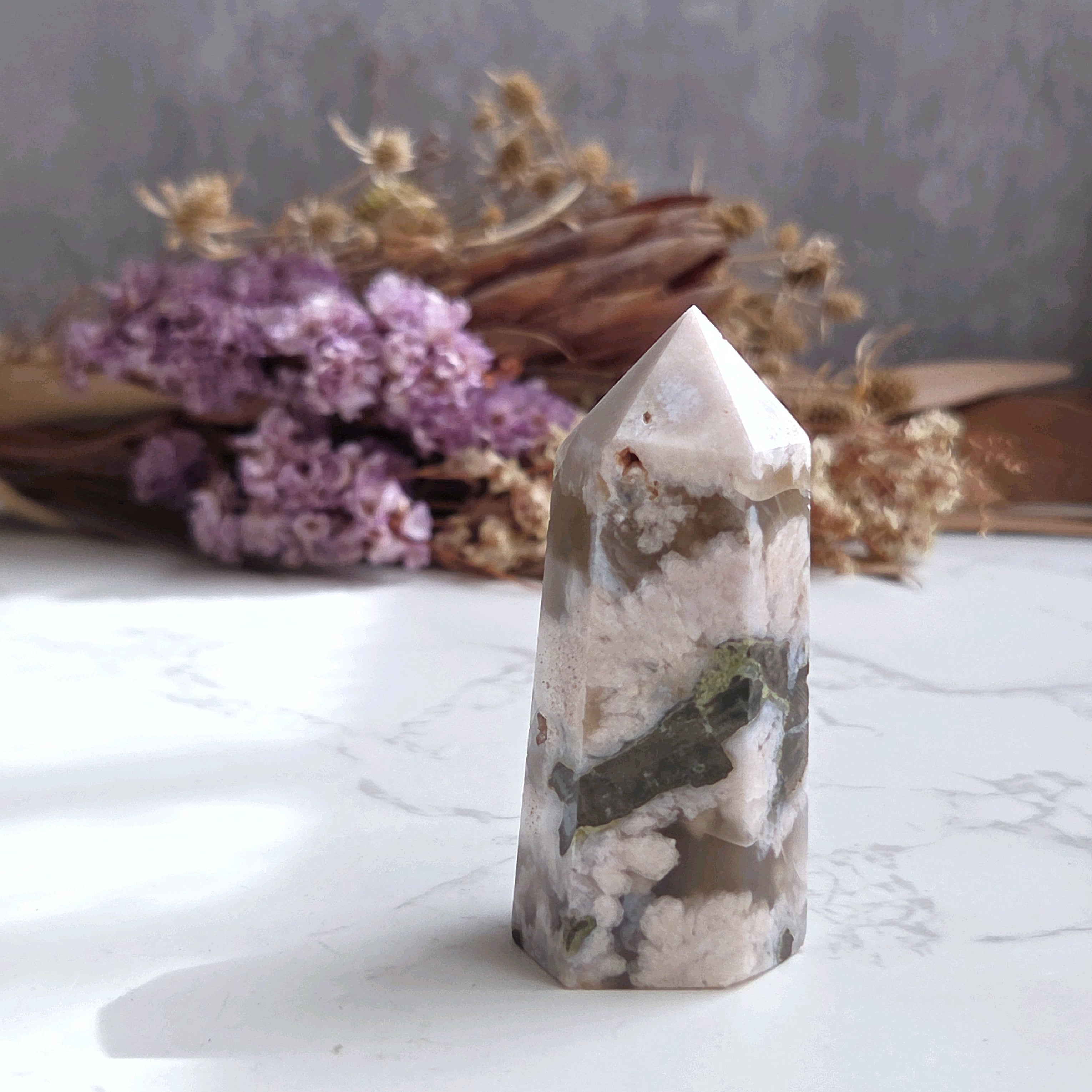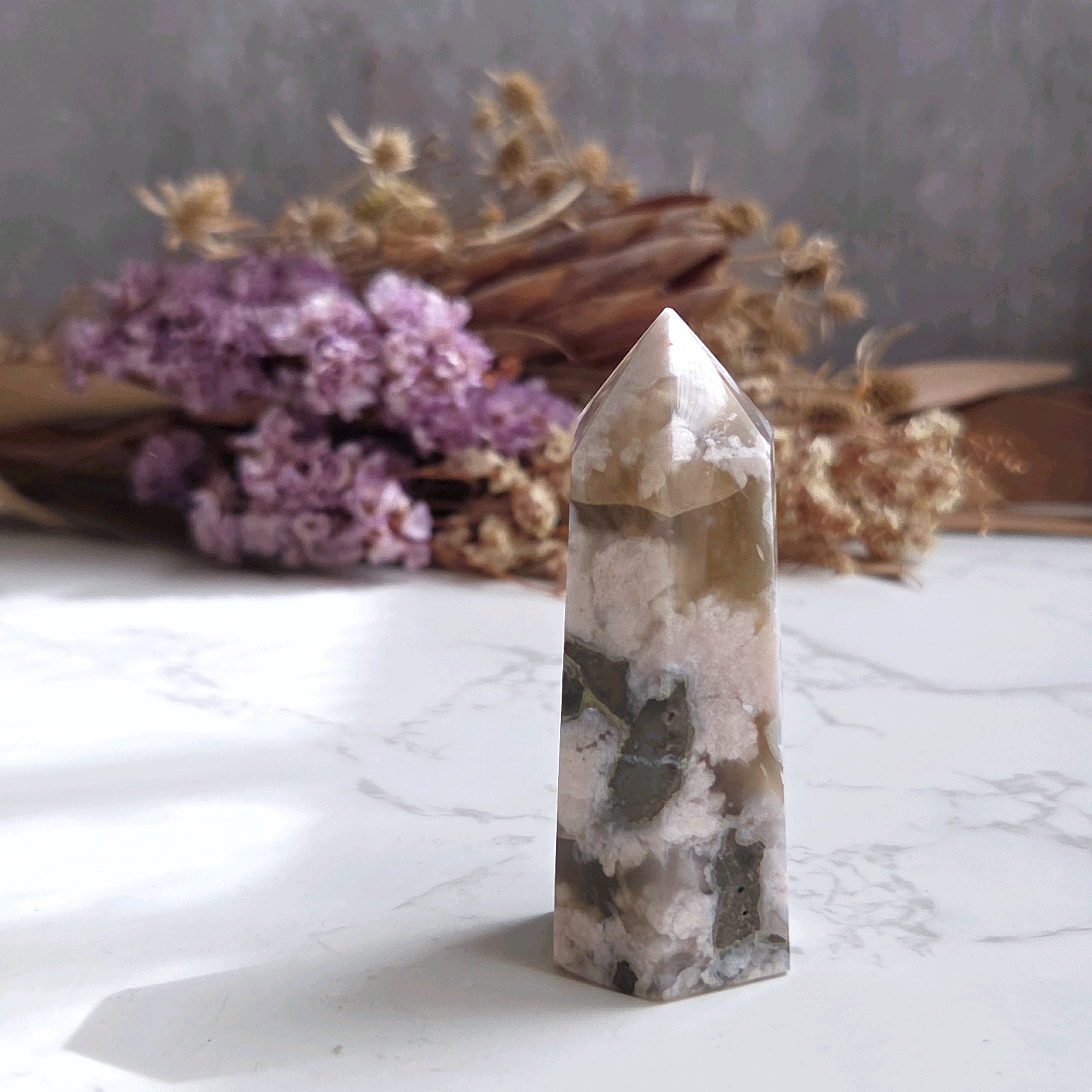 ナチュラルなブラウンベージュのアゲートに優しいピンクのフラワーが素敵なタワーです。