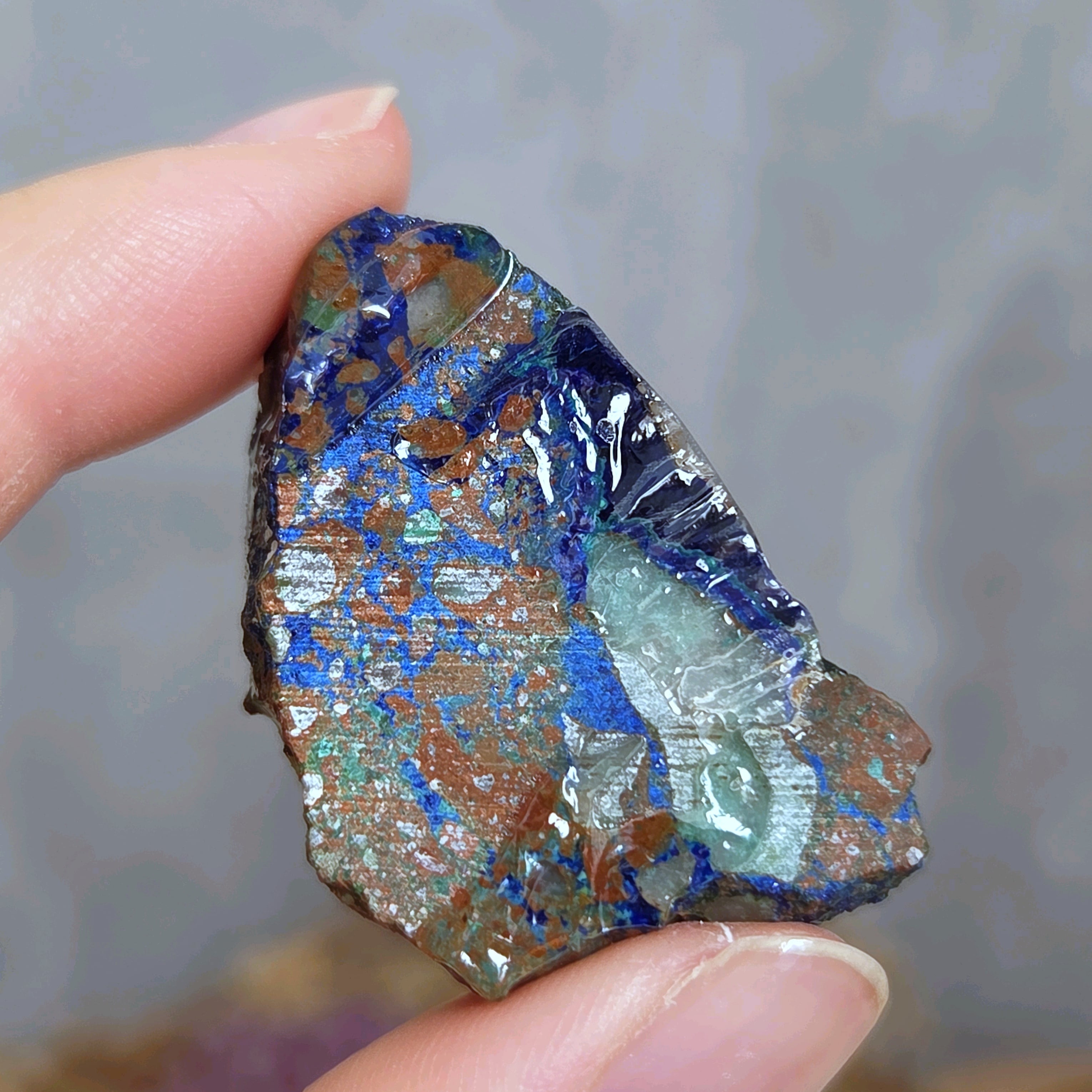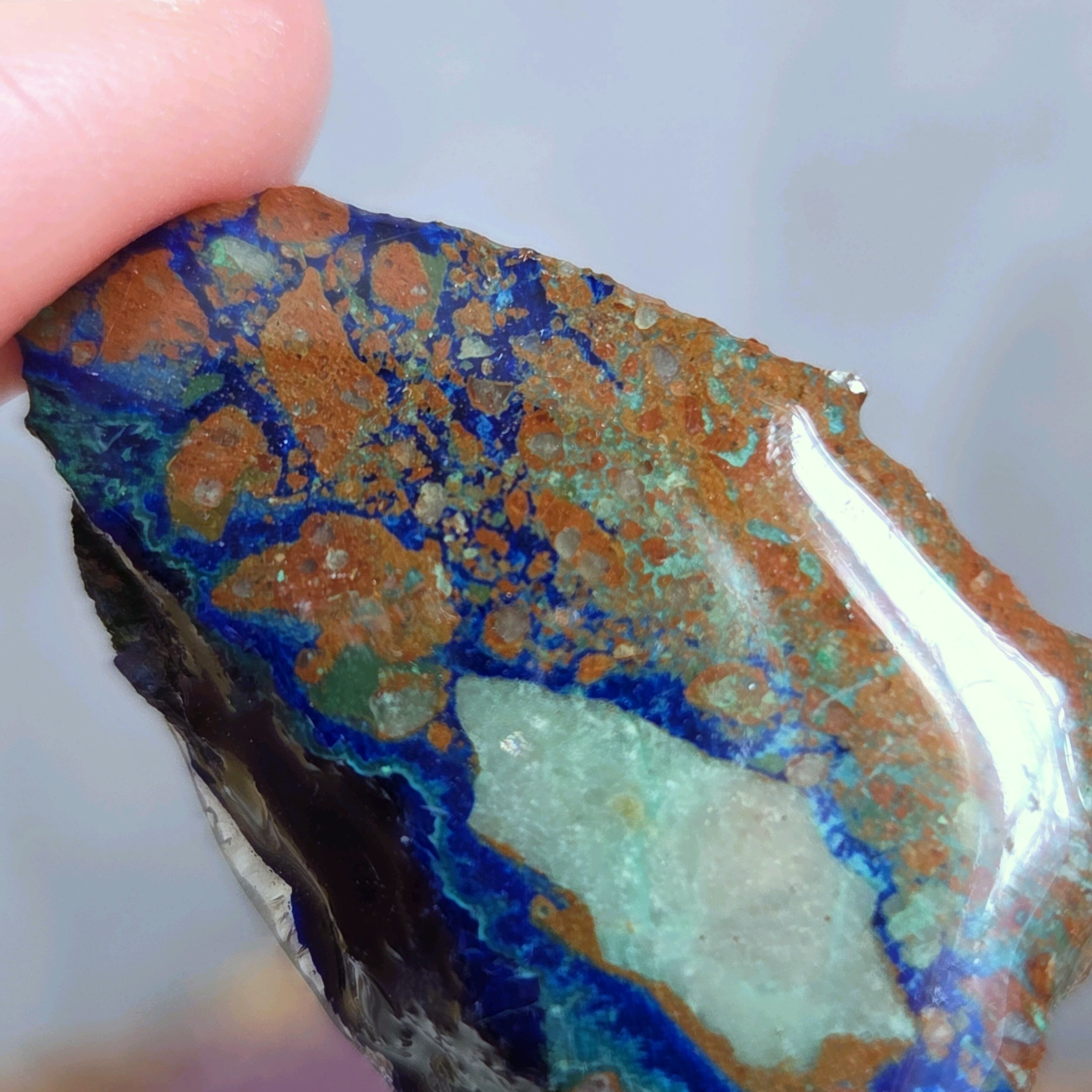 アズライトやマラカイトを含む共生原石をハーフポリッシュ、さらにレジンのようなものをかけてつや出ししたものです。