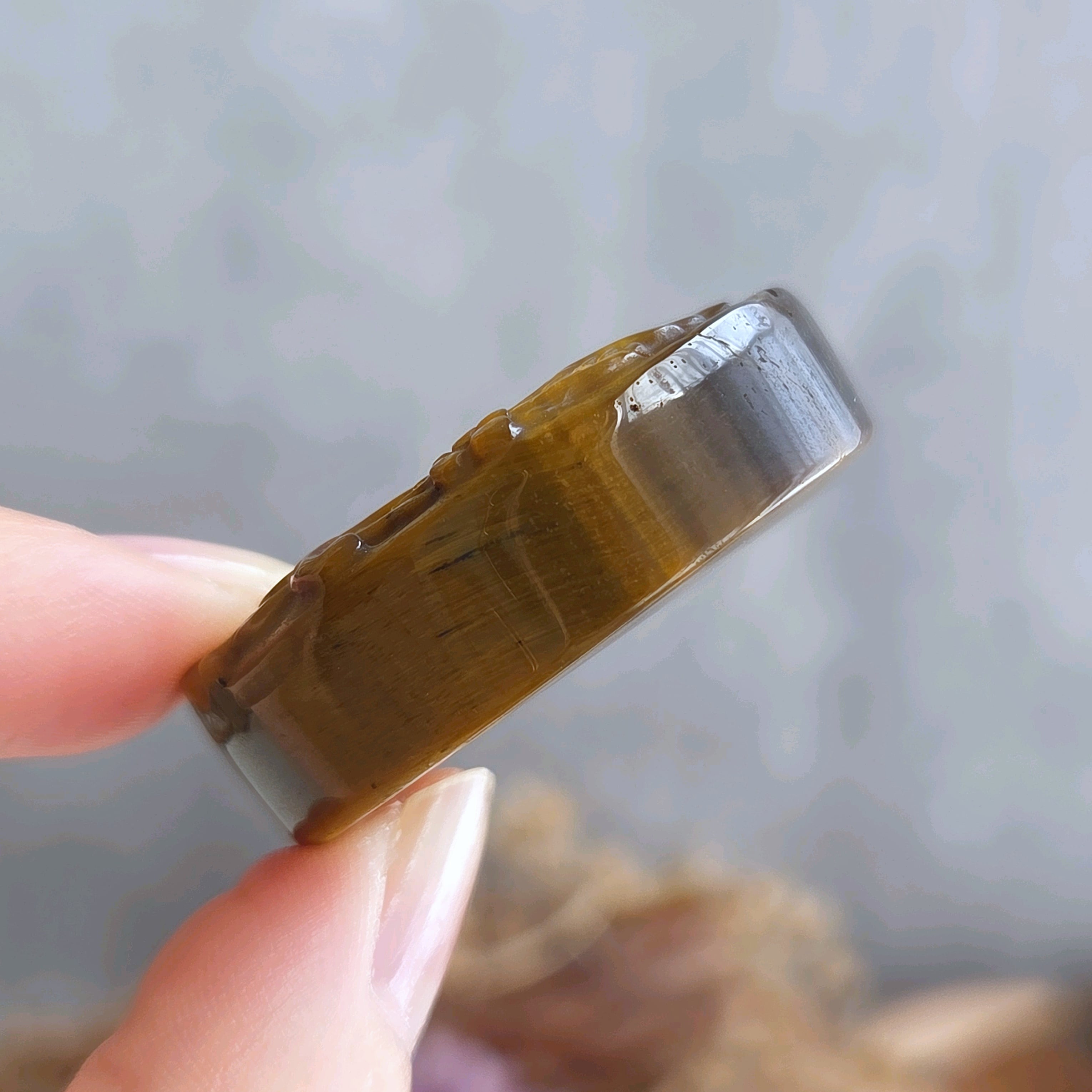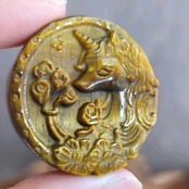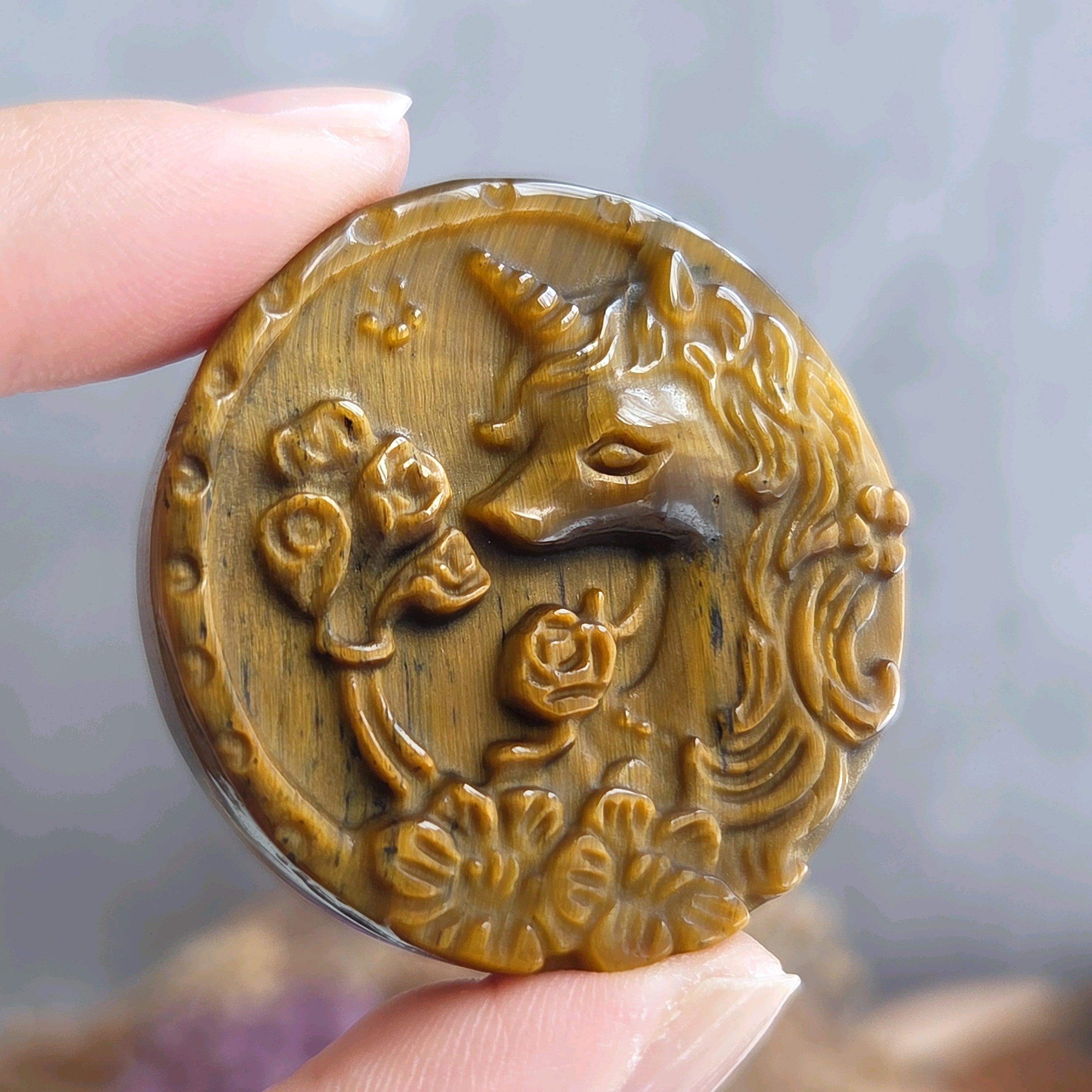 キュートなユニコーンが彫られたメダル型のタイガーアイです。