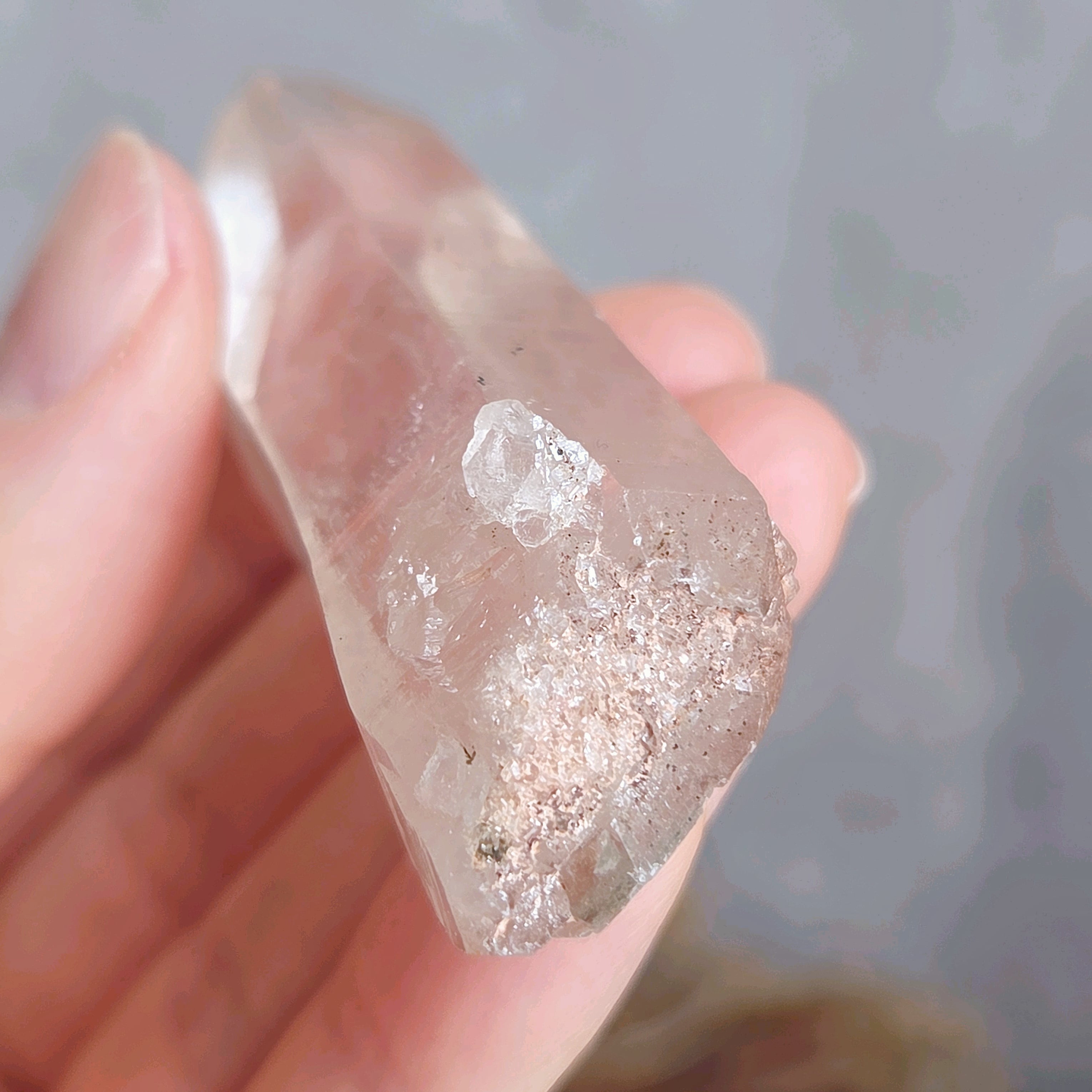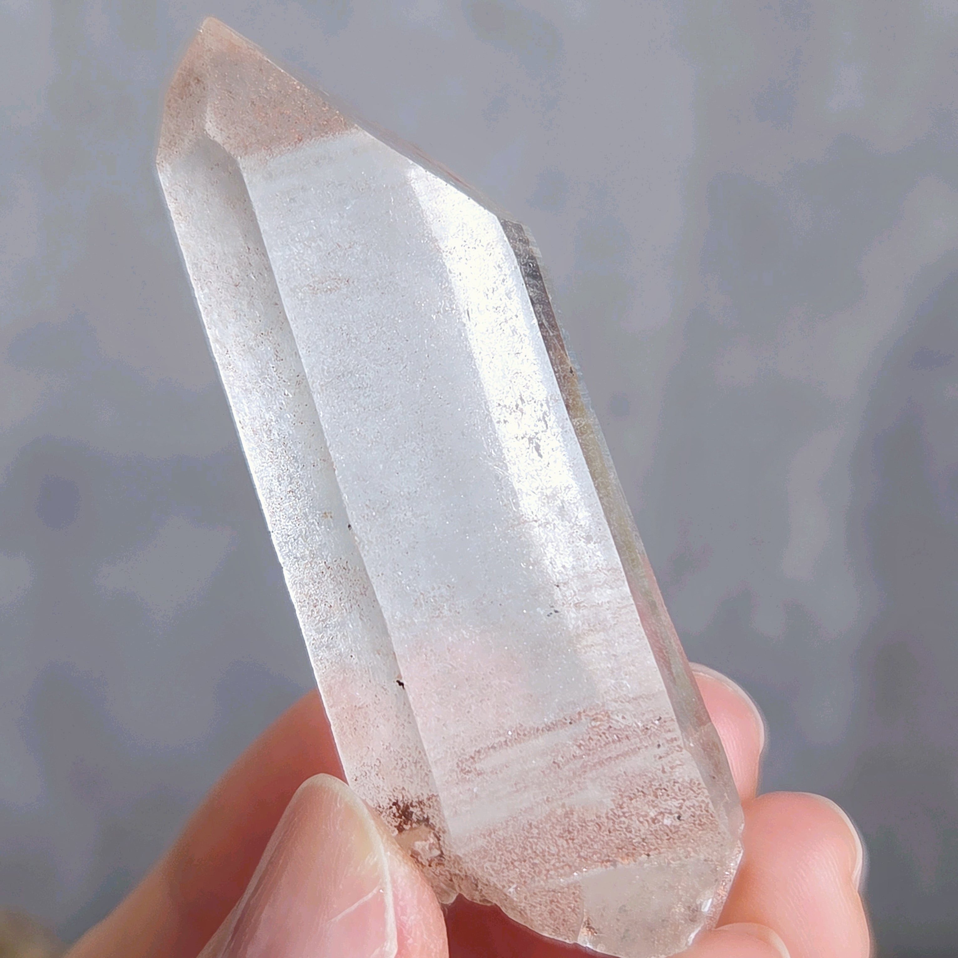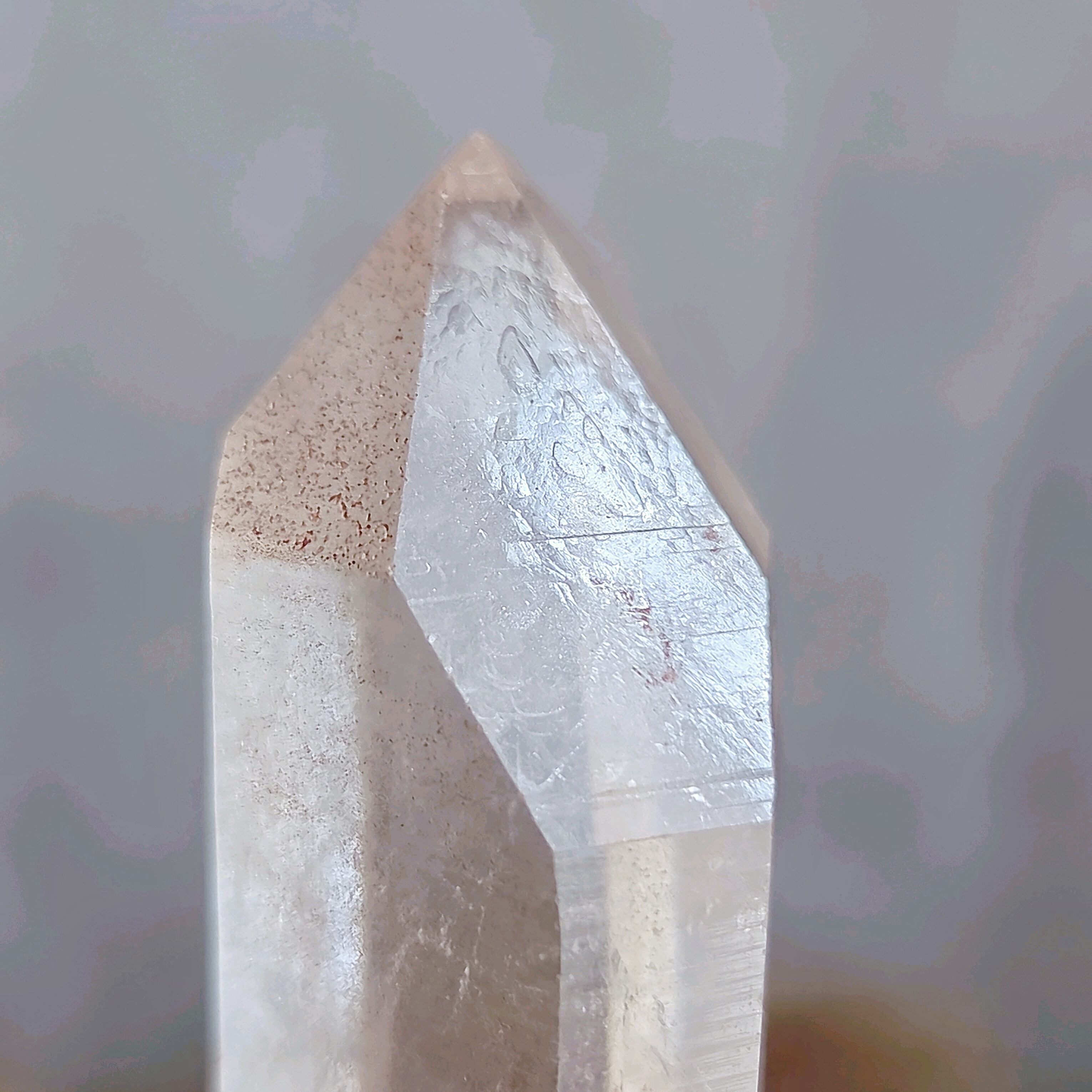 トップに僅かな欠けがありますが、イシスをもつクリスタルです。また柱面には少しくびれたような部分も見られ、全体的に女性的なエネルギーを感じます。か弱さや柔らかさではなく、しなやかな強さという感じでしょうか(*^^*)