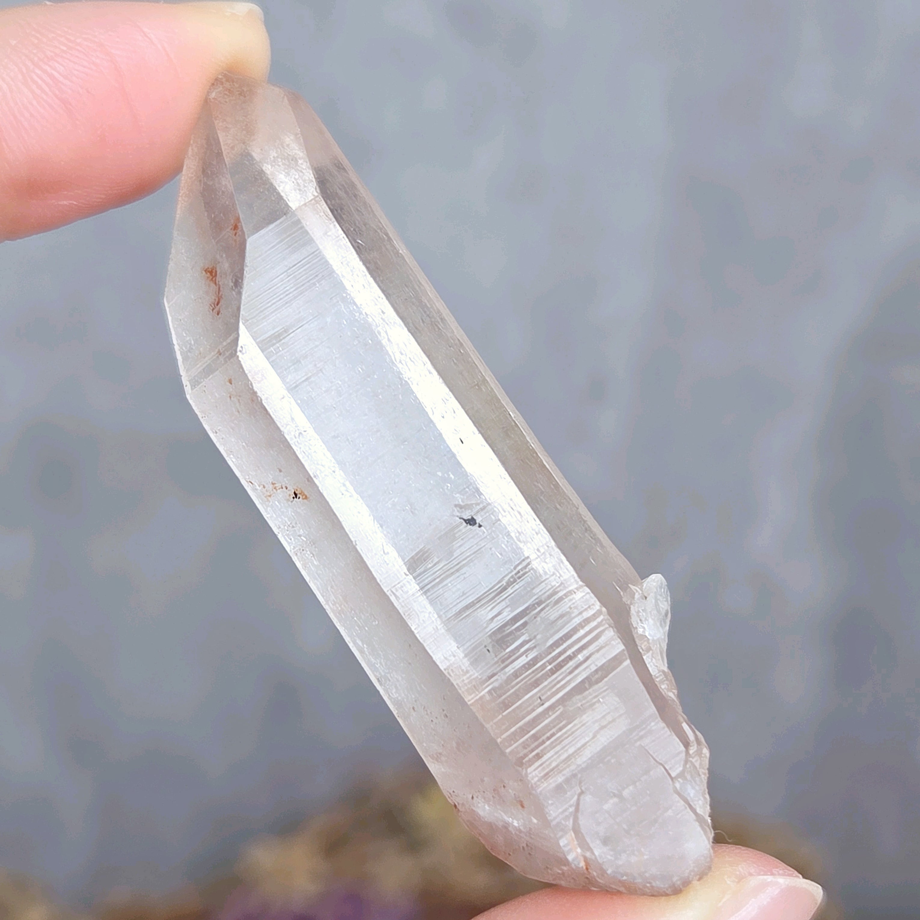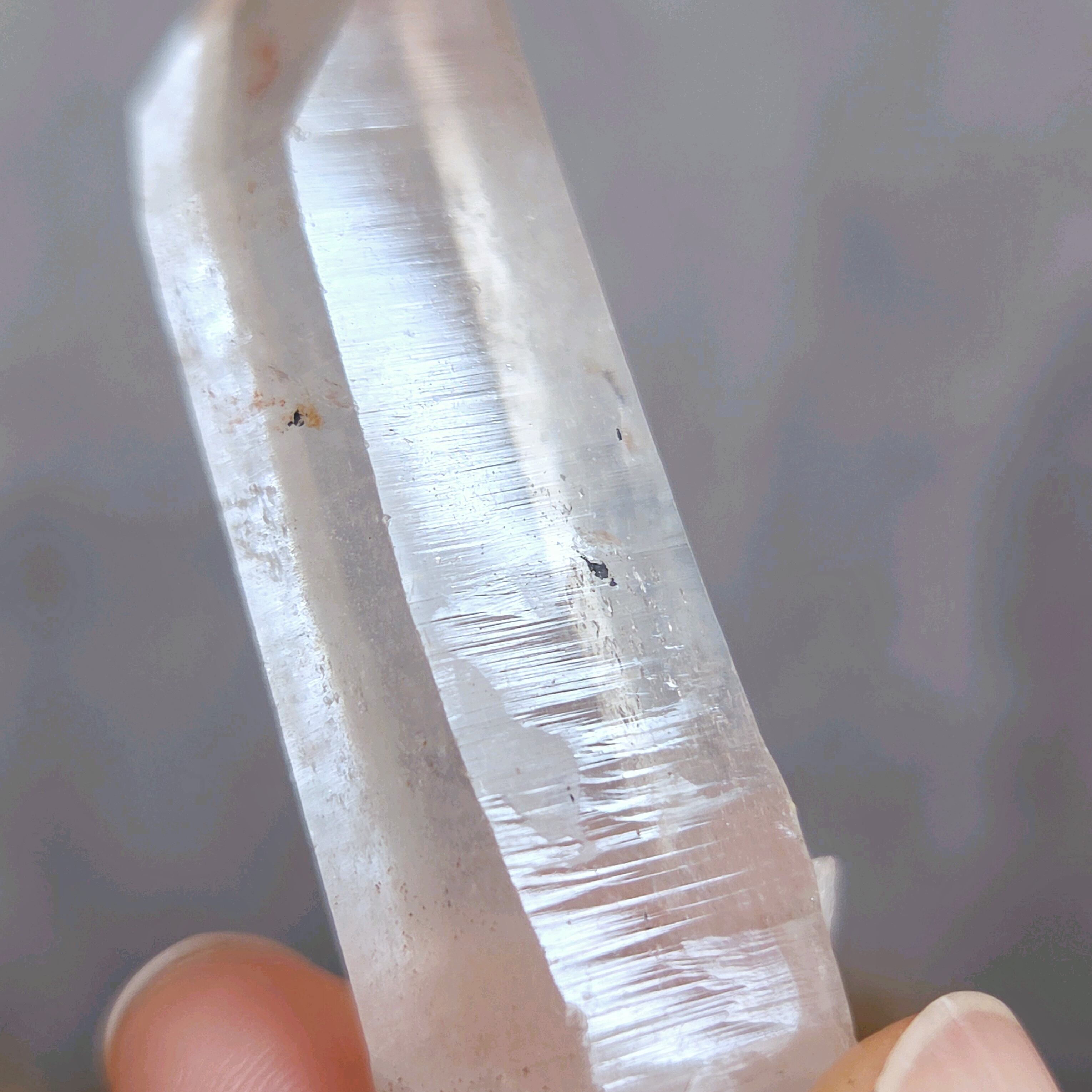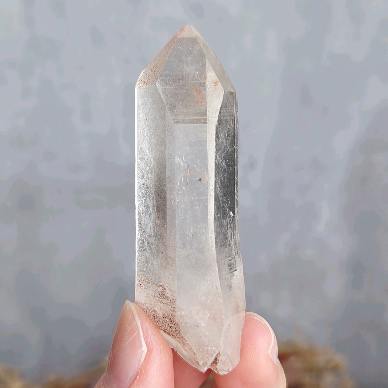トップに僅かな欠けがありますが、イシスをもつクリスタルです。また柱面には少しくびれたような部分も見られ、全体的に女性的なエネルギーを感じます。か弱さや柔らかさではなく、しなやかな強さという感じでしょうか(*^^*)