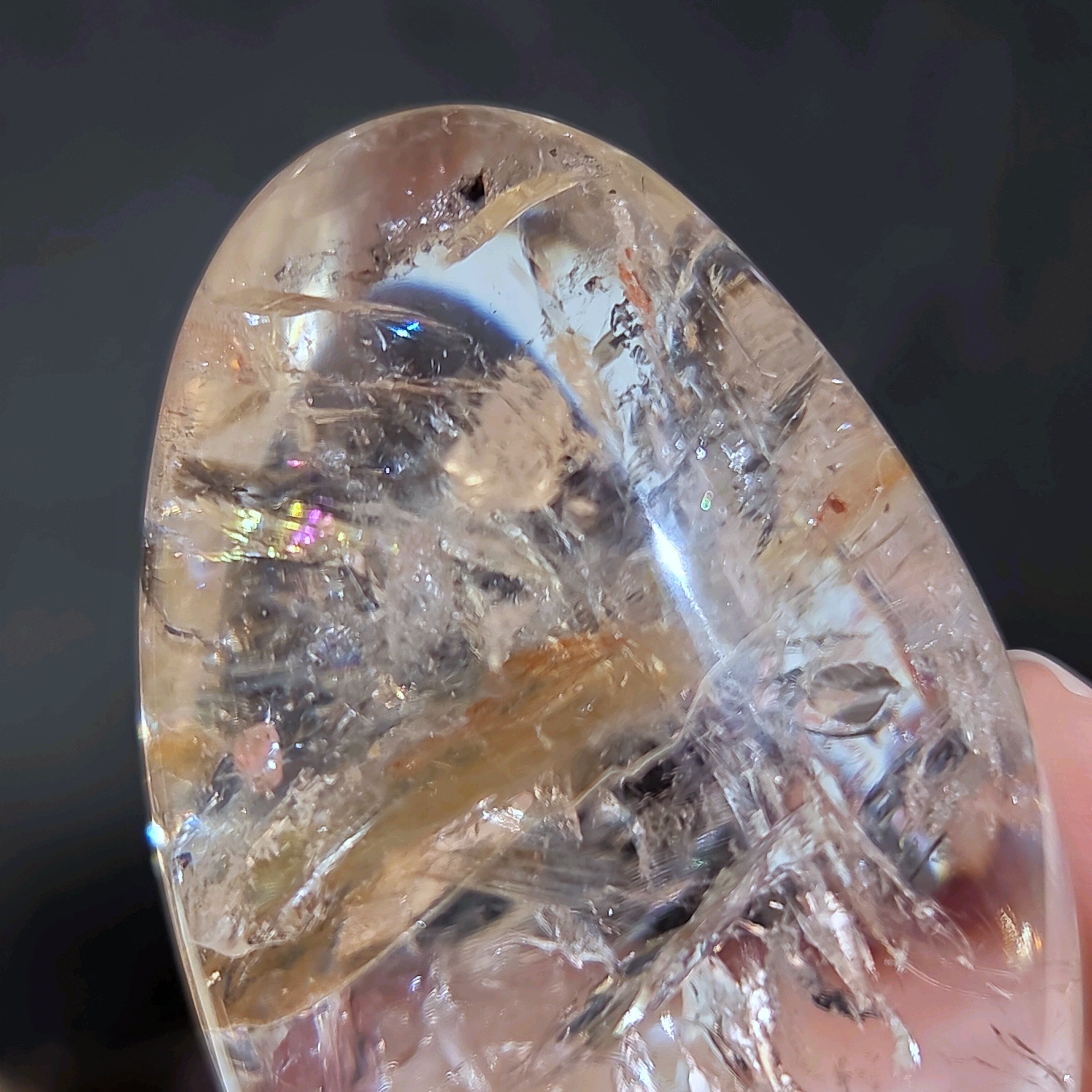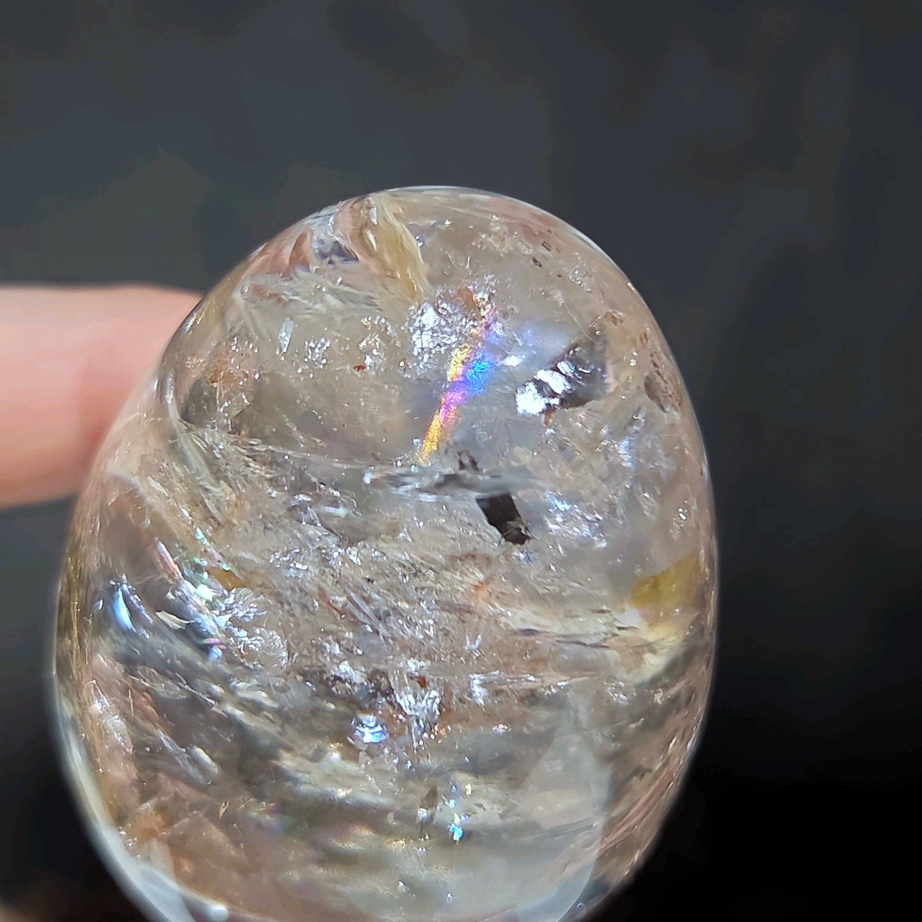 うっとりとため息が出るほど美しいブラジル産水晶の卵型です。イエローヘマタイトがひらひらと泳ぎ、いたるところに虹が輝きます。