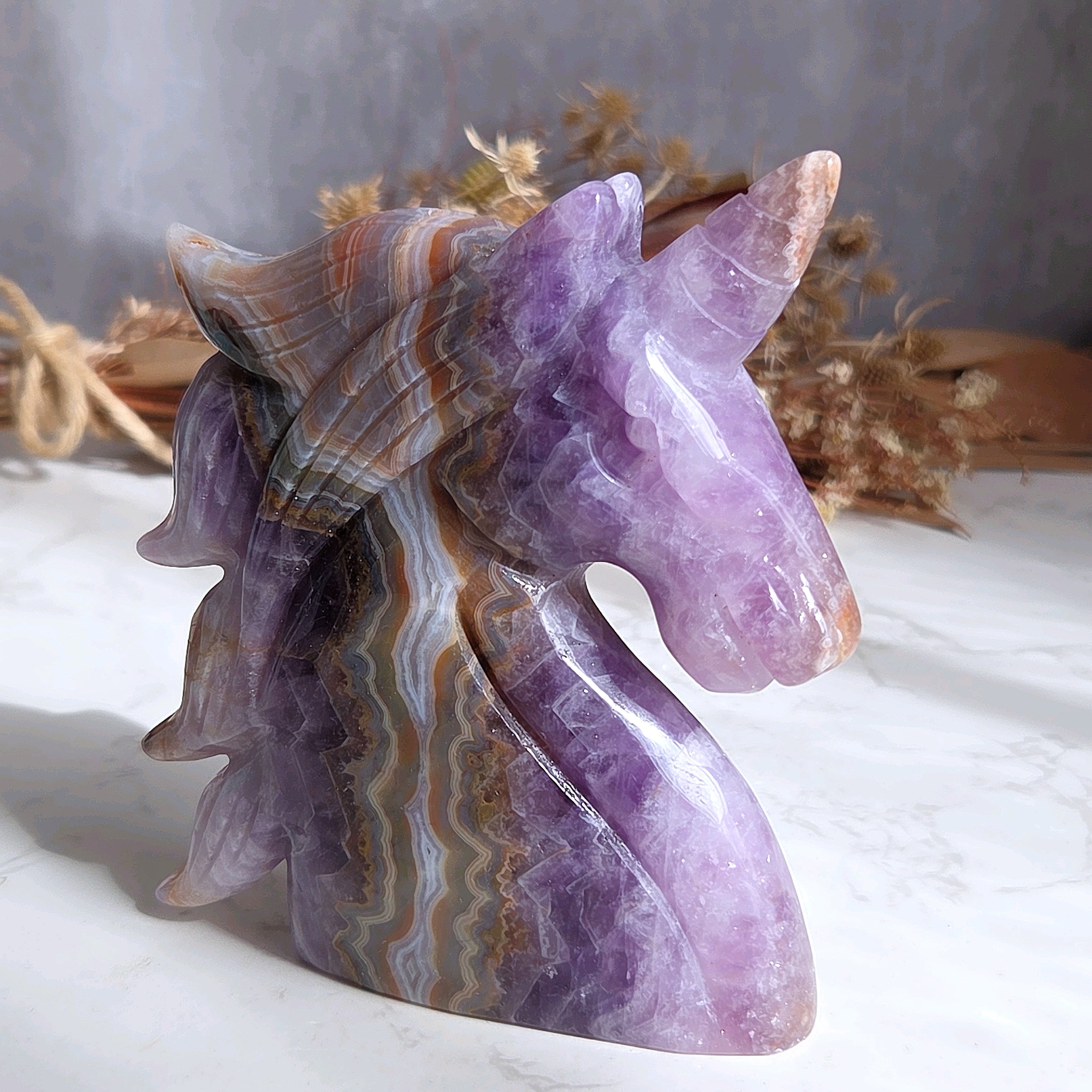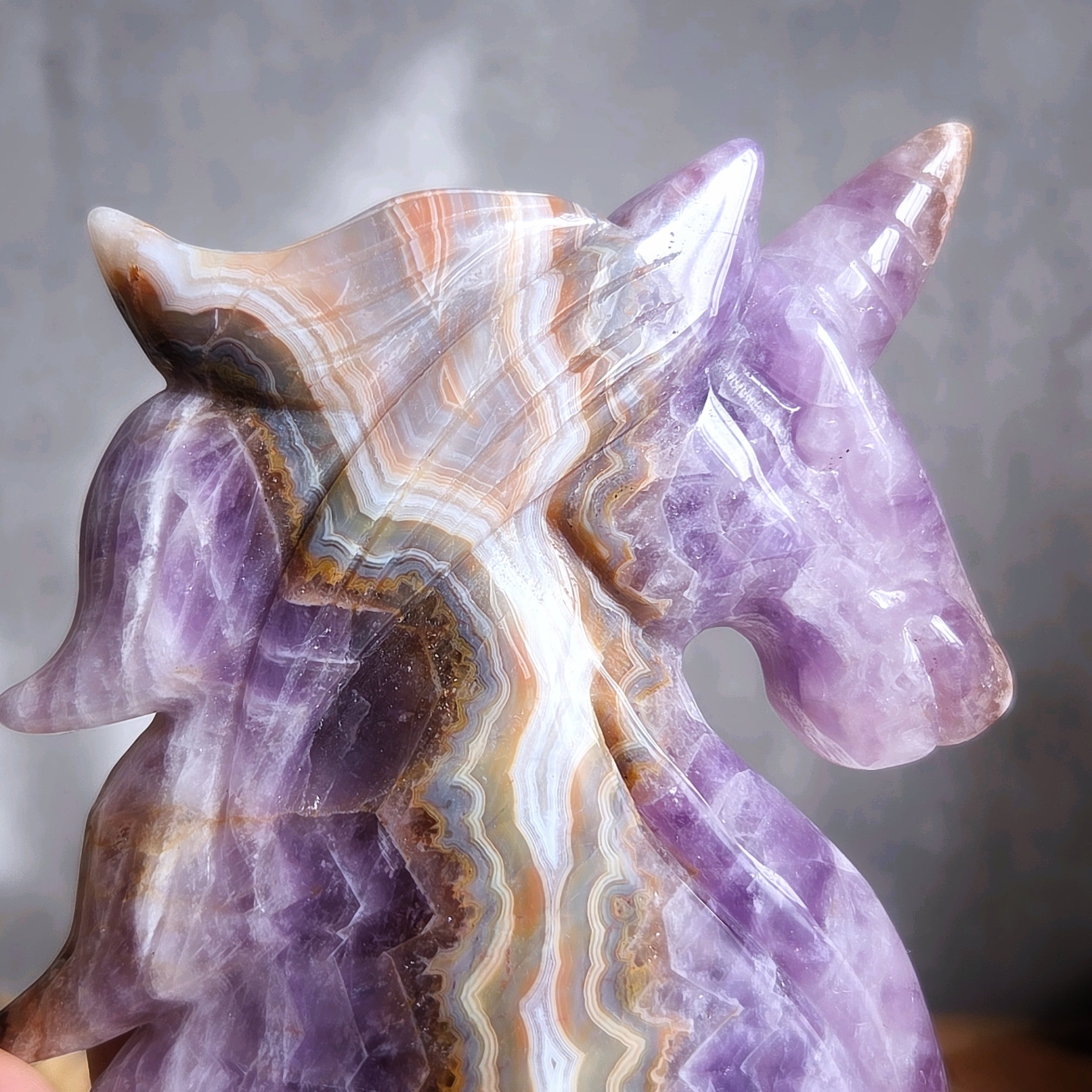 アメジストの結晶も、アゲートの模様も本当に綺麗でいつまでも見ていたいようなユニコーンさんです♡