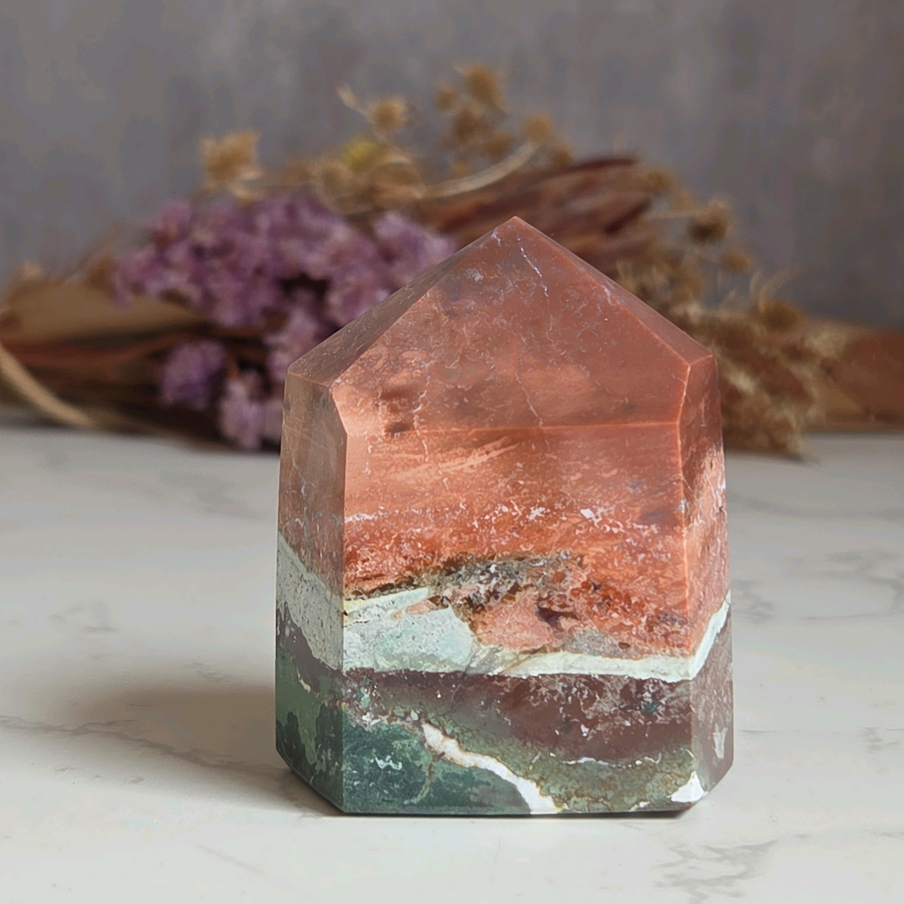 ユニコーンジャスパーは2022年にインドで発見されたばかりの新しいストーンで、パステルカラーのマーブル模様が特徴的です。