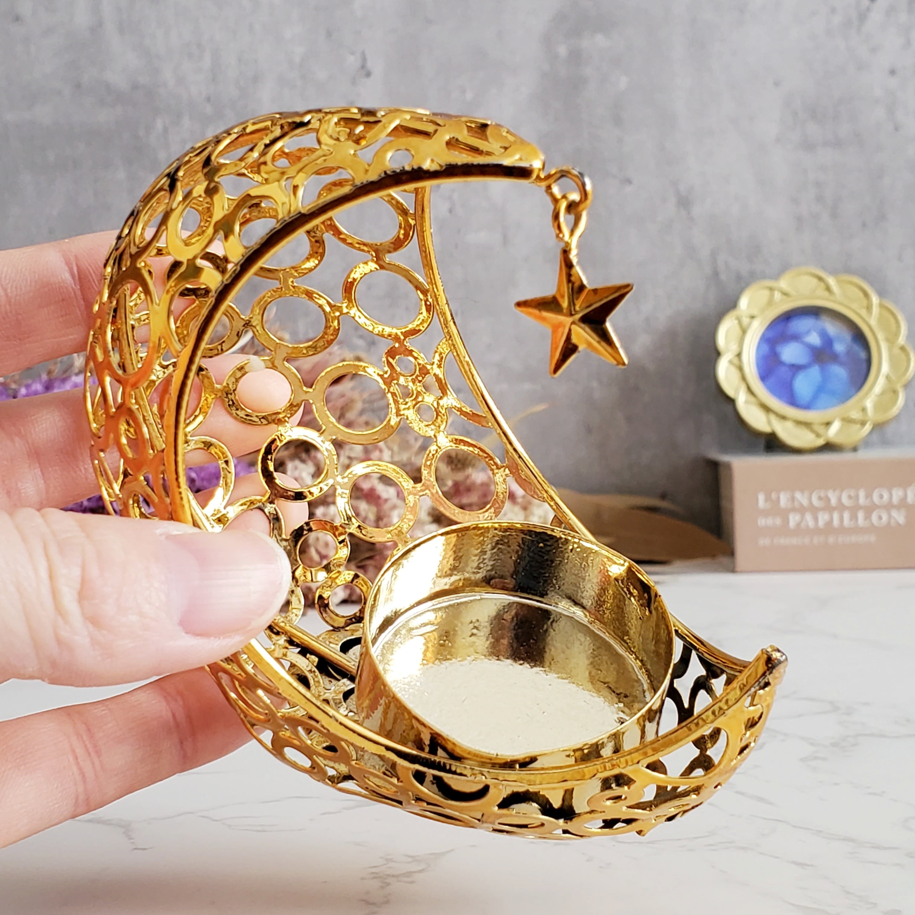 ゴールドの透かしデザイン、月の形のキャンドルホルダーです。