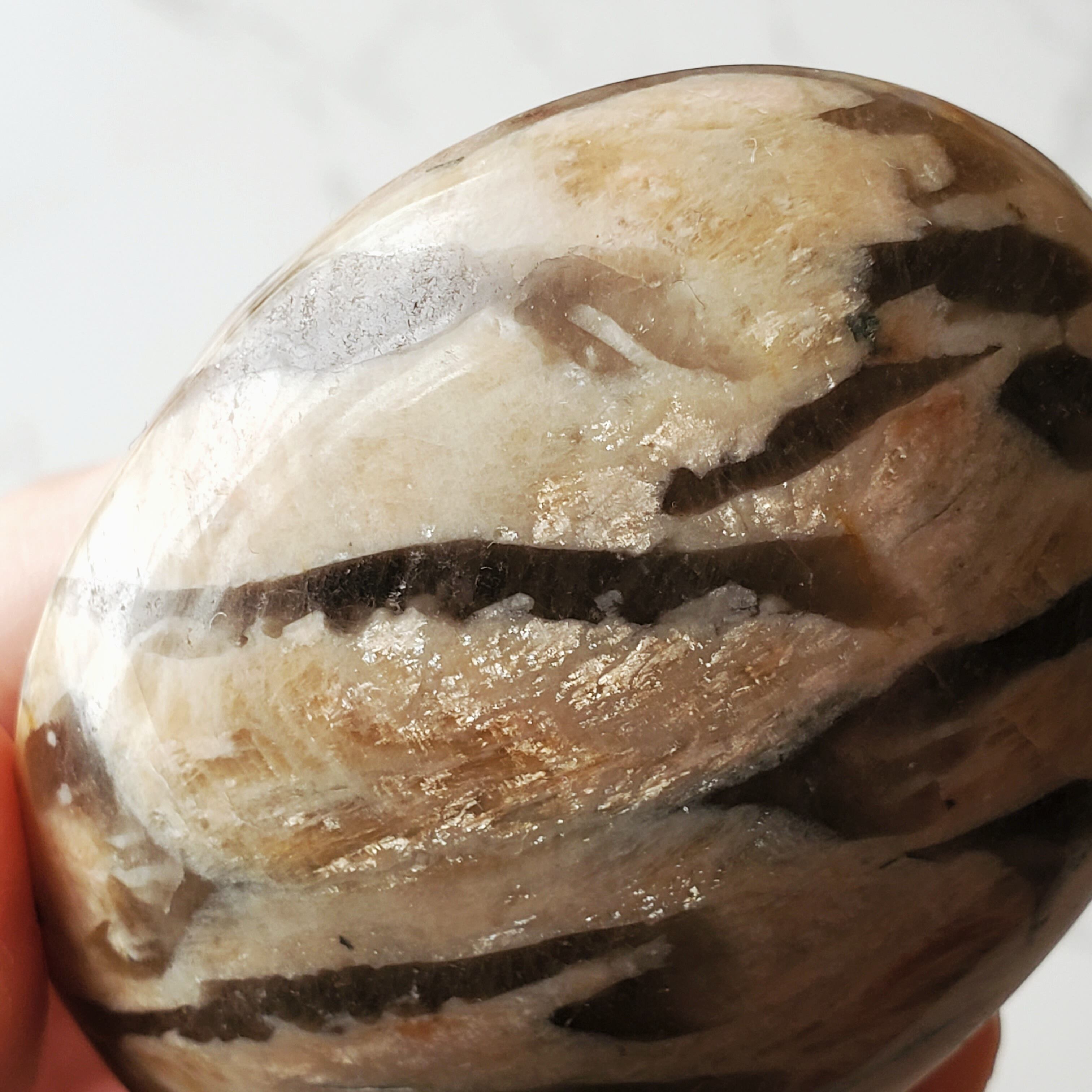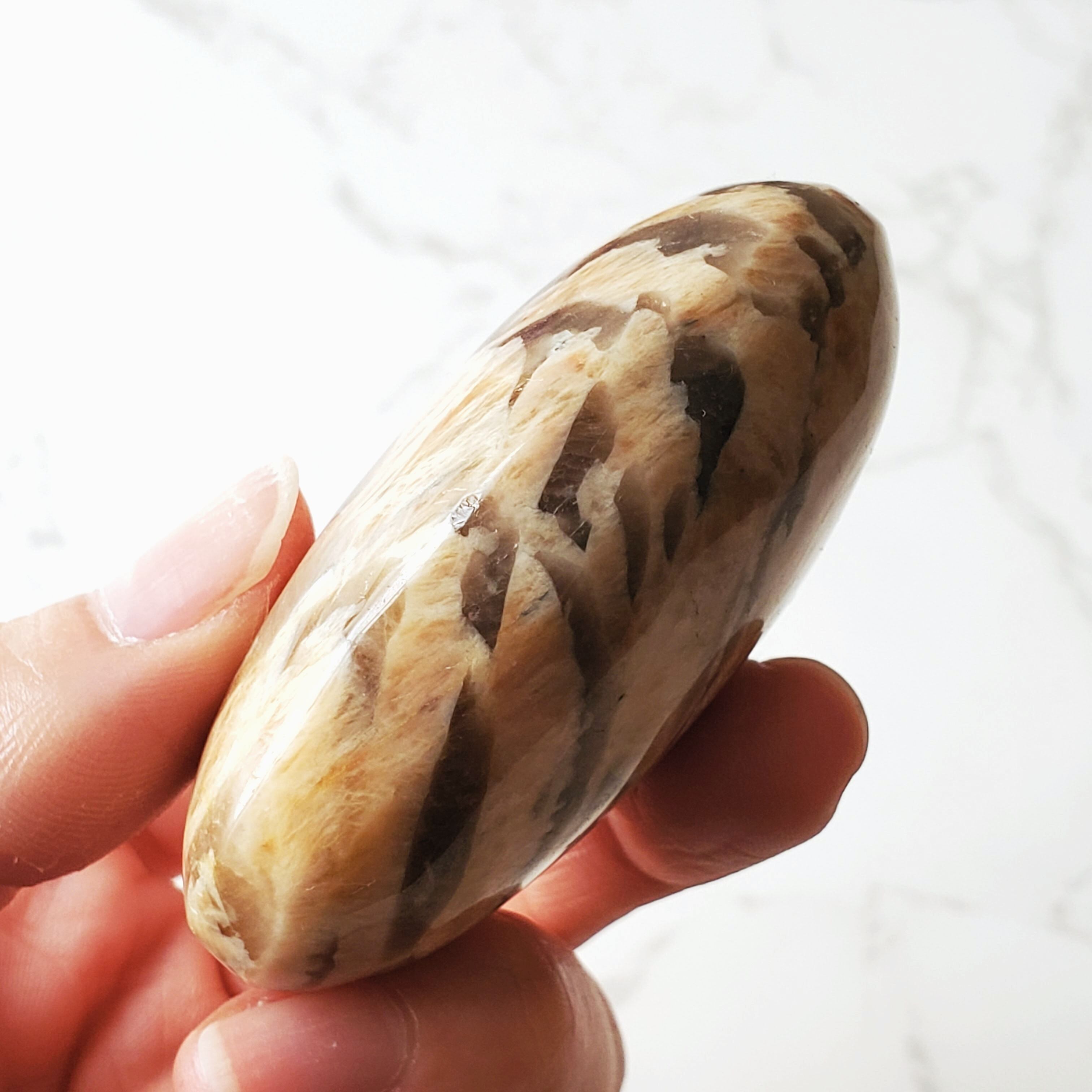 シラー輝くピーチムーンストーンにスモーキークォーツが共生したパームストーンです。