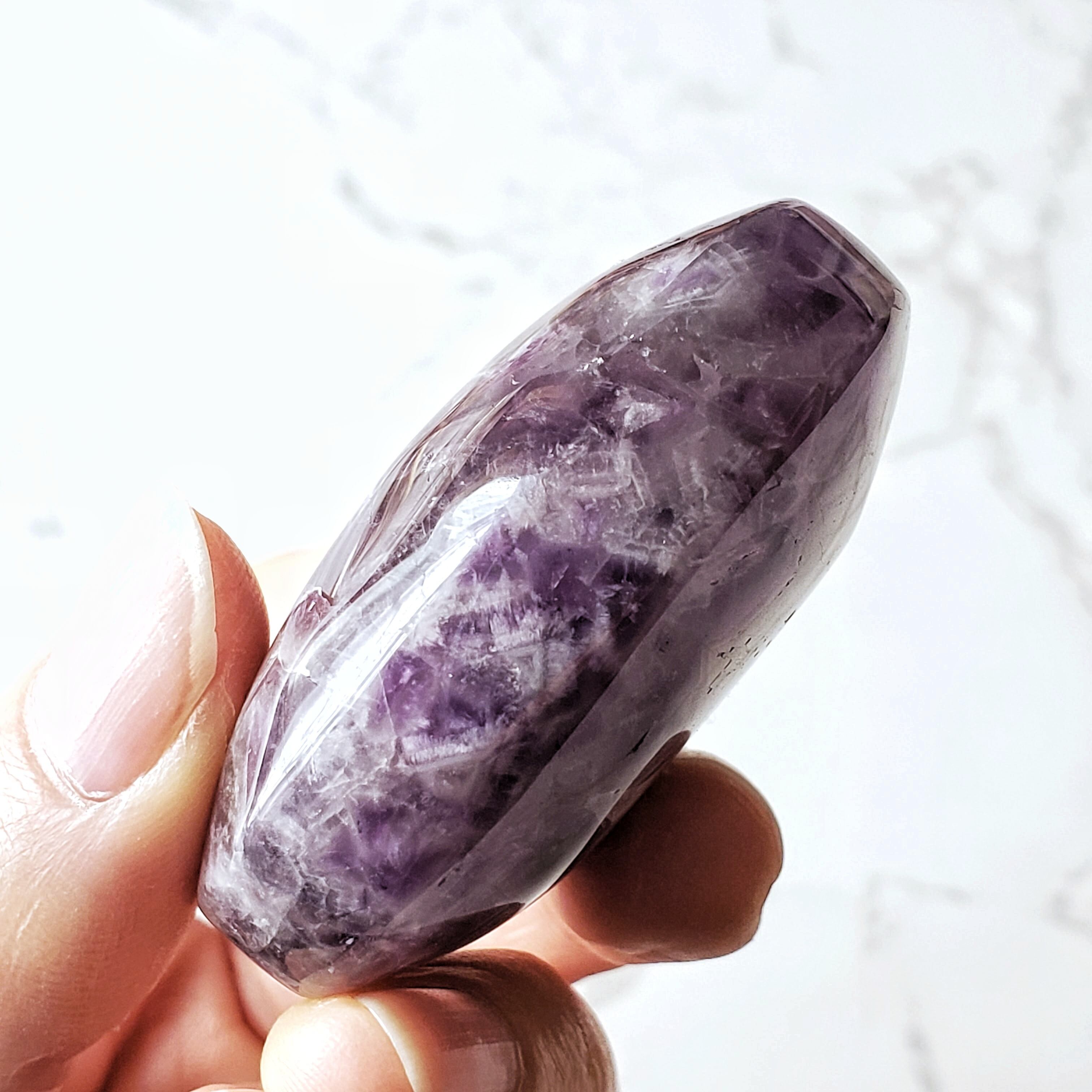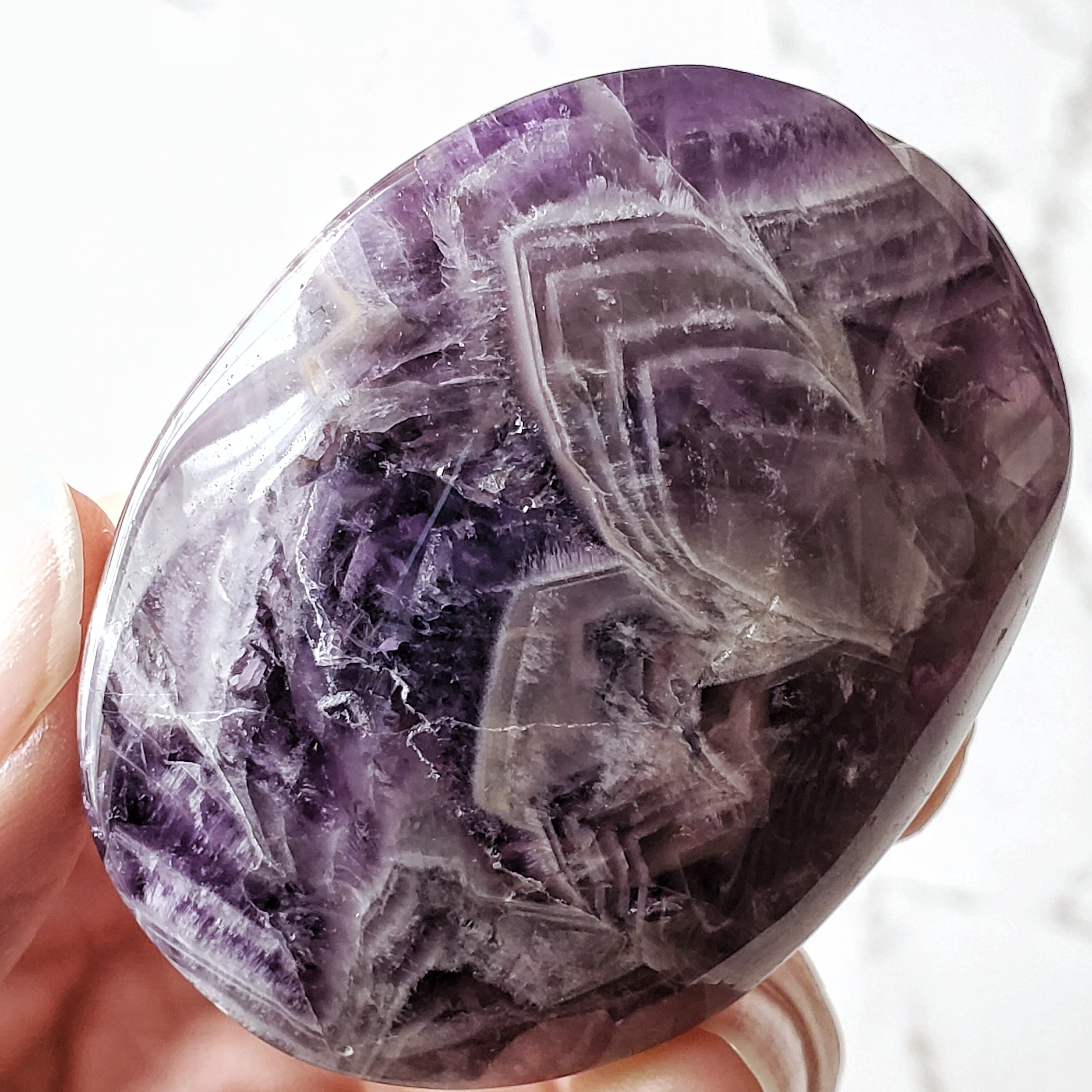 紫色のアメジストとミルキークォーツが重なり合い、縞模様が特徴的なクリスタルです。