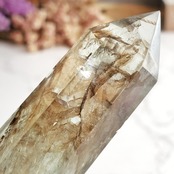 透明度の高い淡いグリーンのフローライトにひらひらした茶色の内包物が入ったお洒落なタワーです。