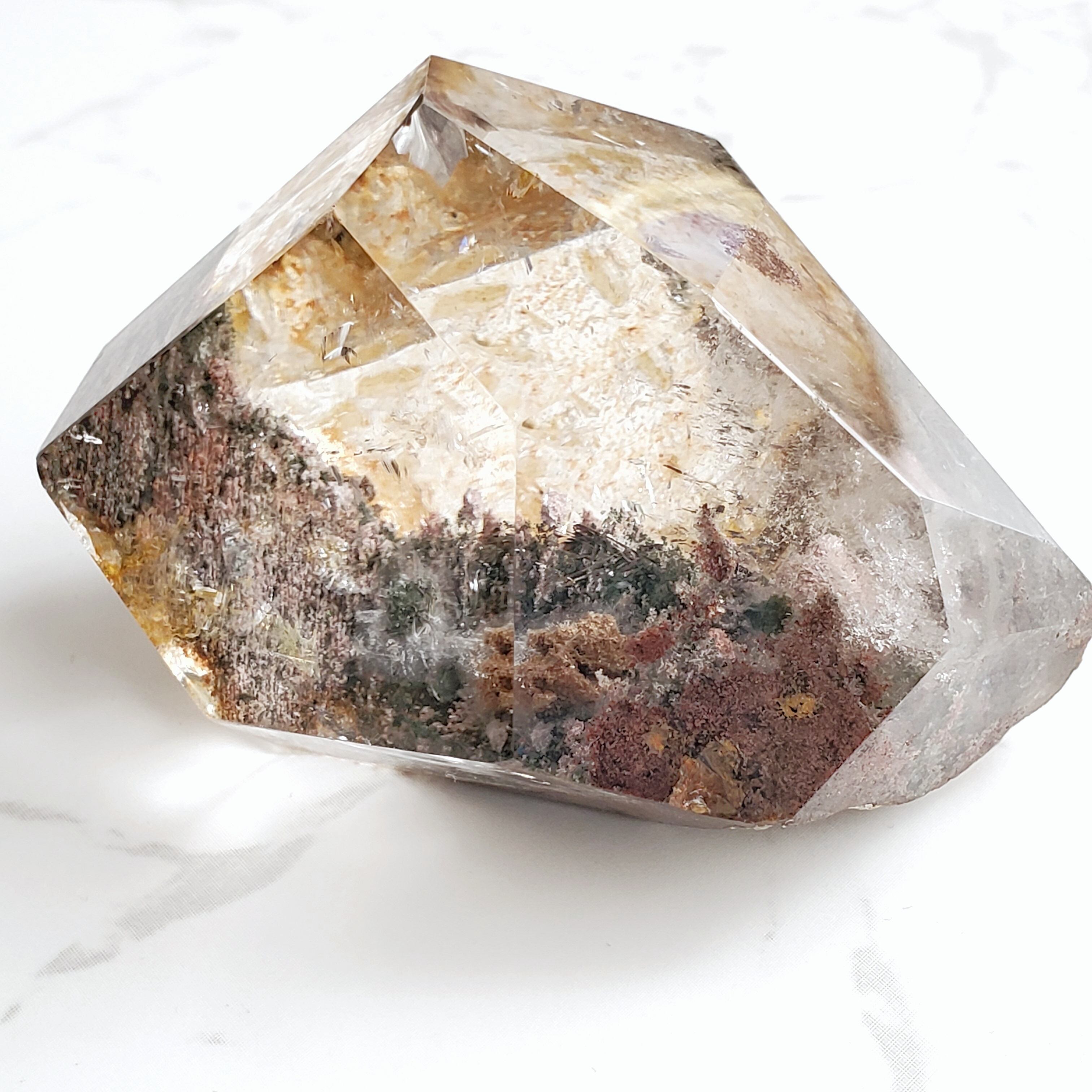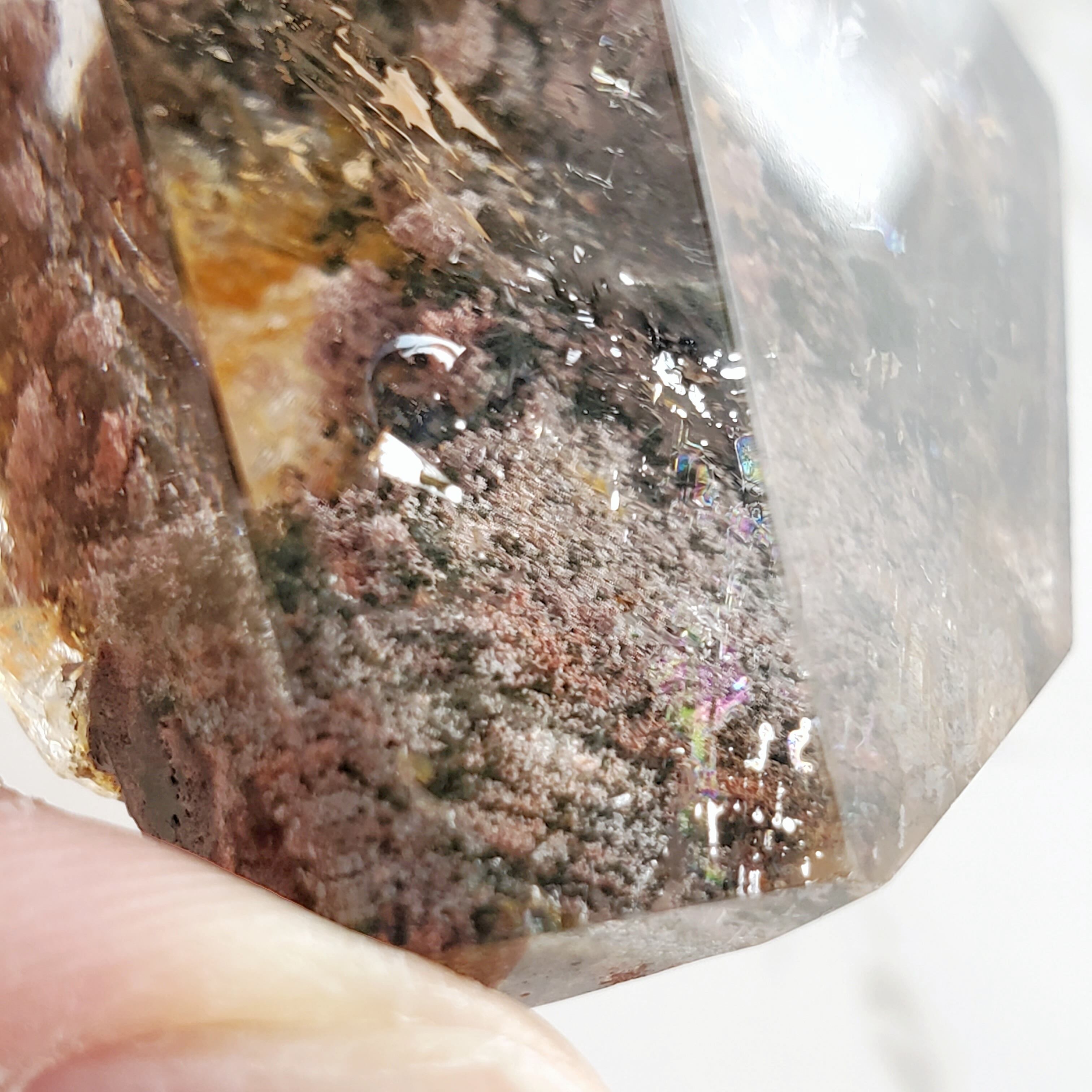 虹がきらきら輝く透明度の高い水晶の中に、ピンクやパープルの混じった千層ガーデンが見られます。