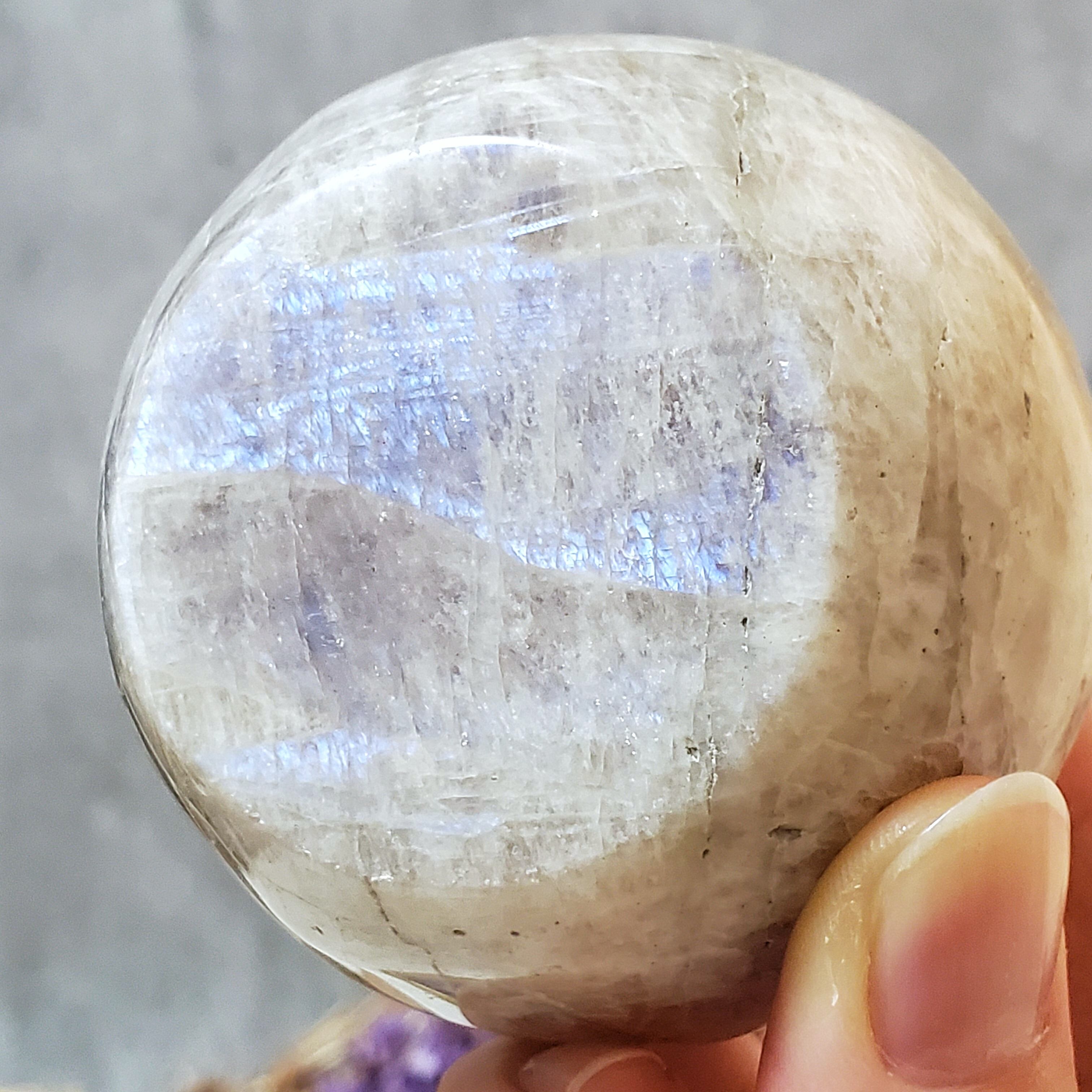 サンストーンが持つ虹色のラメのような輝き、アベンチュレッセンス効果と、ムーンストーンが持つ神秘的な青いシラーの両方が見られます。