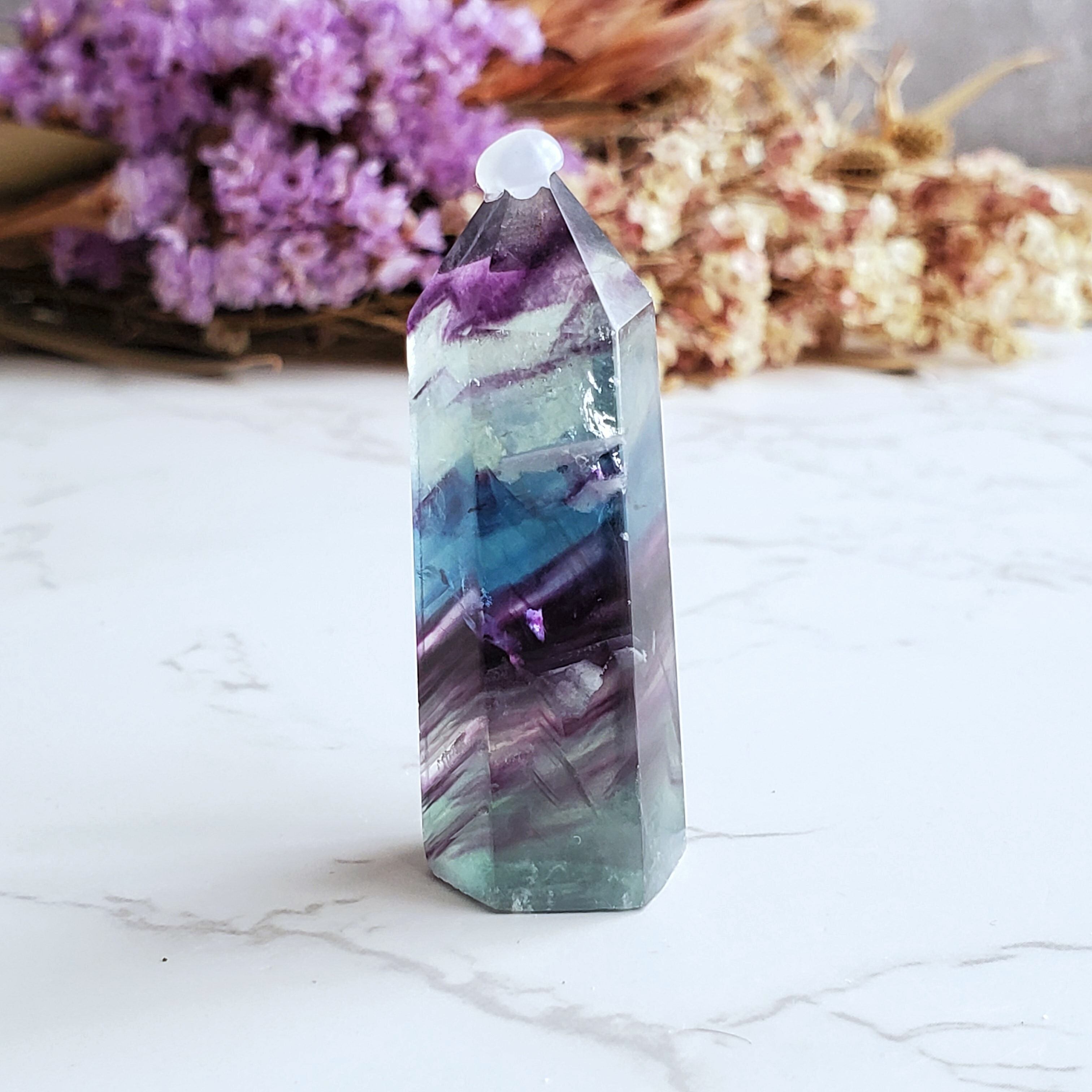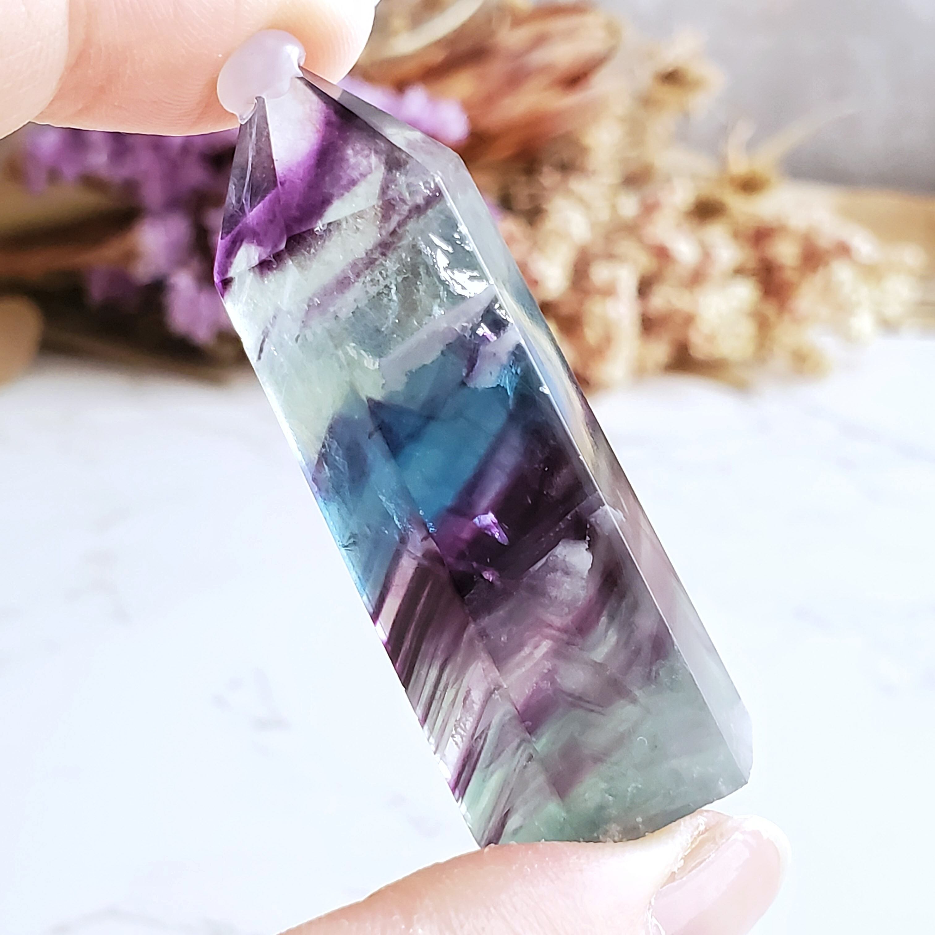 グリーン、パープル、ブルーの縞が美しいレインボーフローライトのミニポイントです。