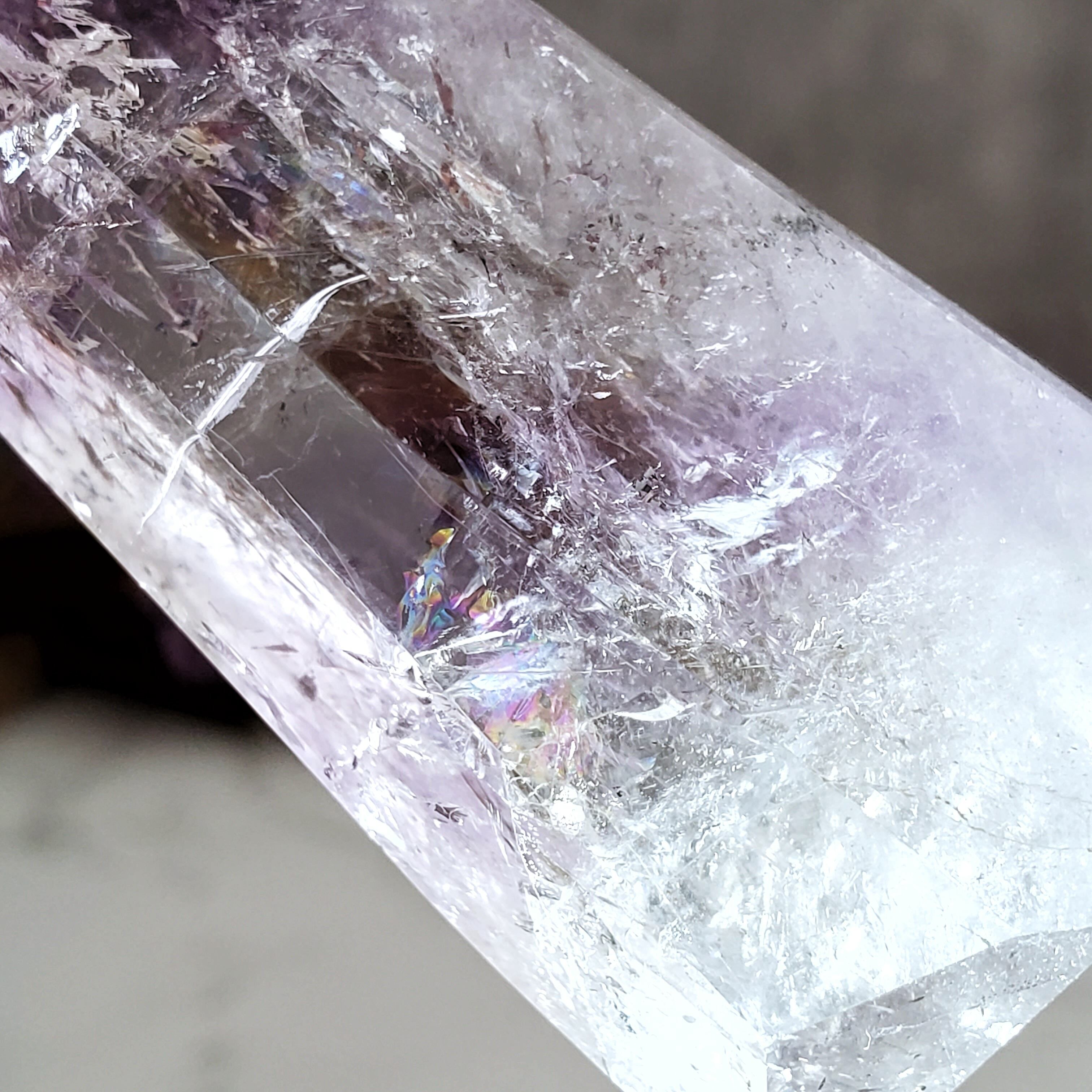 透明感が良く、クラックに輝く虹が美しいアメジストタワーです。