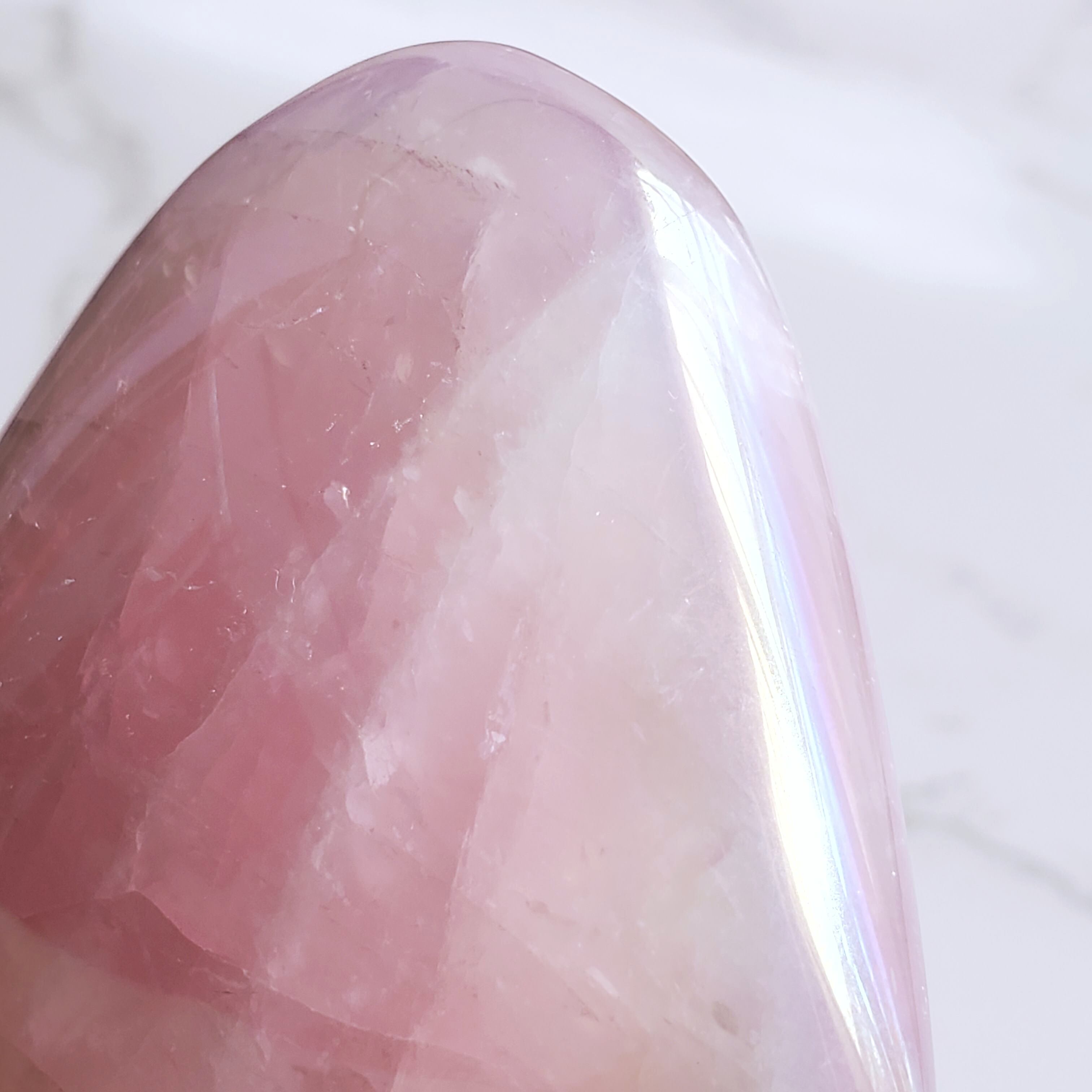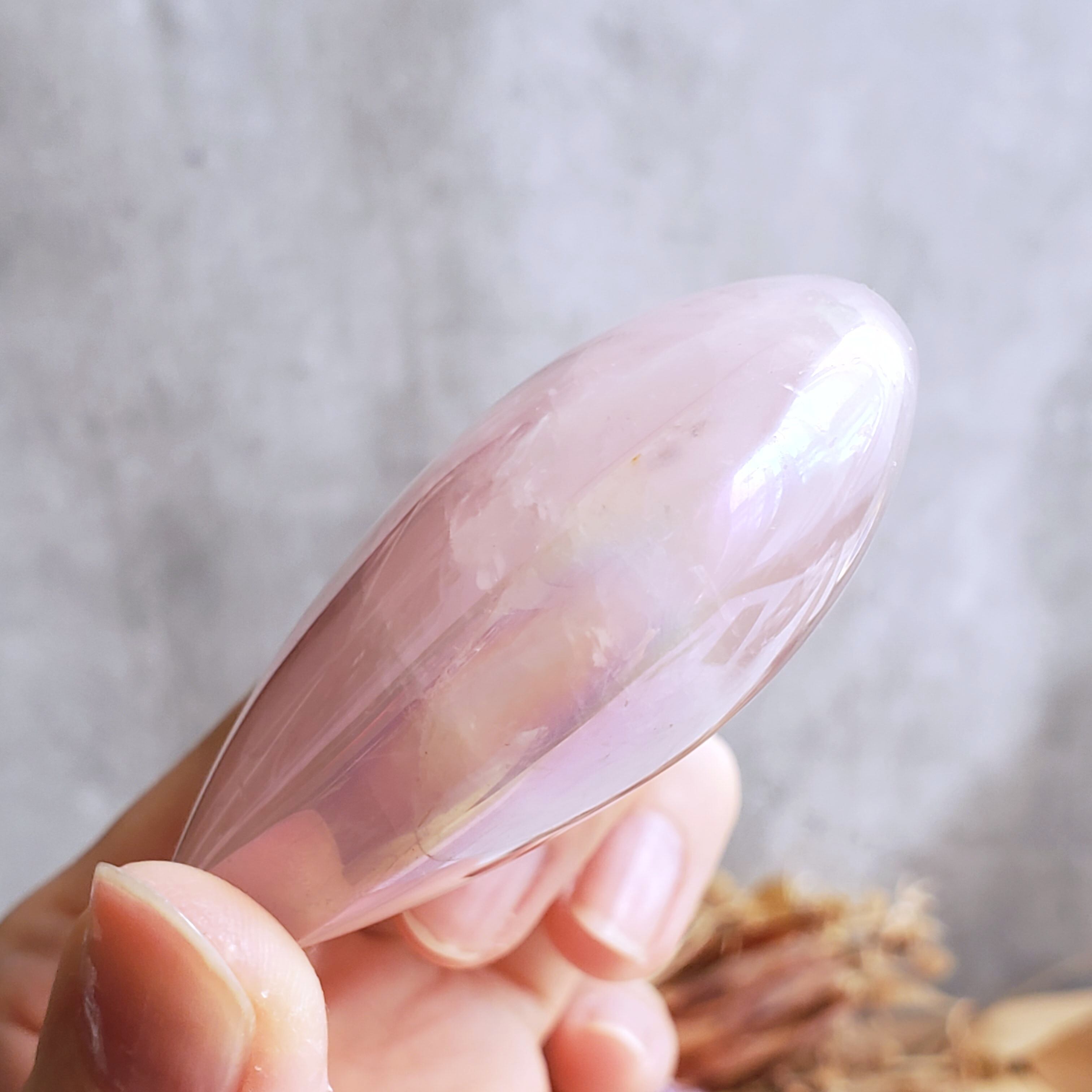 エンジェルオーラ加工したローズクォーツのハートです。角度によって変わるきらめきをお楽しみください(*^^*)