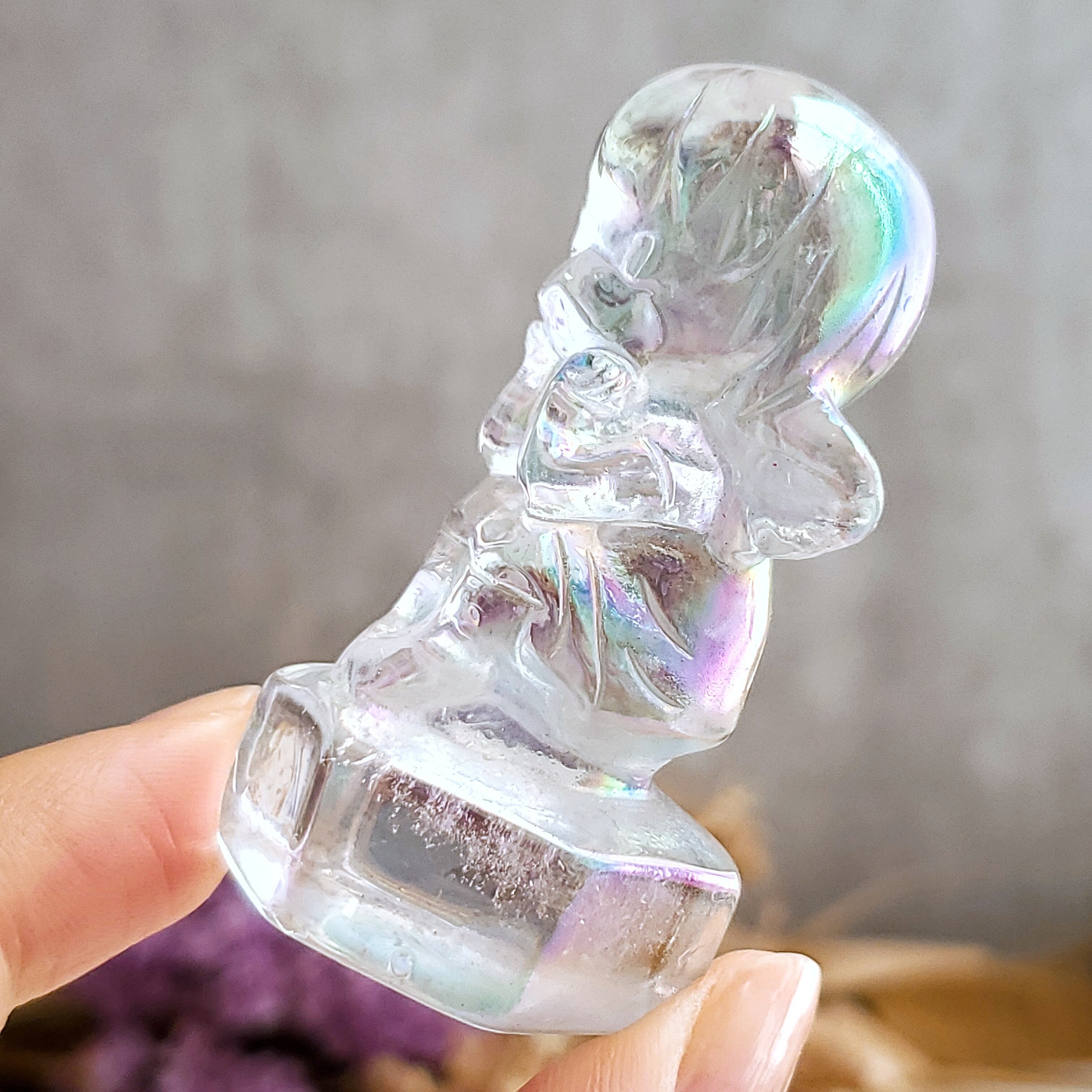 エンジェルオーラは、高温に加熱した水晶にイオン化したチタンとプラチナを真空蒸着させるという錬金術的な手法を用いて生み出された、自然と科学の融合とも言えるクリスタルです。