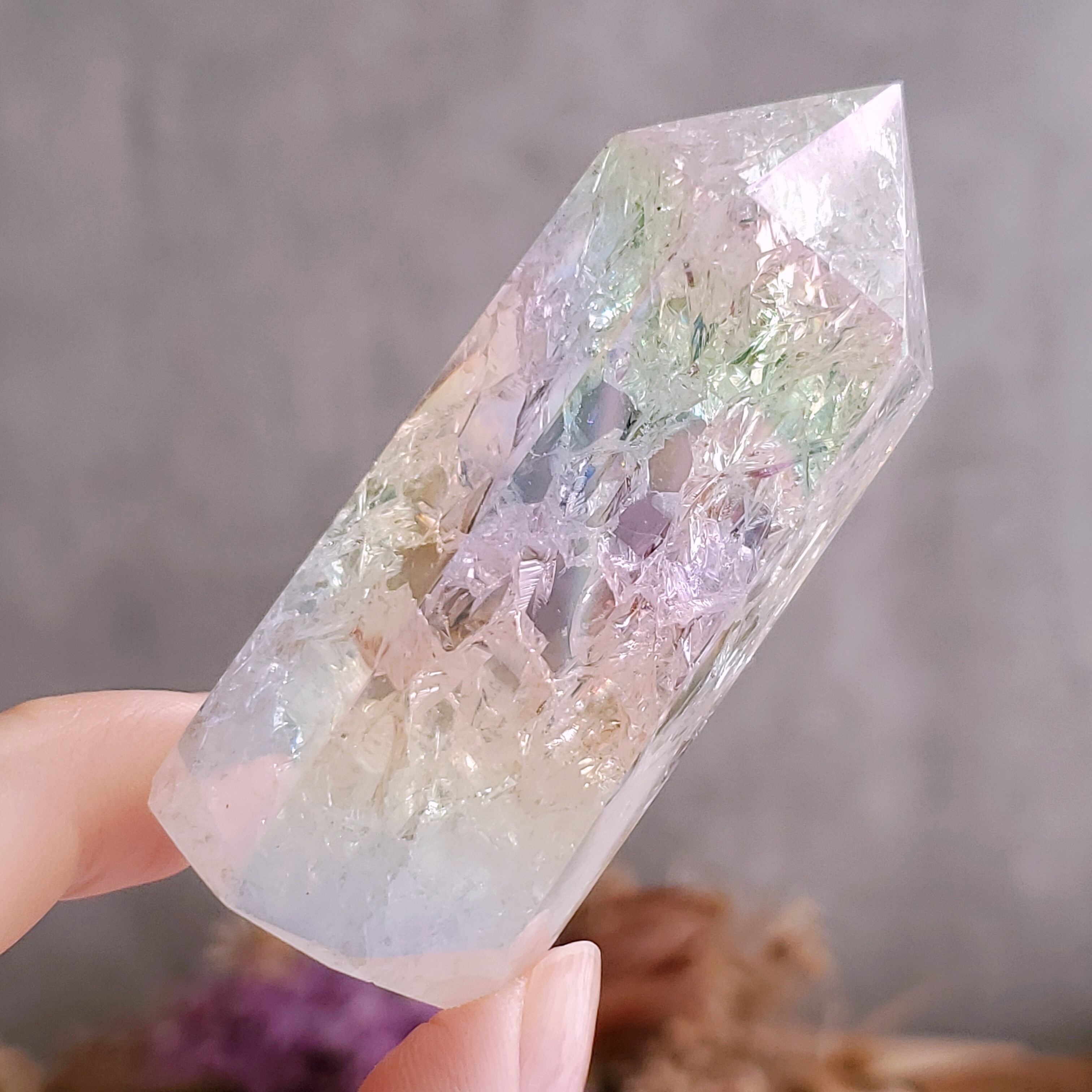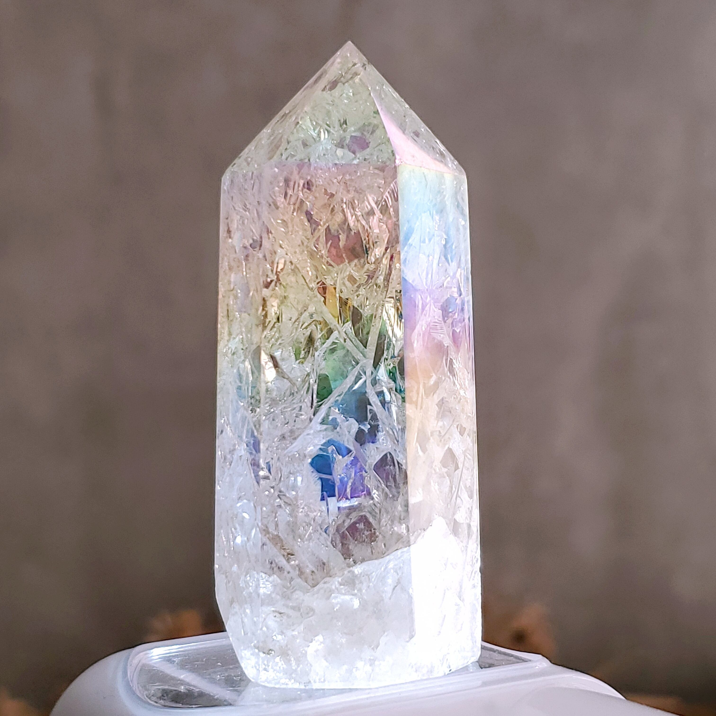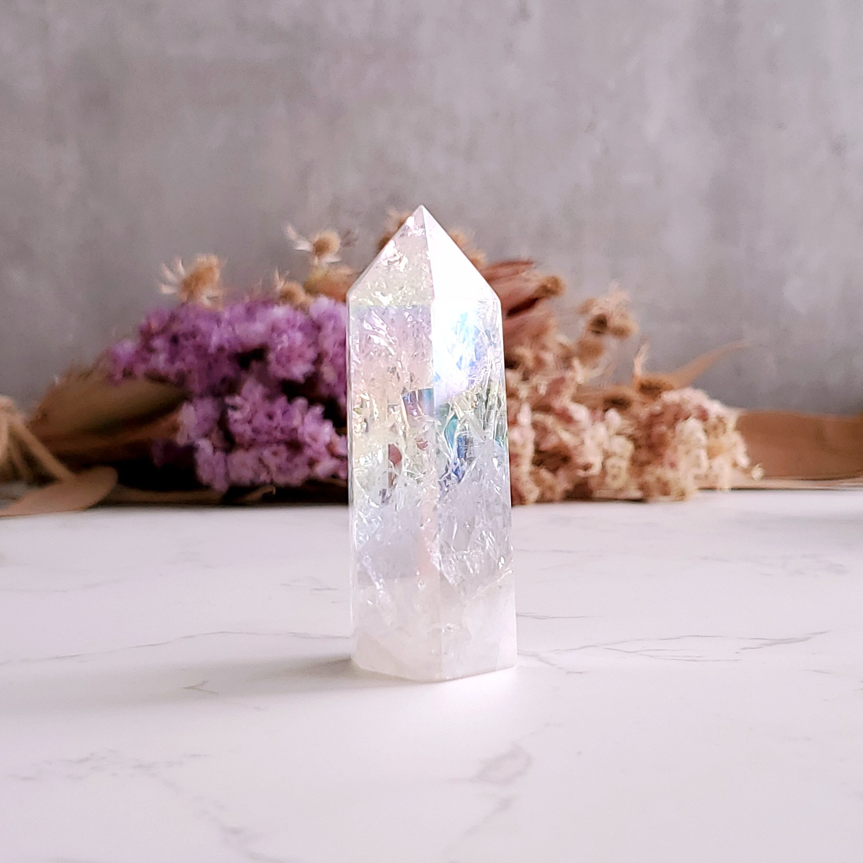 人工的に入れられたクラックにオーラ加工がキラキラと輝くとっても綺麗な水晶タワーです♡