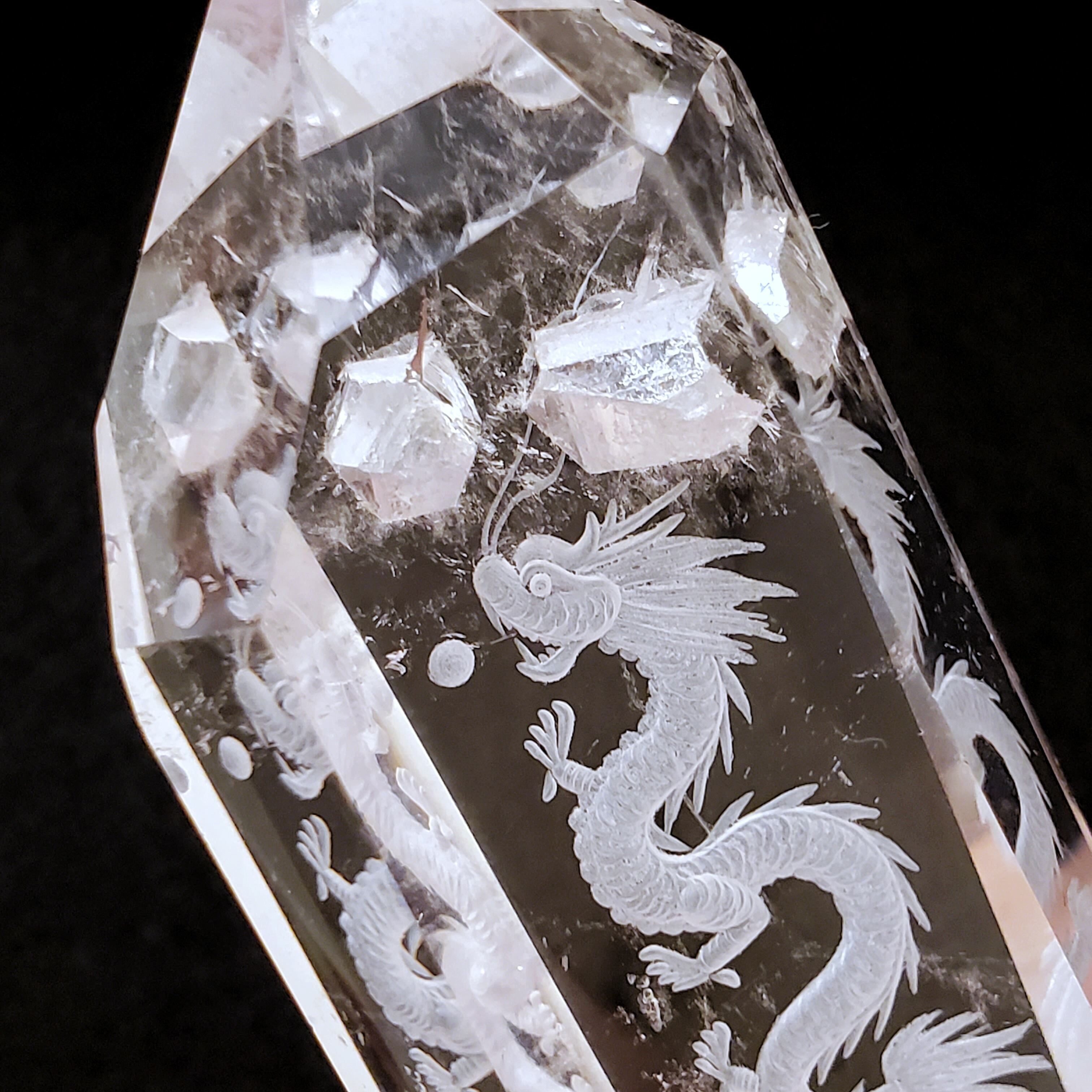 ポコポコと大きめの粒が見られる貫入水晶のタワーに美しい龍が手彫りしてあります。