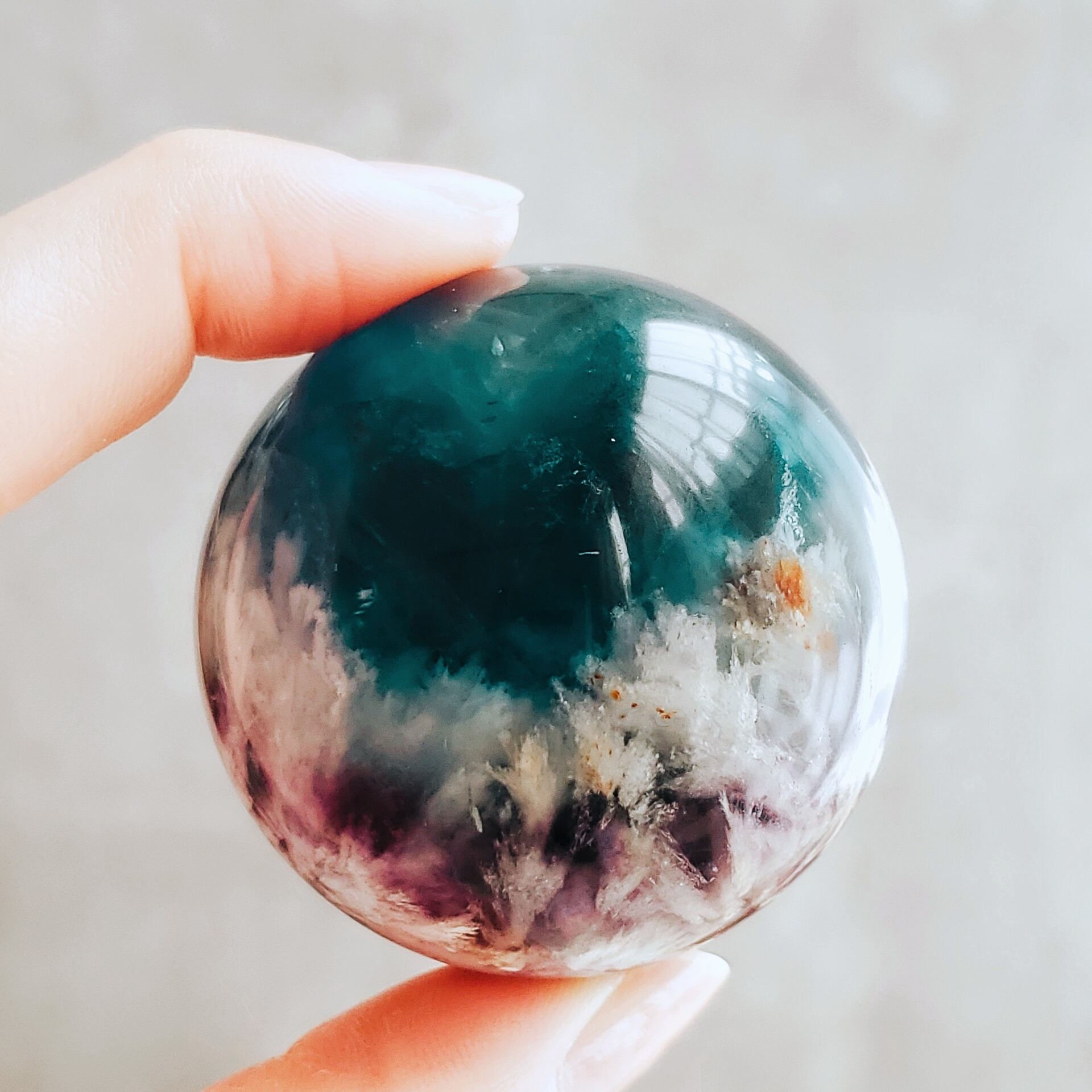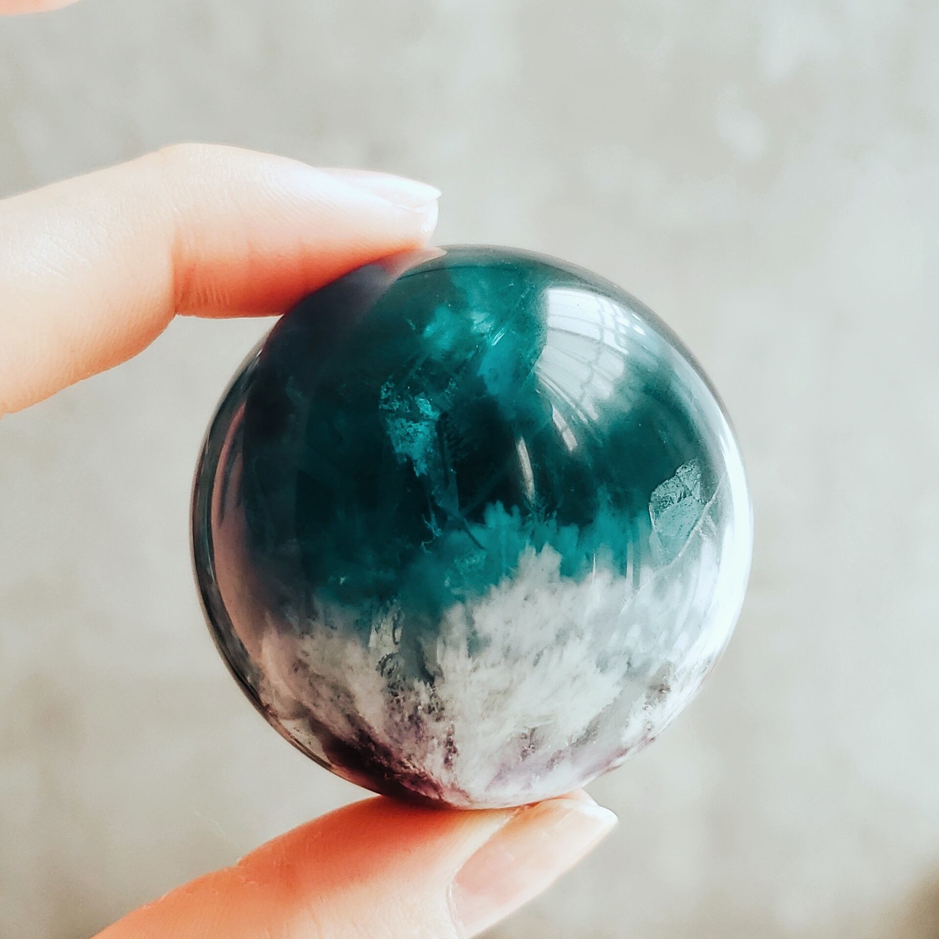 深みのあるブルーグリーンとパープルに白い羽根がたっぷり入った美しいスフィアです。