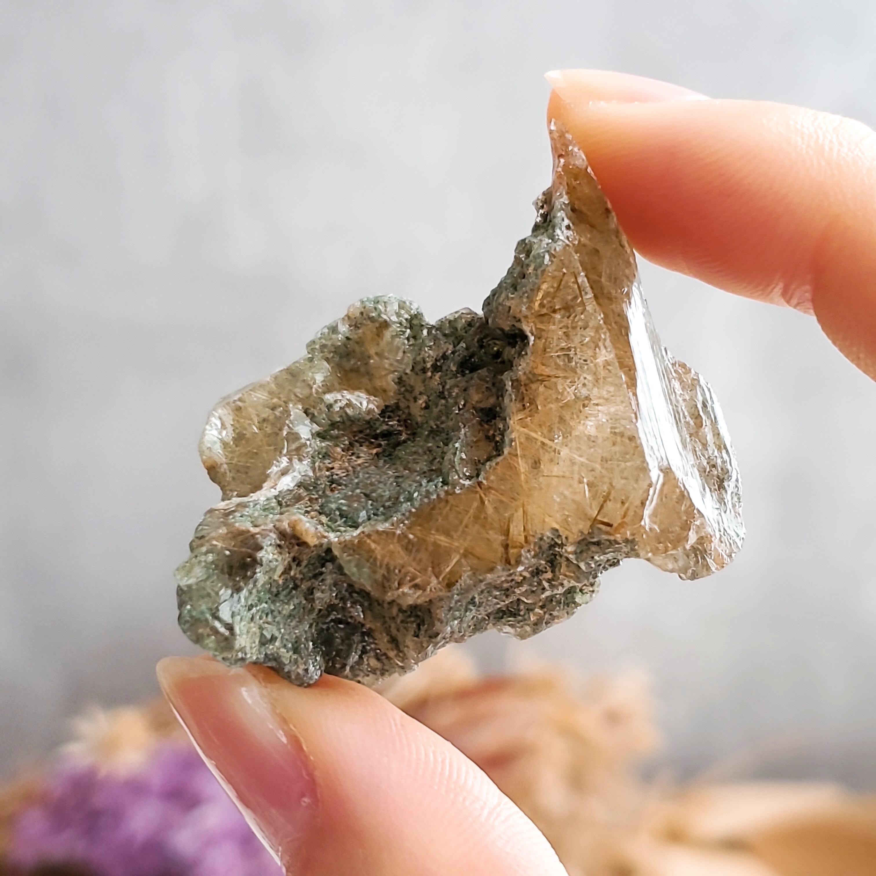 表面はクローライトに覆われ、中にはゴールドルチルが詰まっているマニハール産のルチルクォーツです。