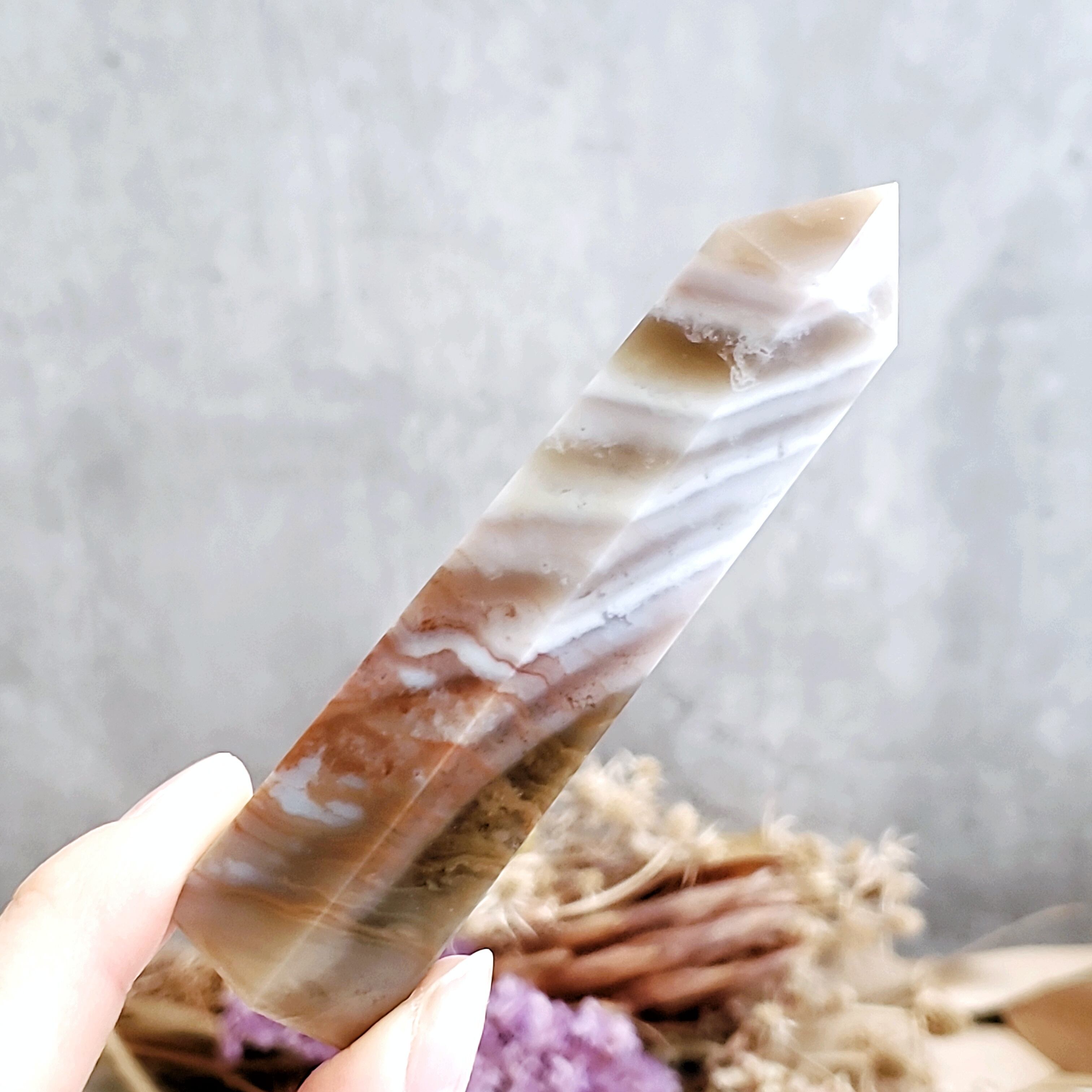 柔らかなお色味のアゲートで、縞模様が素敵なタワーです。
