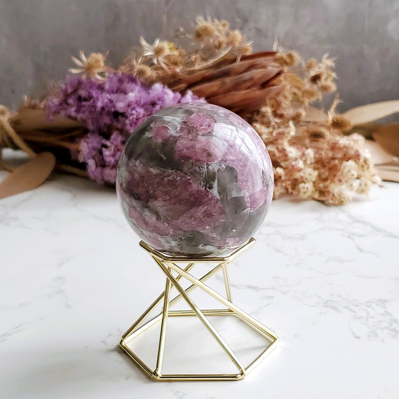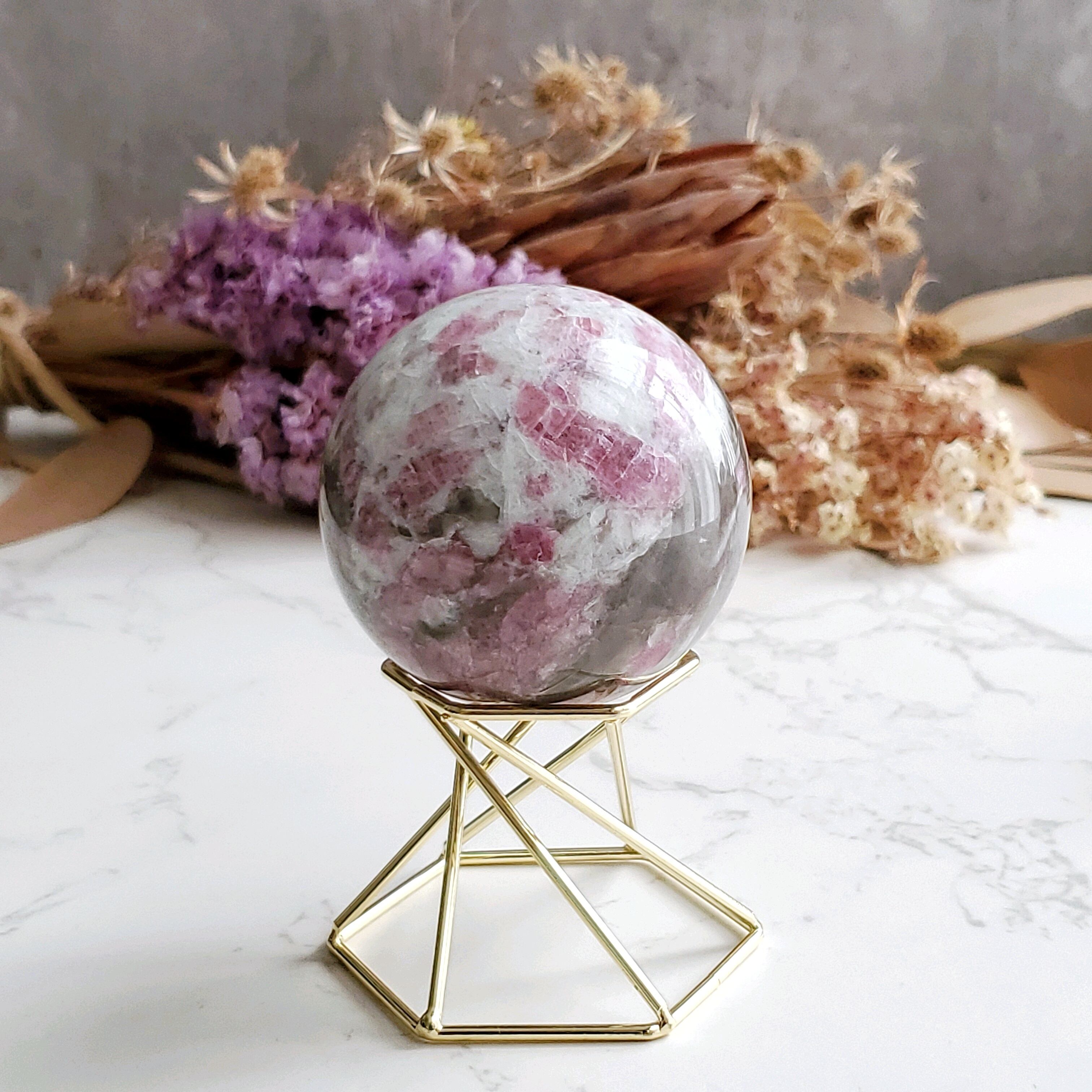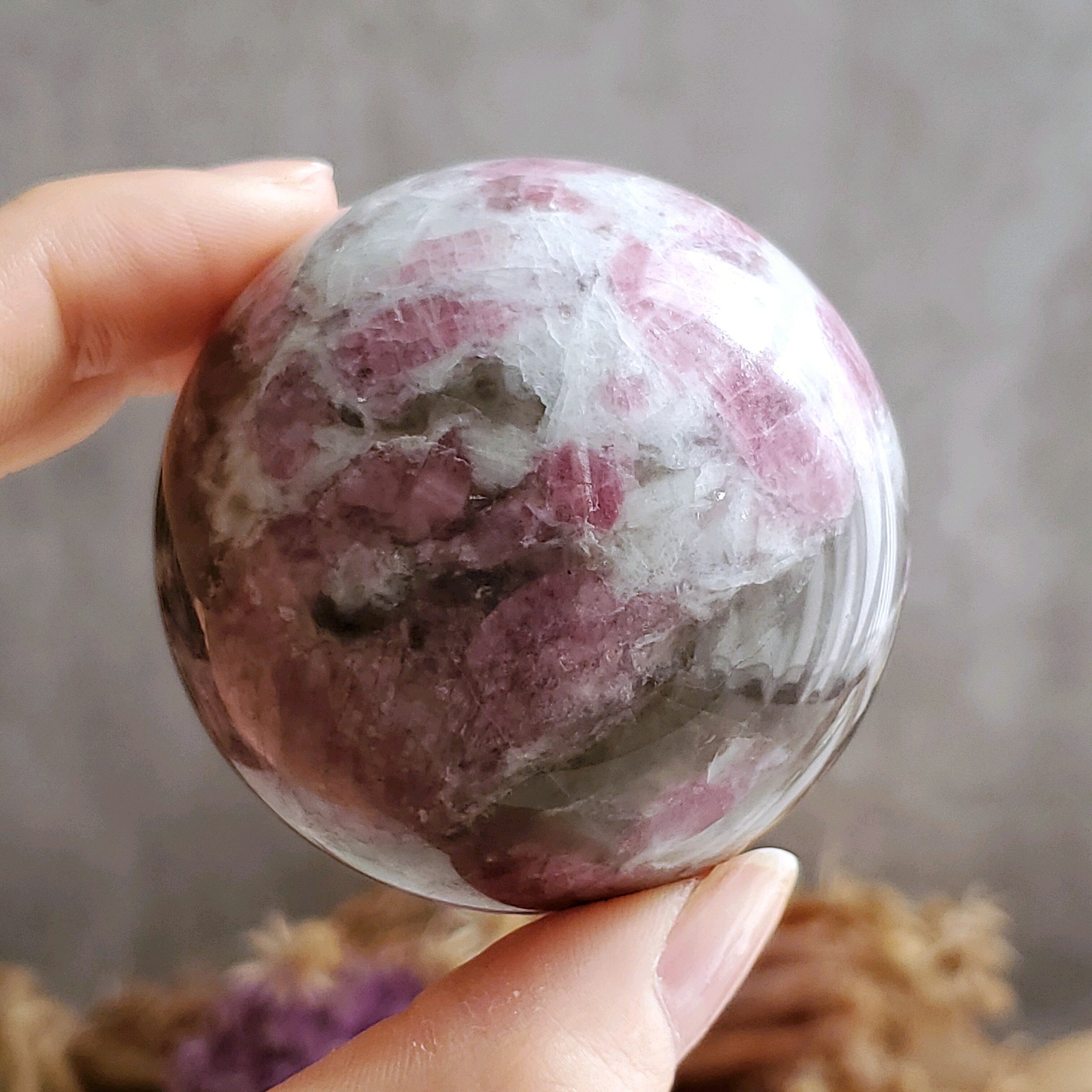 白いクォーツとスモーキークォーツに濃いめのローズピンクなトルマリンがそれぞれ映える大人っぽいスフィアです。飾る角度によって変わる表情をお楽しみください(*^^*)