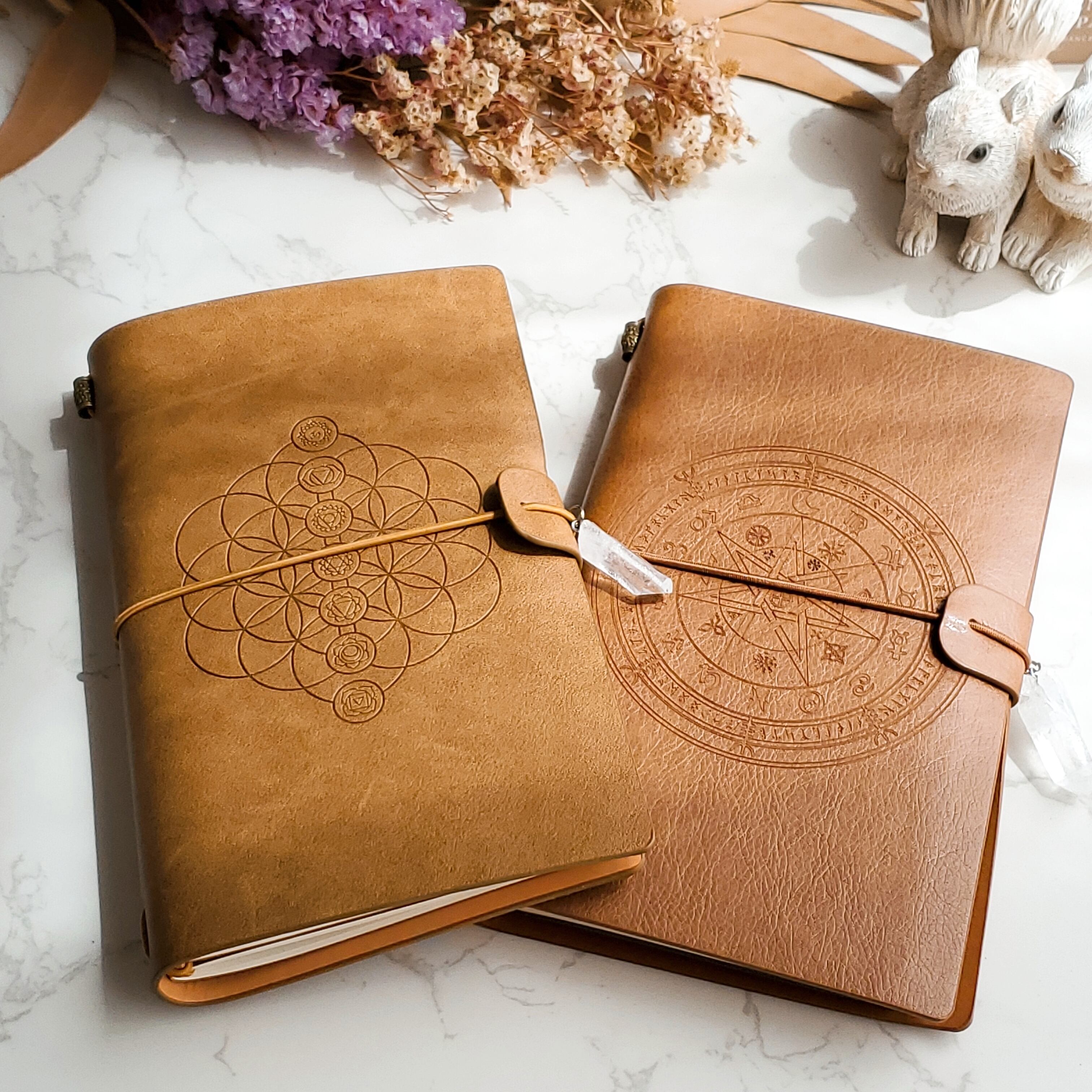 フラワーオブライフ、ホロスコープの刻印を表紙にあしらった手帳型ノートです。思いつきメモやノートワークにぜひご活用ください(*^^*)