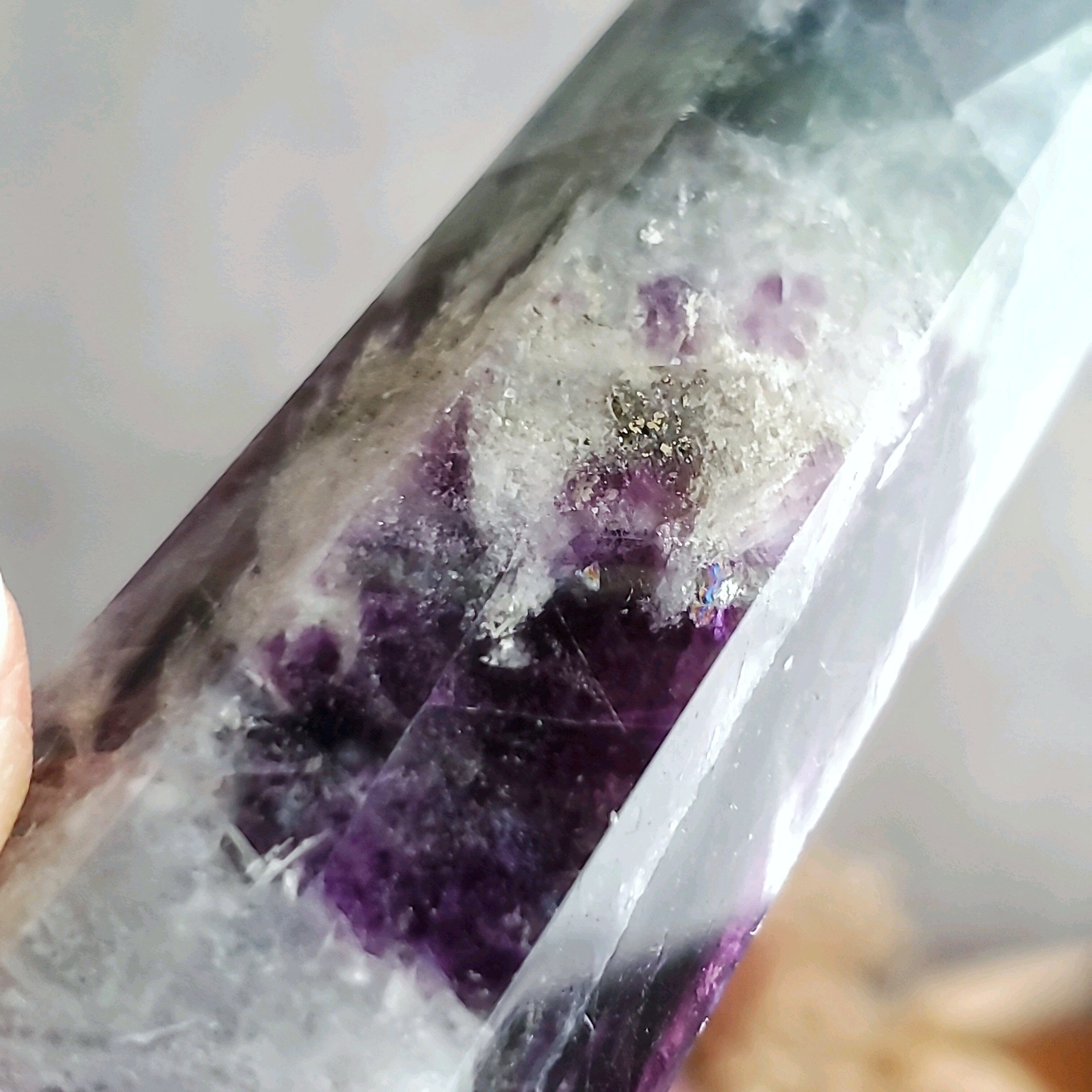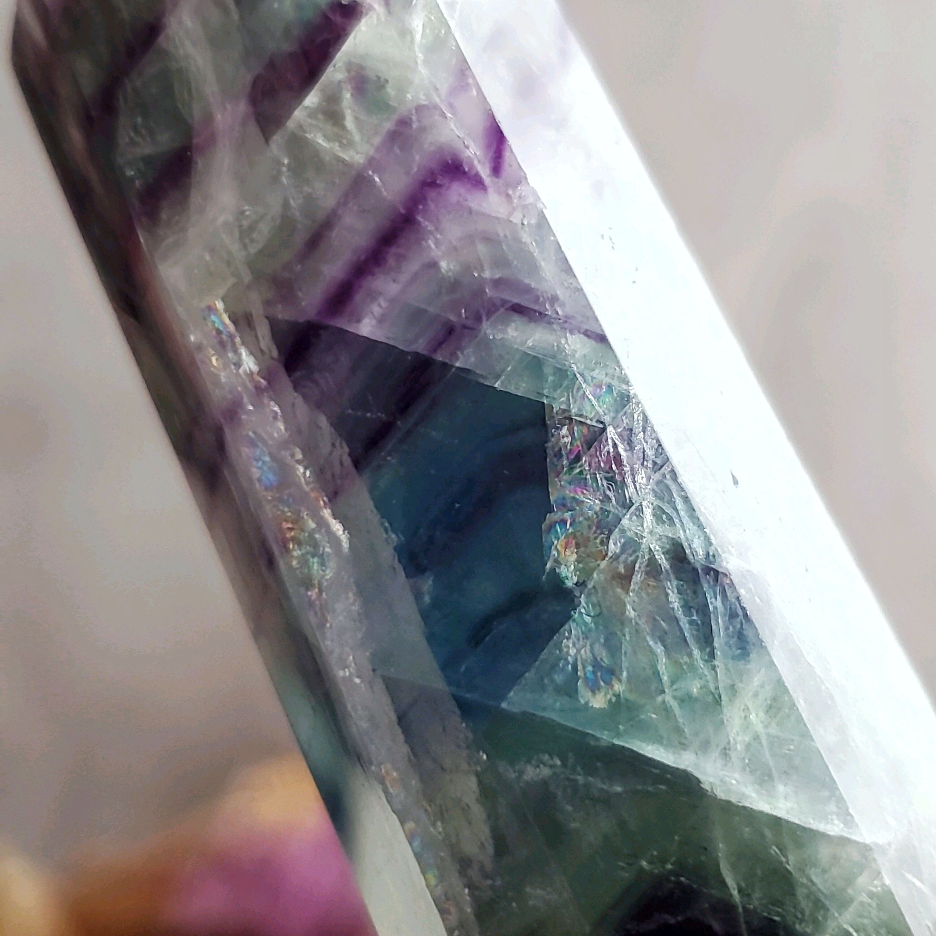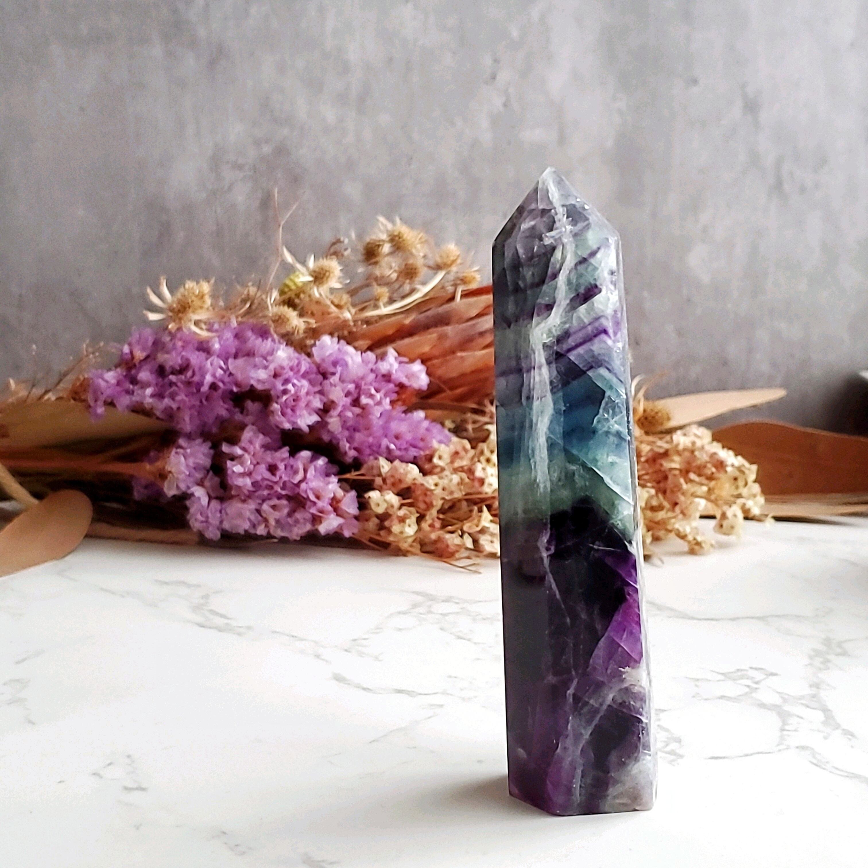 濃いめのパープルが美しいフェザーフローライトのタワーです。