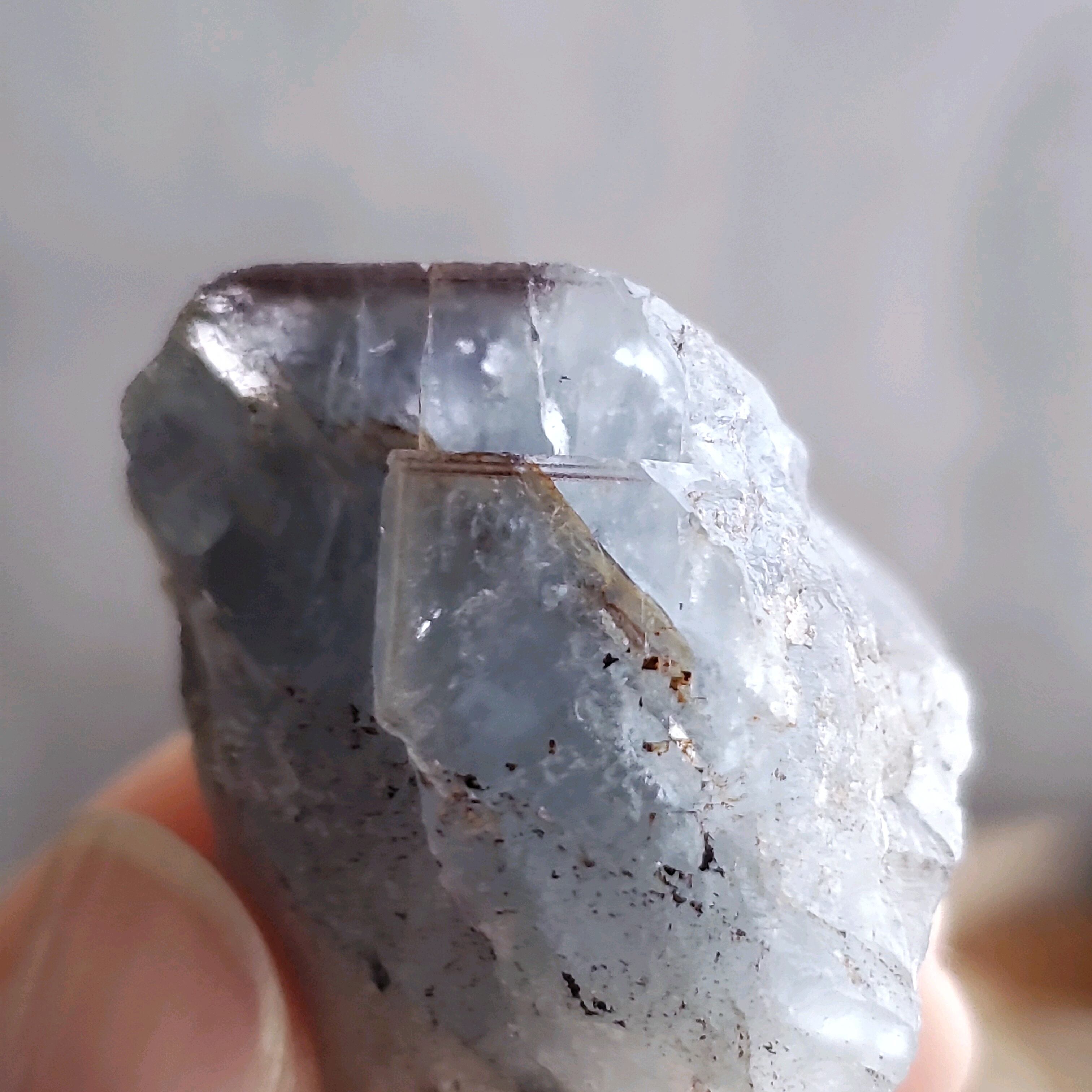 ミルキーな淡いブルーのグラデーションが美しい子です。階段状のキューブ結晶の様子も見られます。