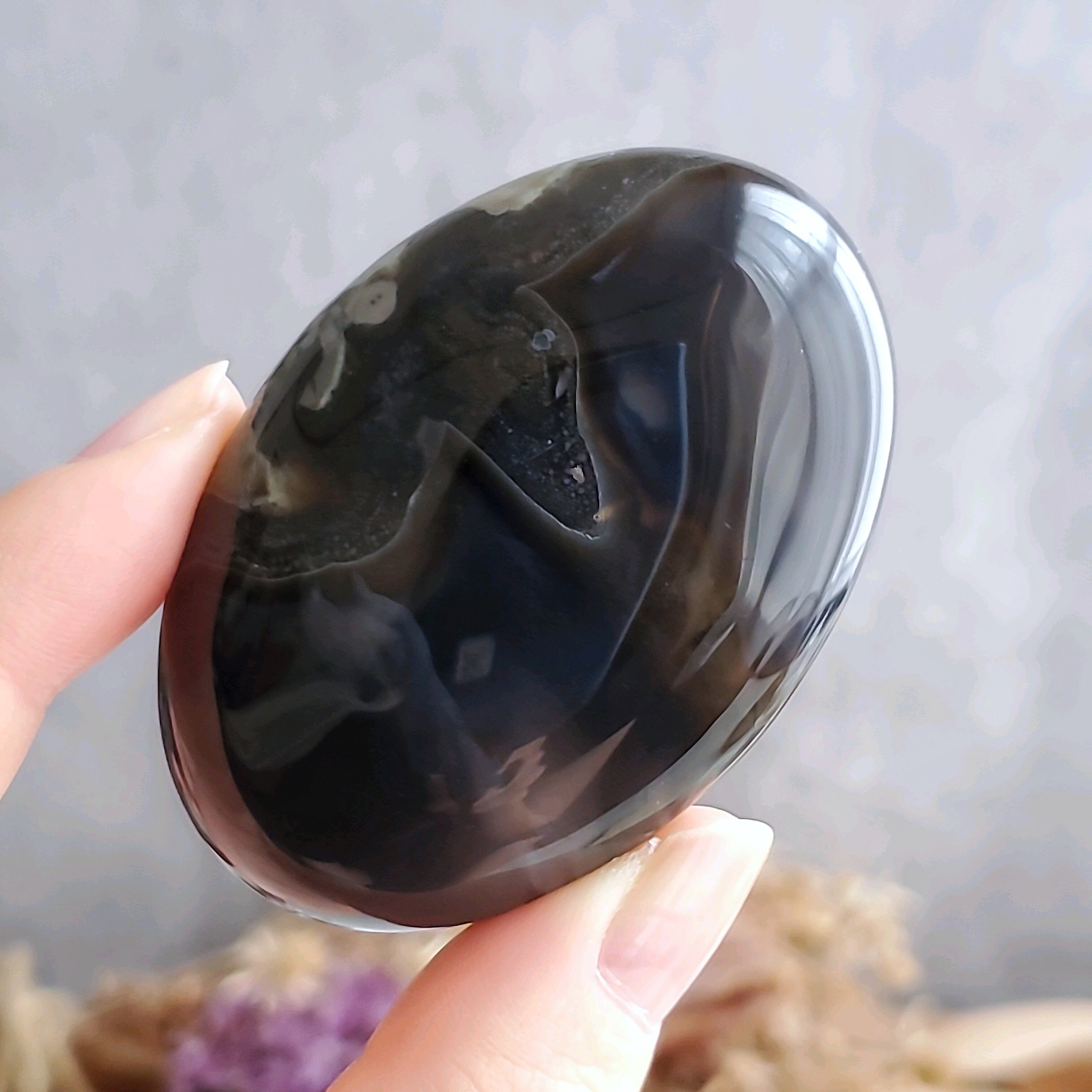 ボルカニック(火山性の)という名を持つアゲートです。黒い部分がUVライトで緑色に蛍光するおもしろい特徴があります。(蛍光効果の有無は個体により異なります)