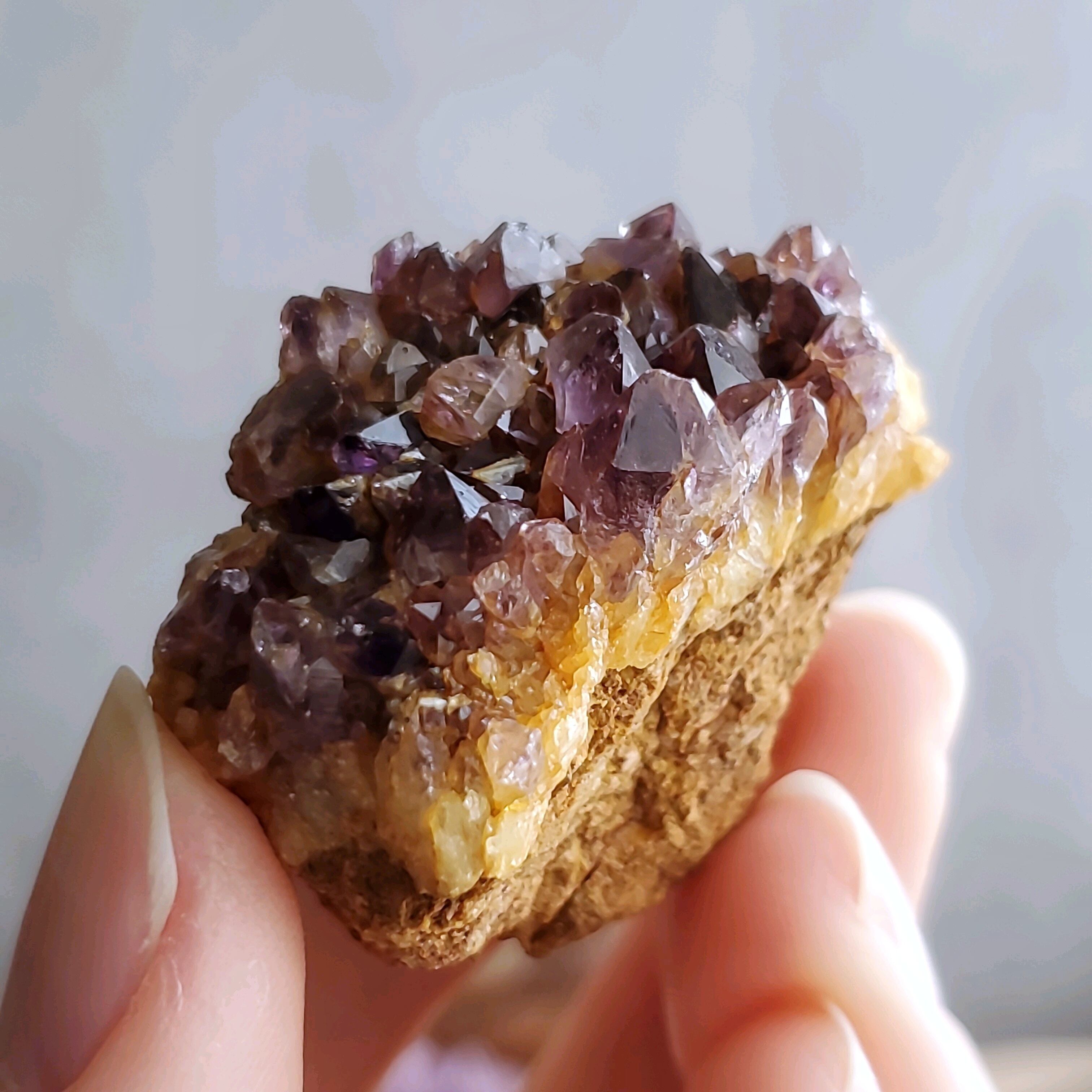 ワイルドな土色の母岩にダークカラーの結晶の色合いが個性的なアメジスト原石です。