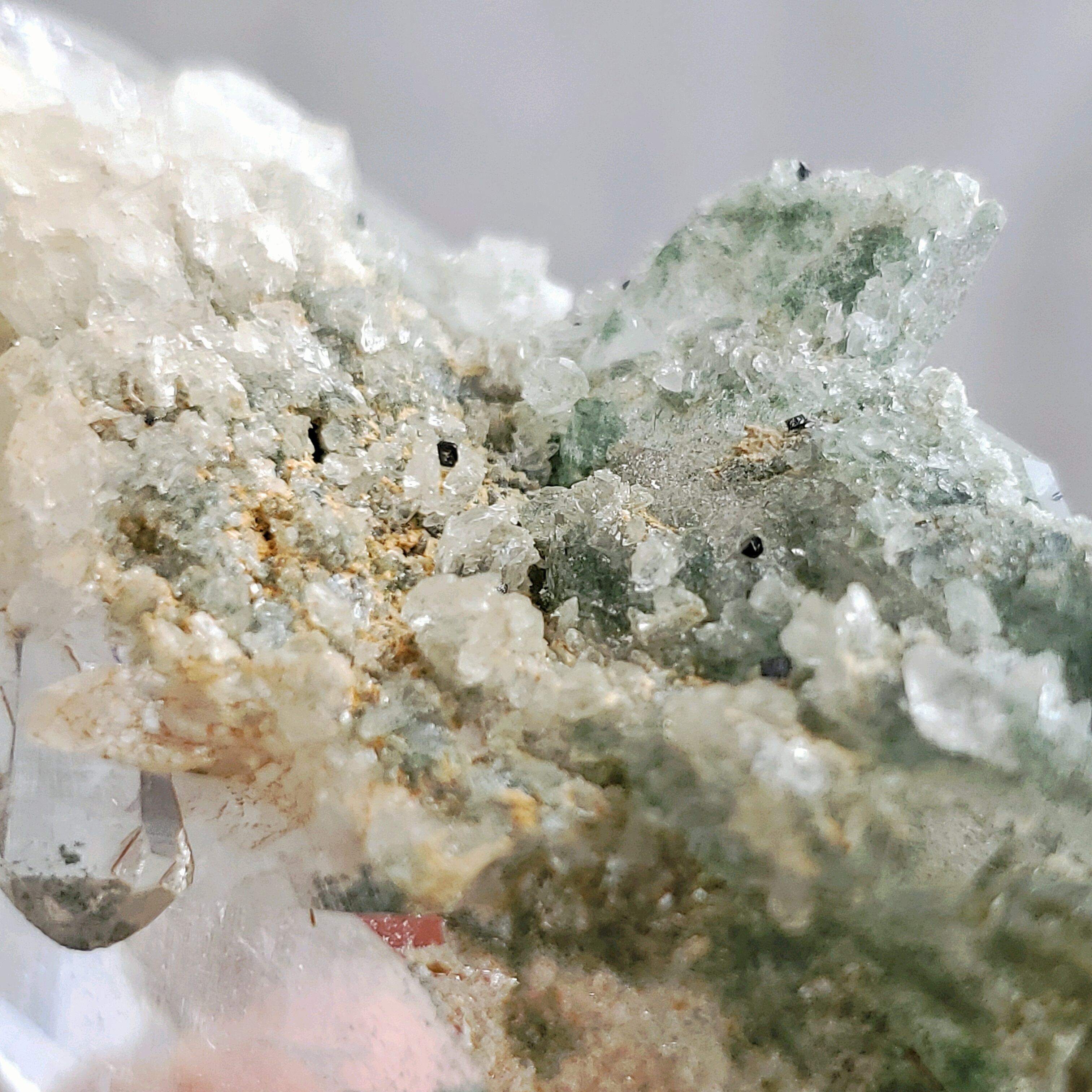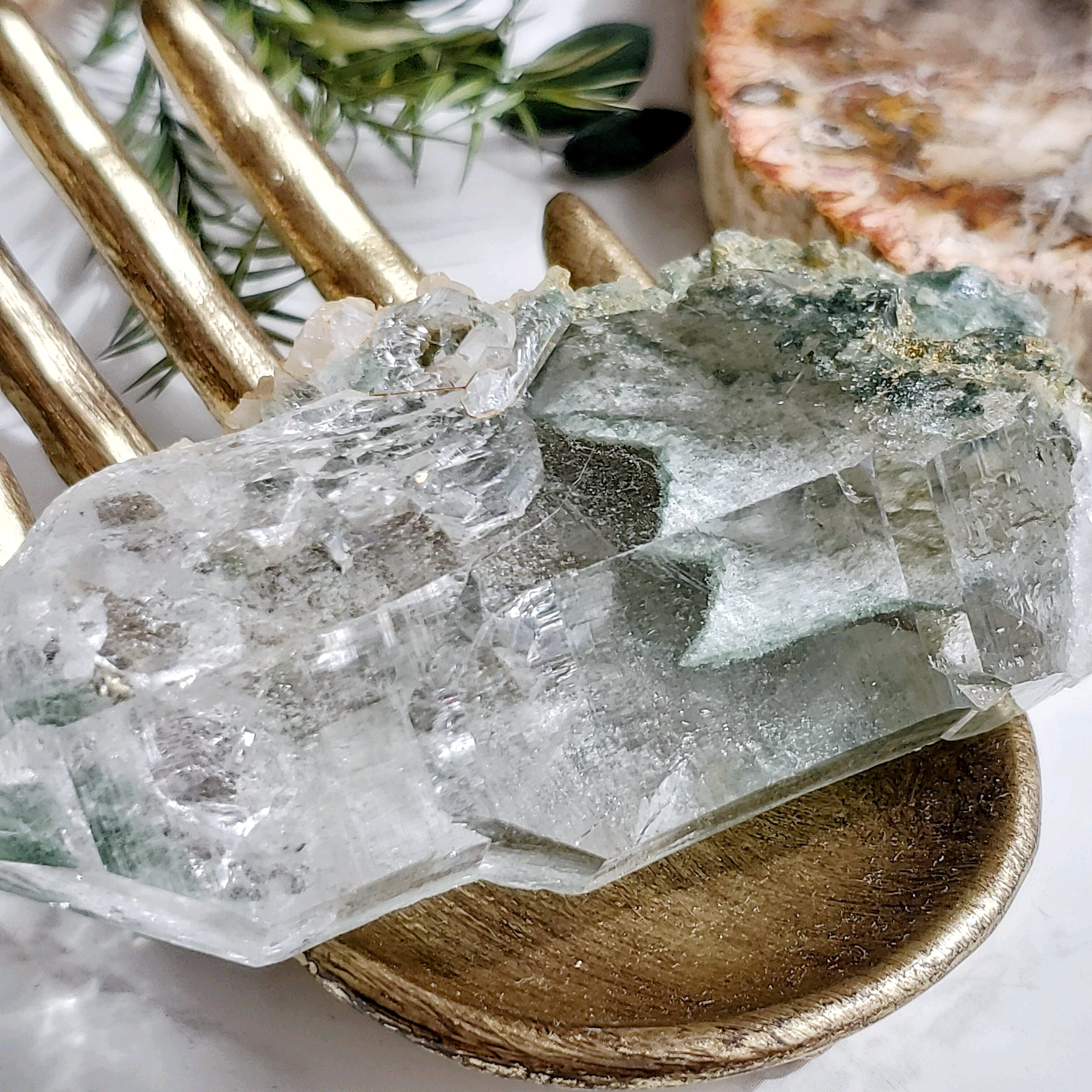 透明感のよい太めのポイントにクローライトなどが共生し、複雑で興味深い成長を遂げたピースです。